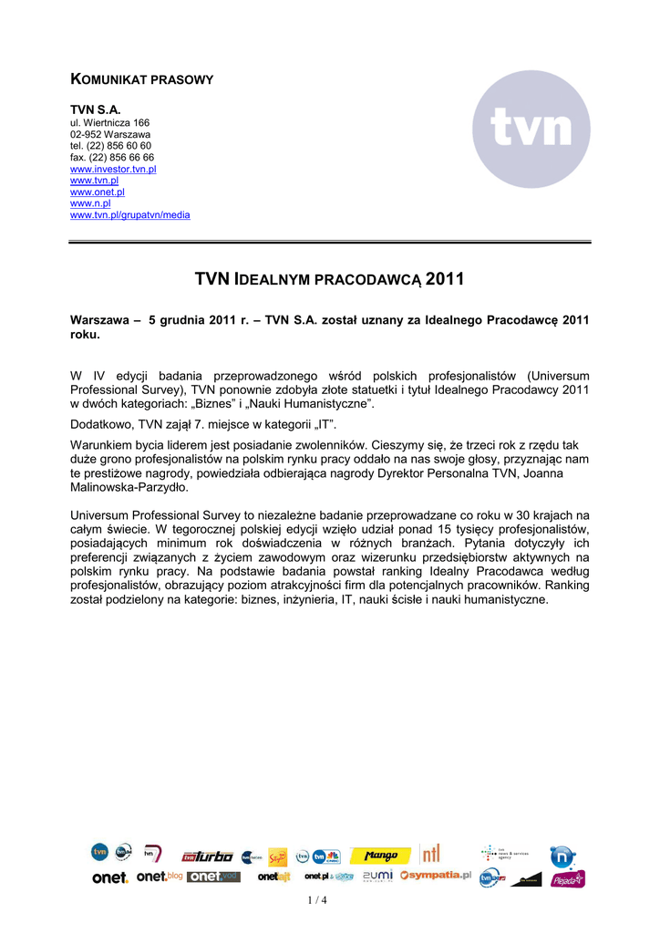 KOMUNIKAT PRASOWY TVN S.A. ul. Wiertnicza 166 02-952 Warszawa tel. (22) 856 60 60 fax. (22) 856 66 66 www.investor.tvn.pl www.tvn.pl www.onet.pl www.n.pl www.tvn.pl/grupatvn/media TVN IDEALNYM PRACODAWCĄ 2011 Warszawa – 5 grudnia 2011 r. – TVN S.A. został uznany za Idealnego Pracodawcę 2011 roku. W IV edycji badania przeprowadzonego wśród polskich profesjonalistów (Universum Professional Survey), TVN ponownie zdobyła złote statuetki i tytuł Idealnego Pracodawcy 2011 w dwóch kategoriach: „Biznes” i „Nauki Humanistyczne”. Dodatkowo, TVN zajął 7. miejsce w kategorii „IT”. Warunkiem bycia liderem jest posiadanie zwolenników. Cieszymy się, że trzeci rok z rzędu tak duże grono profesjonalistów na polskim rynku pracy oddało na nas swoje głosy, przyznając nam te prestiżowe nagrody, powiedziała odbierająca nagrody Dyrektor Personalna TVN, Joanna Malinowska-Parzydło. Universum Professional Survey to niezależne badanie przeprowadzane co roku w 30 krajach na całym świecie. W tegorocznej polskiej edycji wzięło udział ponad 15 tysięcy profesjonalistów, posiadających minimum rok doświadczenia w różnych branżach. Pytania dotyczyły ich preferencji związanych z życiem zawodowym oraz wizerunku przedsiębiorstw aktywnych na polskim rynku pracy. Na podstawie badania powstał ranking Idealny Pracodawca według profesjonalistów, obrazujący poziom atrakcyjności firm dla potencjalnych pracowników. Ranking został podzielony na kategorie: biznes, inżynieria, IT, nauki ścisłe i nauki humanistyczne. 1/4 *** Grupa TVN jest wiodącą prywatną grupą medialną w Polsce. Nadaje dziesięć kanałów telewizyjnych. TVN, główny kanał telewizyjny Grupy, jest na polskim rynku uznawany za czołowy program telewizyjny, oferujący wysokiej jakości programy rozrywkowe oraz rzetelne i niezależne audycje informacyjne. TVN dociera do 91% gospodarstw domowych w Polsce. TVN7 to kanał telewizyjny o profilu filmowo-serialowym, uzupełniający ofertę programową TVN. Kanał dociera do 64% gospodarstw domowych w Polsce. TVN24 jest pierwszym polskim 24-godzinnym informacyjno-publicystycznym kanałem telewizyjnym docierającym do 58% gospodarstw domowych w Polsce. TVN CNBC jest kanałem informacyjnym o tematyce biznesowej, przygotowywanym we współpracy z CNBC Europe. Kanał dociera do 35% gospodarstw domowych w Polsce. TVN Meteo to pierwszy polski kanał telewizyjny o pogodzie, docierający do 55% gospodarstw domowych w Polsce. TVN Turbo jest pierwszym polskim kanałem tematycznym adresowanym do mężczyzn i zarazem pierwszym poświęconym głównie motoryzacji. Kanał dociera do 56% gospodarstw domowych. TVN Style jest kanałem telewizyjnym poświęconym urodzie, stylom życia, modzie oraz zdrowiu adresowanym do kobiet. Dociera do 56% gospodarstw domowych. ITVN jest kanałem telewizyjnym skierowanym do widowni pochodzenia polskiego zamieszkałej za granicą, dostępnym w Europie, Ameryce Północnej i w Australii. Telezakupy Mango to jedyny w Polsce całodobowy kanał telesprzedażowy, docierający do 58% gospodarstw domowych. NTL jest lokalnym kanałem telewizyjnym adresowanym do mieszkańców Radomska i okolic. Do Grupy TVN należy również TVN News & Services Agency, najbardziej wszechstronnie działająca agencja mediowa w Europie Środkowej i Wschodniej, która jako jedyna w regionie oferuje pełną kompleksowość usług. 2/4 Grupa TVN jest też właścicielem Onetu, który jest największym i najczęściej odwiedzanym medium internetowym w Polsce. Onetu jest liderem pod względem liczby użytkowników w głównych kategoriach tematycznych: biznes, finanse, prawo; informacje, publicystyka, media; sport; turystyka. Sukces w swoich kategoriach odnoszą również: OnetBlog – największa blogosfera w polskiej sieci. Sympatia.pl – najpopularniejszy w Polsce serwis towarzysko-randkowy. Zumi - nowe, niespotykane wcześniej na polskim rynku narzędzie, łączące cechy serwisów mapowych, nawigacyjnych i ogłoszeniowych. vod.onet.pl to najnowszy wspólny projekt Onetu, TVN i WarnerBros. Internetowy serwis „wideo na życzenie” umożliwia oglądanie za pomocą przeglądarki internetowej polskich i zagranicznych seriali, programów telewizyjnych oraz pełnometrażowych filmów fabularnych. plejada.pl - multimedialny serwis internetowy poświęcony informacjom ze świata show-biznesu. Plejada.pl jest pierwszym na polskim rynku projektem, dostępnym od razu na trzech platformach - w internecie, w telefonach komórkowych (wersja lajt) oraz na platformie „n”. Do Grupy TVN należy również: tvn24.pl - pierwszy w Polsce wortal informacyjny, który łączy w sobie tekst, dźwięk i obraz. Znajdują się w nim rozbudowane relacje wideo z najważniejszych wydarzeń w Polsce i na świecie. Serwis umożliwia również odpłatny odbiór kanału TVN24 oraz dostęp do informacji i materiałów, których nie było na antenie. tvnwarszawa.pl - projekt medialny poświęcony Warszawie i jej mieszkańcom. TVN Warszawa koncentrując się na życiu stolicy, oferuje wysokiej jakości treści o charakterze informacyjnym i rozrywkowym. Dostępny jest pod adresami: www.tvnwarszawa.pl oraz www.tvn.pl. 3/4 Grupa TVN jest też właścicielem telewizji nowej generacji „n”. Telewizja nowej generacji „n” została uruchomiona 12 października 2006 roku. Jest to pierwsza w Polsce i pierwsza w Europie środkowo - wschodniej platforma satelitarna, która umożliwia jednoczesny odbiór programów w technologii HD, nagrywanie wybranych pozycji programowych (PVR) oraz zapewnia dostęp do biblioteki filmów i programów na życzenie (VOD). Jako pierwsza platforma w Polsce uruchomiła regularną usługę 3D – nShow3D, gwarantującą „trzeci wymiar rozrywki”. Oferta programowa telewizji „n” to największa spośród platform cyfrowych w Polsce oferta aż dwudziestu siedmiu kanałów HD: nFilmHD, nFilmHD2, TVN HD, TVN HD+1, TVP HD, TVP1 HD, Polsat HD, HBO HD, HBO2 HD, HBO ComedyHD