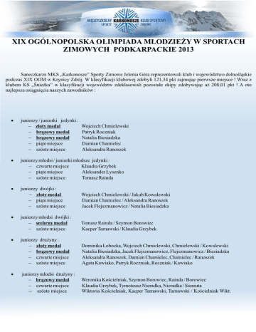 XIX OGÓLNOPOLSKA OLIMPIADA MŁODZIEŻY W SPORTACH ZIMOWYCH PODKARPACKIE 2013 Saneczkarze MKS „Karkonosze” Sporty Zimowe Jelenia Góra reprezentowali klub i województwo dolnośląskie podczas XIX OOM w Krynicy Zdrój. W klasyfikacji klubowej zdobyli 121,34 pkt zajmując pierwsze miejsce ! Wraz z klubem KS „Śnieżka” w klasyfikacji województw zdeklasowali pozostałe ekipy zdobywając aż 208,01 pkt ! A oto najlepsze osiągnięcia naszych zawodników : juniorzy / juniorki jedynki : złoty medal brązowy medal brązowy medal piąte miejsce szóste miejsce Wojciech Chmielewski Patryk Roczniak Natalia Biesiadzka Damian Chamielec Aleksandra Ranoszek juniorzy młodsi / juniorki młodsze jedynki : czwarte miejsce Klaudia Grzybek piąte miejsce Aleksander Łysenko szóste miejsce Tomasz Rainda juniorzy dwójki : złoty medal piąte miejsce szóste miejsce Wojciech Chmielewski / Jakub Kowalewski Damian Chamielec / Aleksandra Ranoszek Jacek Flejszmanowicz / Natalia Biesiadzka juniorzy młodsi dwójki : srebrny medal szóste miejsce Tomasz Rainda / Szymon Borowiec Kacper Tarnawski / Klaudia Grzybek juniorzy drużyny : złoty medal brązowy medal czwarte miejsce szóste miejsce Dominika Łobocka, Wojciech Chmielewski, Chmielewski / Kowalewski Natalia Biesiadzka, Jacek Flejszmanowicz, Flejszmanowicz / Biesiadzka Aleksandra Ranoszek, Damian Chamielec, Chamielec / Ranoszek Agata Kawiako, Patryk Roczniak, Roczniak / Kawiako juniorzy młodsi drużyny : brązowy medal czwarte miejsce -- szóste miejsce Weronika Kościelniak, Szymon Borowiec, Rainda / Borowiec Klaudia Grzybek, Tymoteusz Nieradka, Nieradka / Sieniuta Wiktoria Kościelniak, Kacper Tarnawski, Tarnawski / Kościelniak Wikt.
