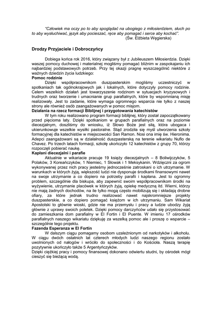 “Człowiek ma oczy po to aby spoglądać na ubogiego z miłosierdziem, słuch po to aby wysłuchiwać, język aby pocieszać, ręce aby pomagać i serce aby kochać”. (Św. Elżbieta Węgierska) Drodzy Przyjaciele i Dobroczyńcy Dobiega końca rok 2016, który związany był z Jubileuszem Miłosierdzia. Dzięki waszej pomocy duchowej i materialnej mogliśmy pomagać bliźnim w zaspokajaniu ich najbardziej podstawowych potrzeb. Przy tej okazji pragnę wyszczególnić niektóre z ważnych dziedzin życia ludzkiego: Pomoc rodzinie Dzięki współpracownikom duszpasterskim mogliśmy uczestniczyć w spotkaniach tak ogólnokrajowych jak i lokalnych, które dotyczyły pomocy rodzinie. Celem wszelkich działań jest towarzyszenie rodzinom w sytuacjach kryzysowych i trudnych oraz tworzenie i umacnianie grup parafialnych, które by wspomnianą misję realizowały. Jest to zadanie, które wymaga ogromnego wsparcia nie tylko z naszej strony ale również osób zaangażowanych w pomoc misjom. Działania na rzecz formacji Biblijnej i przygotowania katechistów W tym roku realizowano program formacji biblijnej, który został zapoczątkowany przed pięcioma laty. Dzięki spotkaniom w grupach parafialnych oraz na poziomie diecezjalnym, doszliśmy do wniosku, iż Słowo Boże jest siłą, która ubogaca i ukierunkowuje wszelkie wysiłki pastoralne. Stąd zrodziła się myśl utworzenia szkoły formacyjnej dla katechistów w miejscowości San Ramon. Nosi ona imię św. Hieronima. Adepci zaangażowani są w działalność duszpasterską na terenie wikariatu Nuflo de Chavez. Po trzech latach formacji, szkołę ukończyło 12 katechistów z grupy 70, którzy rozpoczęli pobierać naukę. Kapłani diecezjalni i parafie Aktualnie w wikariacie pracuje 19 księży diecezjalnych – 8 Boliwijczyków, 5 Polaków, 3 Koreańczyków, 1 Niemiec, 1 Słowak i 1 Meksykanin. Wdzięczni za ogrom wykonywanej przez nich pracy jesteśmy jednocześnie zatroskani o ich utrzymanie. W warunkach w których żyją, większość ludzi nie dysponuje środkami finansowymi nawet na swoje utrzymanie a co dopiero na potrzeby parafii i kapłana. Jest to ogromny problem, szczególnie dla biskupa, aby zapewnić swoim współpracownikom środki na wyżywienie, utrzymanie placówek w których żyją, opiekę medyczną itd. Wierni, którzy nie mają żadnych dochodów, na ile tylko mogą często mobilizują się i składają drobne ofiary, za które jednak trudno realizować nawet najskromniejsze projekty duszpasterskie, a co dopiero pomagać księżom w ich utrzymaniu. Sam Wikariat Apostolski to głównie wioski, gdzie nie ma przemysłu i pracy a ludzie ubodzy żyją głównie z uprawy swoich poletek. Dzięki pomocy darczyńców udało się przystosować do zamieszkania dom parafialny w El Fortin i El Puente. W imieniu 17 ośrodków parafialnych naszego wikariatu dziękuję za wszelką pomoc ale i proszę o wsparcie – szczególnie tego projektu. Fazenda Esperanza w El Fortín W dalszym ciągu pomagamy osobom uzależnionym od narkotyków i alkoholu. W ciągu dwóch ostatnich lat czterech młodych ludzi naszego regionu zostało uwolnionych od nałogów i wróciło do społeczności i do Kościoła. Naszą terapię pozytywnie ukończyło także 5 Argentyńczyków. Dzięki ciężkiej pracy i pomocy finansowej dokonano odwiertu studni, by ośrodek mógł cieszyć się bieżącą wodą. Chorzy na HIV W związku ze wzrostem zachorowań na HIV postanowiono w duchu charytatywnym aby pomagać osobom zakażonym w godnym życiu – tak w sensie duchowym, psychologicznym jak i materialnym. Choroba ta obejmuje często ludzi bardzo ubogich a także młodzież i dzieci. Dlatego utworzono ośrodek pomocy chorym na HIV. Funkcjonuje on w Ascencion de Guarayos. Szkoła Techniczna im. Hansa Rotha w Concepcion Poprzez udzielanie lekcji rzeźby, mechaniki, informatyki wspieramy edukację techniczną ubogiej młodzieży. W naszym internacie mieszka obecnie 11 młodzieńców pochodzących z odleglych wiosek i 34 z pobliskich wiosek przygotowuje się do zawodu mechanika i stolarza. W naszej szkole udzielane są lekcje także dla dziewcząt (45) Uczą się one szycia, wyszywania oraz informatyki. Formacja przygotowuje ich bezpośrednio do podjęcia pracy zawodowej. Realizacja tego dzieła jest możliwa wyłącznie dzięki pomocy darczyńców. Drodzy Przyjaciele Misji Dziękuję za ofiary, które otrzymałem z Ośrodka Misyjnego w ciagu tych 25 lat istnienia referatu misyjnego, pod przewodnictwem O. Krystiana Pieczki i Jego Współpracowników. Pozdrawiam Wszystkich uczestnikow opłatkowego spotkania Rodziców, Rodzeństwa, Dobrodziejów misji. Do nich zaliczam również Ks. Biskupa Jana Kopca, który będzie przewodniczył Mszy Św. Dziękuję Mu również za nowego misjonarza, Ks. Piotra Lewandowskiego, wywodzacego się z diecezji gliwickiej, który dotarl do nas w październiku tego roku. Jesze raz dziękuję za pomoc otrzymaną z Ośrodka Misyjnego w tym roku, jak również podczas mojego urlopu w miesiącu sierpniu, oraz za kolektę z odpustu Sw. Anny, przeznaczoną na nasz Wikariat Apostolski. Dziękuję O. Prowincjałowi Alanowi oraz O. Andrzejowi za wizytę braterską oraz wszelką pomoc materialną i duchową napływającą z Prowincji Św. Jadwigi, oraz Współbraci pracujących w Niemczech. O. Błażejowi, za odważne podjecie się tej nowej misji, Jego Współpracownikom oraz Wszystkim Dobroczyńcom, składam w imieniu własnym, misjonarzy i misjonarek, oraz Ludu Bożego jak najserdeczniejsze podziekowanie i zapewnienie w modlitwewnej pamieci. Zbliżamy się do Świąt Bożego Narodzenia. Jezus urodził się w rodzinie materialnie ubogiej ale bogatej wiarą, nadzieją i przede wszystkim miłością. Misję Chrystusa w świecie wyrażają dobrze słowa z księgi Izajasza, które On sam odczytał w synagodze nazareńskiej:“Duch Pański spoczywa na Mnie, ponieważ Mnie namaścił i posłał Mnie, abym ubogim niósł dobrą nowinę, więźniom głosił w