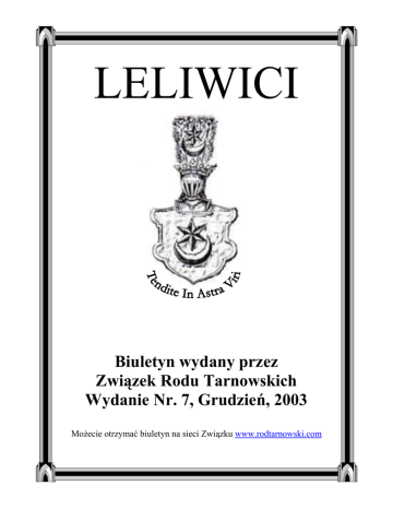 LELIWICI Biuletyn wydany przez Związek Rodu Tarnowskich Wydanie Nr. 7, Grudzień, 2003 Możecie otrzymać biuletyn na sieci Związku www.rodtarnowski.com Bierzacy Zarzad: sierpen 16, 2003 do sierpnia, 2008 Prezes Paweł Tarnowski 1 szy Vice Prezes 2 gi Vice Prezes Sekretarz Skarbnik Aleksander Tarnowski Czlonkowie Zarzadu Karol Tarnowski Jan Spytek Tarnowski Elżbieta Łastowiecka Marcin Tarnowski Tomek Tarnowski Stefan Tarnowski Jan Artur Tarnowski Jacek Tarnowski Piotr Mycielski Komisja Rewizyjna Władysław Tarnowski Anna Marie Unrug Rose Marie Punch Kierownik Sieci Związku Michał Tarnowski (Kanada) email: [email protected] Reprezentanci lokalni Polska: Piotr Mycielski [email protected] Francja / Szwajcarja: Zdzisław (Jean) Potocki Ameryka Paweł Tarnowski [email protected] Monika Wray [email protected] Anglia: [email protected] Proszę przesyłać wszystkie wiadomości, informacje personalne i artykuły do publikacji w Biuletynie do Pawła Tarnowskigo email: [email protected] Od Prezesa Jestem zaszczycony ponownym wyborem na Prezesa na nastepne pieć lat. Pozostanę otwarty na życzenia członków i uważny na cele Związku. Pragnę pogratulować członkom wybranym do Zarządu: 1szy Vice – Prezes Aleksander Tarnowski 2gi Vice – Prezes Karol Tarnowski Sekretarz Jacek Tarnowski Skarbnik Piotr Mycielski Członkowie Marcin Tarnowski - Genealogja Michał Tarnowski – Kierownik Sieci Elżbieta Łastawiecka Jan A. Tarnowski Stefan Tarnowski (Toulouse) Tomasz Tarnowski (Sopot) Jan Spytek Tarnowski Już mamy dobry podkład ku zjednoczeniu rodziny. Z przyjemnością będę dalej współpracował z nowym Zarządem aby wzmocnić i zblizyć więzy pomiedzy członkami naszego rodu. Specjalnie zawdzięczam mojej małżonce, Jolandzie, za jej stałą pomoc i poparcie przy załatwianiu spraw stowarzyszenia. Pragnę również podkreślić ogromną pracę brata, Marcina z genealogją, i jego syna, Michała z instalacją sieci Związku, oraz Marychny Tarnowskiej zdolne pokierowanie sprawami administracyjnemi Związku na miejscu w Warszawie. Zapadła propozycja aby podczas następnej kadencji starać się organizować częściej mniejsze spotkania w miejscowościach, gdzie mieszka większa ilość Tarnowskich, jak Londyn, Paryż, Montreal,Kraków, etc… oraz ogłaszać owe spotkania i opowiadać o nich na sieci Związku. Uważam że jest wskazane aby pewne Polskie i rodzinne tradycje zachowały się, jak dzielenie się opłatkiem na Boże Narodzenie i jajkiem na Wielkanoc. To są napszykład dobre okazje aby organizować takie spotkania. Boże Narodzenie szybko się zbliża, więc korzystam aby przekazać wszystkim serdeczne życzenia wesołych i szczęśliwych Swiąt. Paweł Tarnowski Ps: Pragnę podziękować serdecznie wszzstkim co przekazali artykuły do biuletynu. Zawsze poszukujemy ciekawych informacji i opowieści aby je przekazać Rodzinie. 1 Wspomnienia z III Zjazdu RODU TARNOWSKICH Dzików, 14 – 17 sierpnia 2003 r. Przez Jasia i Marychnę Tarnowskich Podczas sierpnia 2003 r. odbył się w Dzikowie kolejny, trzeci już, zjazd Rodu. W zjeździe uczestniczyło ponad 100 osób. Zakładając ZWIĄZEK RODU TARNOWSKICH, członkowie Rodu Tarnowskich oddali się w opiekę Matki Boskiej Dzikowskiej słowami preambuły Statutu ZWIĄZKU: Ufni w opiekę Matki Boskiej Dzikowskiej. Tak więc jak poprzednio, zjazd rozpoczął się 15 sierpnia, w święto Matki Boskiej. W dzień przyjazdu uczestników zjazdu do Dzikowa, dnia 14 sierpnia, na zaproszenie o.Macieja Złonkiewicza - przeora OO Dominikanów w Tarnobrzegu oraz ZWIĄZKU zechciał przybyć do Dzikowa Ksiądz Biskup Sandomierski prof. dr hab. Andrzej Dzięga, aby otworzyć zjazd modlitwą do matki Boskiej Dzikowskiej. Nabożeństwo odbyło się o godz. 17.00 w kaplicy dzikowskiej, w tej samej kaplicy zamku dzikowskiego, w której przed kilkuset laty znajdował się obraz Matki Boskiej Dzikowskiej, nim został uznany za cudowny i przeniesiony do nowo wybudowanego kościoła, w Tarnobrzegu, i w którym znajduje się do dnia dzisiejszego, pod znakomitą opieką OO Dominikanów. Po nabożeństwie, przeszliśmy procesją do kościoła, do Matki Boskiej Dzikowskiej, gdzie o godz. 18.00 Jego Eksellencja celebrował uroczystą mszę św. W czasie mszy, po wygłoszeniu homilii, Ksiądz Biskup poświęcił sztandar utworzonej w ubiegłym roku Państwowej Wyższej Szkoły Zawodowej w Tarnobrzegu, a Jego Magnificencja Rektor PWSZ Prof. dr hab. Kazimierz Jaremczuk odczytał dokument nadania PWSZ imienia prof.Stanisława Tarnowskiego. Pod koniec mszy było dużo wzruszenia, gdy chór zaśpiewał pieśń którą sami śpiewaliśmy na wygnaniu: O, panie któryś jest na niebie, O, Panie, usłysz prośby nasze, Wyciągnij sprawiedliwą dłoń! O usłysz nasz tułaczy śpiew. Wołamy z wszystkich stron do Ciebie, Znad Warty, Wisły, Sanu, Bugu, O polski dach, o polska broń. Męczeńską do Cię woła krew! O, Boże, skrusz ten miecz, co siecze kraj, O, Boże, skrusz ten miecz, co siecze kraj, Do wolnej Polski nam powrócić daj! Do wolnej Polski nam powrócić daj! By stał się twierdzą nowej siły, By stał się twierdzą nowej siły, Nasz dom, nasz kraj! Nasz dom, nasz kraj!1 Tego wieczora było dużo emocji wśród tych, którzy na trzy dni zjechali się z różnych stron swiata do Dzikowa, aby spędzić kilka chwil w tym domu, który pamietają z przed laty, i spotkać się ponownie z tymi, których również znają i pamietają z przed wojny jak z ich dziećmi i wnukami, których może nigdy jeszcze nie poznali. 15 sierpnia 2003 ,Uczestnicy zjazdu mieli przed południem możliwość wyboru: albo wizytę w Muzeum Historycznym Miasta Tarnobrzega, w którym znajduje się część dawnej kolekcji 1 Słowa: Tadeusz Sewera – Za każdy kamień Twój Stolico. Pieśni Walczącej Warszawy. Łódź – Tarnobrzeg, Biblioteka Tarnobrzeskich Zeszytów Historycznych 2 dzikowskiej, głównie portrety rodzinne, albo mszę św. w kościele OO Dominikanów albo wizyt
