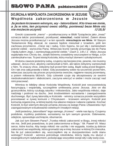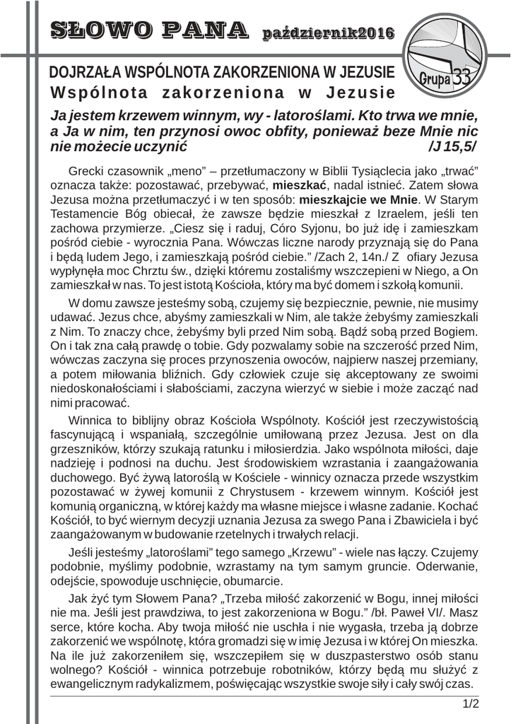 SŁOWO PANA ‚ pazdziernik2016 DOJRZAŁA WSPÓLNOTA ZAKORZENIONA W JEZUSIE Wspólnota zakorzeniona w Jezusie Ja jestem krzewem winnym, wy - latoroślami. Kto trwa we mnie, a Ja w nim, ten przynosi owoc obfity, ponieważ beze Mnie nic nie możecie uczynić /J 15,5/ Grecki czasownik „meno” – przetłumaczony w Biblii Tysiąclecia jako „trwać” oznacza także: pozostawać, przebywać, mieszkać, nadal istnieć. Zatem słowa Jezusa można przetłumaczyć i w ten sposób: mieszkajcie we Mnie. W Starym Testamencie Bóg obiecał, że zawsze będzie mieszkał z Izraelem, jeśli ten zachowa przymierze. „Ciesz się i raduj, Córo Syjonu, bo już idę i zamieszkam pośród ciebie - wyrocznia Pana. Wówczas liczne narody przyznają się do Pana i będą ludem Jego, i zamieszkają pośród ciebie.” /Zach 2, 14n./ Z ofiary Jezusa wypłynęła moc Chrztu św., dzięki któremu zostaliśmy wszczepieni w Niego, a On zamieszkał w nas. To jest istotą Kościoła, który ma być domem i szkołą komunii. W domu zawsze jesteśmy sobą, czujemy się bezpiecznie, pewnie, nie musimy udawać. Jezus chce, abyśmy zamieszkali w Nim, ale także żebyśmy zamieszkali z Nim. To znaczy chce, żebyśmy byli przed Nim sobą. Bądź sobą przed Bogiem. On i tak zna całą prawdę o tobie. Gdy pozwalamy sobie na szczerość przed Nim, wówczas zaczyna się proces przynoszenia owoców, najpierw naszej przemiany, a potem miłowania bliźnich. Gdy człowiek czuje się akceptowany ze swoimi niedoskonałościami i słabościami, zaczyna wierzyć w siebie i może zacząć nad nimi pracować. Winnica to biblijny obraz Kościoła Wspólnoty. Kościół jest rzeczywistością fascynującą i wspaniałą, szczególnie umiłowaną przez Jezusa. Jest on dla grzeszników, którzy szukają ratunku i miłosierdzia. Jako wspólnota miłości, daje nadzieję i podnosi na duchu. Jest środowiskiem wzrastania i zaangażowania duchowego. Być żywą latoroślą w Kościele - winnicy oznacza przede wszystkim pozostawać w żywej komunii z Chrystusem - krzewem winnym. Kościół jest komunią organiczną, w której każdy ma własne miejsce i własne zadanie. Kochać Kościół, to być wiernym decyzji uznania Jezusa za swego Pana i Zbawiciela i być zaangażowanym w budowanie rzetelnych i trwałych relacji. Jeśli jesteśmy „latoroślami” tego samego „Krzewu” - wiele nas łączy. Czujemy podobnie, myślimy podobnie, wzrastamy na tym samym gruncie. Oderwanie, odejście, spowoduje uschnięcie, obumarcie. Jak żyć tym Słowem Pana? „Trzeba miłość zakorzenić w Bogu, innej miłości nie ma. Jeśli jest prawdziwa, to jest zakorzeniona w Bogu.” /bł. Paweł VI/. Masz serce, które kocha. Aby twoja miłość nie uschła i nie wygasła, trzeba ją dobrze zakorzenić we wspólnotę, która gromadzi się w imię Jezusa i w której On mieszka. Na ile już zakorzeniłem się, wszczepiłem się w duszpasterstwo osób stanu wolnego? Kościół - winnica potrzebuje robotników, którzy będą mu służyć z ewangelicznym radykalizmem, poświęcając wszystkie swoje siły i cały swój czas. 1/2 SŁOWO PANA Ja jestem krzewem winnym, wy - latoroślami. Kto trwa we mnie, a Ja w nim, ten przynosi owoc obfity, ponieważ beze Mnie nic nie możecie uczynić /J 15,5/ Trwanie w Chrystusie na co dzień,chyba najbardziej wyraża się poprzez wierność i trwanie na modlitwie. Kto się dobrze modli, ten z pewnością dobrze żyje, czyli przynosi owoc obfity. Kto zaś się nie modli, albo modli się powierzchownie, zaczyna kierować się w życiu wyrachowaniem, pretensjami, ma problemy z relacjami we wspólnocie, w pracy, z trudnością znosi doświadczenia, cierpienie, nie potrafi spojrzeć na życie oczyma wiary. Jezus, obok modlitwy indywidualnej w ukryciu, wskazuje na modlitwę wspólnotową. To w niej sam Duch Święty podpowiada nam, za kogo się pomodlić, czy w jaki sposób komuś pomóc. Najdoskonalszą modlitwą pozostanie zawsze Eucharystia. Świadectwo Wyciągamy dłoń do drugiej osoby, pokonując własny wstyd, strach, zażenowanie i ogrzewając jej serce uśmiechem. Czasem rezygnujemy z własnej wygody, z własnego wolnego czasu - nie po to, by zaskarbić sobie czyjeś łaski, by zebrać jakieś zasługi, a dlatego, że chcemy komuś z miłością usłużyć. Chcemy „umywać komuś nogi” – jak On umywał uczniom. Świadczymy o Nim, opowiadając o rekolekcjach, o naszej Wspólnocie, organizując u siebie w domu dodatkowe spotkanie Grupy - nawet takie przy kartach... proponując komuś podwiezienie samochodem, żegnając się przed posiłkiem, opanowując się w sytuacji, gdy inna osoba byłaby porywcza i spowodowała kłótnię. Szukamy pokoju. Czasami nawet wybaczamy „niewybaczalne”. Zwątpień nam nie brakuje. Upadków też nie ..., bywa, że ważniejsze od naszych spotkań są inne znajomości, układy... Wydaje się, że dzięki nim da się załatwić i osiągnąć wiele. Po chwilowej jednak nadziei i radości przychodzi okres pustki, poczucie braku sensu tego, co się robi. Od rekolekcji ewangelizacyjnych dużo więcej i świadomiej się modlimy i myślimy o sprawach codziennych, które czekają każdego dnia. Z perspektywy czasu zaczynamy dostrzegać, że kiedyś czegoś nam brakowało, a z czego nie zdawaliśmy sobie sprawy. Bardzo pomogła każdemu z nas codzienna modlitwa. Zaufaliśmy i pozwoliliśmy Bogu, by nas poprowadził. By dał siłę i postawił na naszej drodze otwartych, życzliwych ludzi, gotowych wysłuchać i bezinteresownie wesprzeć. „Trwać w Nim”. To chyba najważniejsze zadanie, jakie nam Chrystus zadał. Często nie jest to łatwe, wydaje się, że tyle inne rzeczy jest do zrobienia, a to chyba wynika z tego, że nie do końca jesteśmy w stanie pojąć kim On dla nas jest. Grupa XIX „Wprowadzajcie słowo w czyn” (Jk 1,22) 2/2
