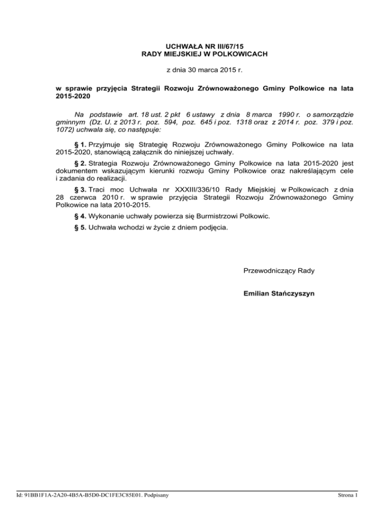 UCHWAŁA NR III/67/15 RADY MIEJSKIEJ W POLKOWICACH z dnia 30 marca 2015 r. w sprawie przyjęcia Strategii Rozwoju Zrównoważonego Gminy Polkowice na lata 2015-2020 Na podstawie art. 18 ust. 2 pkt 6 ustawy z dnia 8 marca 1990 r. o samorządzie gminnym (Dz. U. z 2013 r. poz. 594, poz. 645 i poz. 1318 oraz z 2014 r. poz. 379 i poz. 1072) uchwala się, co następuje: § 1. Przyjmuje się Strategię Rozwoju Zrównoważonego Gminy Polkowice na lata 2015-2020, stanowiącą załącznik do niniejszej uchwały. § 2. Strategia Rozwoju Zrównoważonego Gminy Polkowice na lata 2015-2020 jest dokumentem wskazującym kierunki rozwoju Gminy Polkowice oraz nakreślającym cele i zadania do realizacji. § 3. Traci moc Uchwała nr XXXIII/336/10 Rady Miejskiej w Polkowicach z dnia 28 czerwca 2010 r. w sprawie przyjęcia Strategii Rozwoju Zrównoważonego Gminy Polkowice na lata 2010-2015. § 4. Wykonanie uchwały powierza się Burmistrzowi Polkowic. § 5. Uchwała wchodzi w życie z dniem podjęcia. Przewodniczący Rady Emilian Stańczyszyn Id: 91BB1F1A-2A20-4B5A-B5D0-DC1FE3C85E01. Podpisany Strona 1 STRONA 1 Z 111 Załącznik do Uchwały Nr III/67/15 Rady Miejskiej w Polkowicach z dnia 30 marca 2015 r. S TRATEGIA R OZWOJU Z RÓWNOWAŻONEGO G MINY P OLKOWICE na lata 2015 – 2020 v. 4.1 finalna autor: dr Andrzej Sztando +48 603163839 [email protected] www.sztando.com Polkowice, marzec 2015 STRATEGIA ROZWOJU ZRÓWNOWAŻONEGO GMINY POLKOWICE NA LATA 2015-2020 Id: 91BB1F1A-2A20-4B5A-B5D0-DC1FE3C85E01. Podpisany Strona 1 STRONA 2 Z 111 autorstwo, skład i opracowanie szaty graficznej, redakcja materiałów źródłowych: dr Andrzej Sztando web: www.sztando.com e-mail: [email protected] Niniejsza Strategia Rozwoju Zrównoważonego Gminy Polkowice na lata 2015-2020 jest już szóstą Strategią przyjętą przez samorząd Gminy Polkowice. Strategie poprzednie to: - Lokalna Strategia Rozwoju Gospodarczego Gminy Polkowice z grudnia 1995 r. Strategia Rozwoju Zrównoważonego Gminy Polkowice z czerwca 2001 r. Strategia Rozwoju Zrównoważonego Gminy Polkowice (aktualizacja) z lipca 2002 r. Strategia Rozwoju Zrównoważonego Gminy Polkowice na lata 2008-2014 z grudnia 2007 r. Strategia Rozwoju Zrównoważonego Gminy Polkowice na lata 2010-2015 z czerwca 2010 r. Stanowi to dowód konsekwencji władz samorządowych w określaniu oraz realizacji, długoplanowych i obszernych w różnorodne zadania, strategicznych planów rozwoju. Autor STRATEGIA ROZWOJU ZRÓWNOWAŻONEGO GMINY POLKOWICE NA LATA 2015-2020 Id: 91BB1F1A-2A20-4B5A-B5D0-DC1FE3C85E01. Podpisany Strona 2 STRONA 3 Z 111 Zastosowane skróty GBK Gminny Bank Kadr GPR Gminny Program Rewitalizacji KPP koncepcja programowo-przestrzenna MPZP miejscowy plan zagospodarowania przestrzennego PDAJO 2015-2020 Program Doskonalenia Administracji Gminy Polkowice i Jej Jednostek Organizacyjnych na lata 2015-2020 PEE 2015-2021 Program Edukacji Ekologicznej Dla Gminy Polkowice na lata 2015-2021 PGN Plan Gospodarki Niskoemisyjnej Gminy Polkowice. PLPPG 2015-2020 Program Lokalnej Polityki i Promocji Gospodarczej Gminy Polkowice na lata 2015-2020” PONE 2012-2020 Program Ograniczenia Niskiej Emisji Dla Miasta Polkowice na lata 20122020 PONE 2021-2030 Program Ograniczenia Niskiej Emisji Dla Miasta Polkowice na lata 20212030 POŚ 2015-2018 Program Ochrony Środowiska Gminy Polkowice na lata 2015-2018 z perspektywą na lata 2019-2022 POŚ 2019-2022 Program Ochrony Środowiska Dla Gminy Polkowice na lata 2019-2022 z perspektywą na lata 2023-2026 POZB Programy Opieki nad Zwierzętami Bezdomnymi oraz Zapobiegania Bezdomności Zwierząt na Terenie Gminy Polkowice PPN 2011-2015 Gminny Program Przeciwdziałania Narkomanii dla Gminy Polkowice na lata 2011-2015 PPN 2016-2020 Gminny Program Przeciwdziałania Narkomanii dla Gminy Polkowice na lata 2016-2020 PPPR 2011-2015 Gminny Program Przeciwdziałania Przemocy w Rodzinie oraz Ochrony Ofiar Przemocy dla Gminy Polkowice na lata 2011-2015 PPPR 2016-2020 Gminny Program Przeciwdziałania Przemocy w Rodzinie oraz Ochrony Ofiar Przemocy dla Gminy Polkowice na lata 2016-2020 PPRPA 2011 Gminny Program Profilaktyki i Rozwiązywania Problemów Alkoholowych dla Gminy Polkowice z 2011 r. PPZP 2012-2015 Program Promocji Zdrowia Psychicznego dla Gminy Polkowice na lata 2012-2015 PPZP 2016-2020 Program Promocji Zdrowia Psychicznego dla Gminy Polkowice na lata 2016-2020 PRMUWUK 2013-2015 Wieloletni Plan Rozwoju i Modernizacji Urządzeń Wodociągowych i Urządzeń Kanalizacyjnych Będących w Posiadaniu PGM Sp. z o.o. w Polkowicach na lata 2013-2015 PRO 2016-2020 Program Rozwoju Oświaty w Gminie Polkowice na lata 2016-2020 PRPZT 2015-2020 Program Rozwoju i Pielęgnacji Zieleni Trwałej Gminy Polkowice na lata 2015-2020 PUR Plan Urządzeniowo-Rolny dla Obszarów Wiejskich Gminy Polkowice STRATEGIA ROZWOJU ZRÓWNOWAŻONEGO GMINY POLKOWICE NA LATA 2015-2020 Id: 91BB1F1A-2A20-4B5A-B5D0-DC1FE3C85E01. Podpisany Strona 3 STRONA 4 Z 111 PUWZA 2013 Program Usuwania Wyrobów Zawierających Azbest z Terenu Gminy Polkowice z 2013 PWOP Program Współpracy gminy Polkowice z Organizacjami Pozarządowymi oraz Podmiotami wymienionymi w art. 3 ust. 3 ustawy z dnia 24 kwietnia 2003 r. o działalności pożytku publicznego i o wolontariacie PWR 2015-2017 Program Wspierania Rodziny dla Gminy Polkowice na lata 2015-2017 PWR 2018-2020 Program Wspierania Rodziny dla Gminy Polkowice na lata 2018-2020 SRPS 2015-2020 Strategia Rozwiązywania Problemów Społecznych dla Gminy Polkowice na lata 2015-2020 (niniejszy dokument) WPF Wieloletnia Prognoza Finansowa Gminy Polkowice ZWS Zespół ds. Wdrażania Strategii Rozwoju Zrównoważonego Gminy Polkowice sgZWS społeczna grupa Zespołu ds. Wdrażania Strategii Rozwoju Zrównoważonego Gminy Polkowice ggZWS gospodarcza grupa Zespołu ds. Wdrażania Strategii Rozwoju Zrównoważonego Gminy Polkowice egZWS ekologiczna grupa Zespołu ds. Wdrażania Strategii Rozwoju Zrównoważonego Gminy Polkowice STRATEGIA ROZWOJU ZRÓWNOWAŻONEGO GMINY P