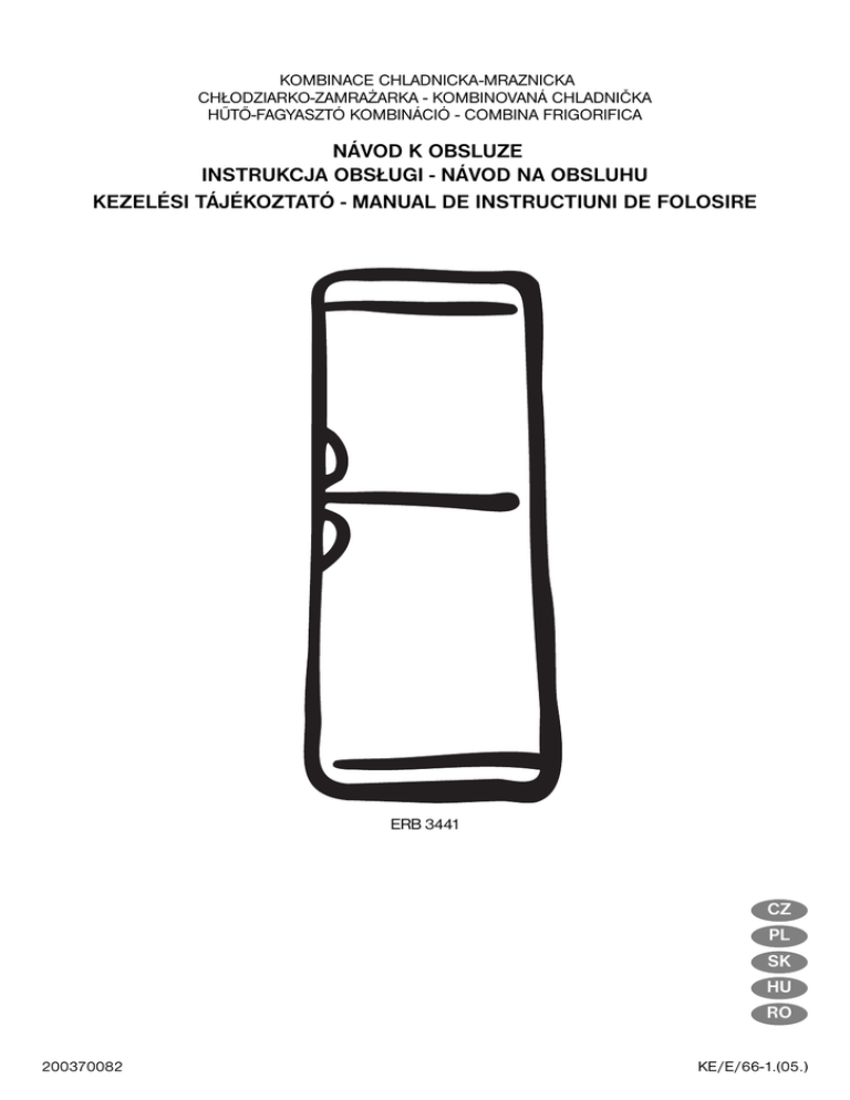 KOMBINACE CHLADNICKA-MRAZNICKA CHŁODZIARKO-ZAMRAŻARKA - KOMBINOVANÁ CHLADNIČKA HŰTŐ-FAGYASZTÓ KOMBINÁCIÓ - COMBINA FRIGORIFICA NÁVOD K OBSLUZE INSTRUKCJA OBSŁUGI - NÁVOD NA OBSLUHU KEZELÉSI TÁJÉKOZTATÓ - MANUAL DE INSTRUCTIUNI DE FOLOSIRE ERB 3441 CZ PL SK HU RO 200370082 KE/E/66-1.(05.) PL Przed instalacją i uruchomieniem urządzenia należy zapoznać się z niniejszą instrukcją obsługi. Zawiera ona wiele cennych wskazówek i rad dotyczących prawidłowej i bezpiecznej eksploatacji zakupionej przez Państwa chłodziarki. Poniższe symbole pozwolą Państwu znaleźć potrzebne informacje: Wskazówki dotyczące bezpieczeństwa Przestrzeganie informacji i ostrzeżeń oznaczonych i użytkownika. tym symbolem sprzyja bezpieczeństwu urządzenia Praktyczne wskazówki Wskazówki dotyczące ochrony środowiska Porady Tym symbolem są oznaczone praktyczne rady związane z żywnością i sposobami jej przechowywania. Symbol na produkcie lub na opakowaniu oznacza, że tego produktu nie wolno traktować tak, jak innych odpadów domowych. Należy oddać go do właściwego punktu skupu surowców wtórnych zajmującego się złomowanym sprzętem elektrycznym i elektronicznym. Właściwa utylizacja i złomowanie pomaga w eliminacji niekorzystnego wpływu złomowanych produktów na środowisko naturalne oraz zdrowie. Aby uzyskać szczegółowe dane dotyczące możliwości recyklingu niniejszego urządzenia, należy skontaktować się z lokalnym urzędem miasta, służbami oczyszczania miasta lub sklepem, w którym produkt został zakupiony. The Electrolux Group. The world's No.1 choice. Grupa Electrolux jest największym na świecie producentem zmechanizowanych urządzeń przeznaczonych do kuchni, do czyszczenia oraz do lasu i ogrodu. Każdego roku sprzedaje ponad 55 milionów produktów (takich jak lodówki, kuchenki, pralki automatyczne, odkurzacze, pilarki łańcuchowe i kosiarki do trawy) o łącznej wartości ok. 14 miliardów USD w ponad 150 krajach świata. 17 PL Spis tr eś ci Wskazówki dotyczące bezpieczeństwa ..................................................................................................19 Wskazówki ogólne..............................................................................................................................19 Wskazówki dotyczące bezpieczeństwa dzieci .........................................................................................19 Wskazówki bezpieczeństwa dotyczące instalacji......................................................................................19 Wskazówki bezpieczeństwa - czynnik chłodniczy izobutan ........................................................................19 Wskazówki dla użytkownika ..................................................................................................................20 Wskazówki ogólne .............................................................................................................................20 Opis urządzenia i jego głównych elementów...........................................................................................20 Panel sterujący .............................................................................................................................21 Eksploatacja urządzenia ......................................................................................................................21 Przed pierwszym uruchomieniem.....................................................................................................21 Regulacja temperatury ...................................................................................................................21 Eksploatacja komory chłodziarki ......................................................................................................21 Wskazówki dotyczące przechowywania żywności ...............................................................................21 Czas przechowywania produktów, temperatura ..................................................................................22 Eksploatacja zamrażarki ......................................................................................................................22 Zamrażanie ..................................................................................................................................22 Przechowywanie mrożonek.............................................................................................................22 Przygotowanie kostek lodu .............................................................................................................22 Praktyczne rady i wskazówki................................................................................................................22 Wskazówki i porady............................................................................................................................23 Oszczędzanie energii.....................................................................................................................23 Urządzenie i środowisko naturalne ...................................................................................................23 Konserwacja .....................................................................................................................................23 Odmrażanie..................................................................................................................................23 Regularne mycie ...........................................................................................................................25 Przerwy w użytkowaniu chłodziarki...................................................................................................25 Usuwanie usterek ..............................................................................................................................25 Wymiana żarówki........................