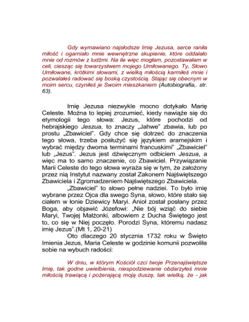 Gdy wymawiano najsłodsze Imię Jezusa, serce raniła miłość i ogarniało mnie wewnętrzne skupienie, które oddalało mnie od rozmów z ludźmi. Na ile więc mogłam, pozostawałam w celi, ciesząc się towarzystwem mojego Umiłowanego. Ty, Słowo Umiłowane, krótkimi słowami, z wielką miłością karmiłeś mnie i pozwalałeś radować się boską czystością. Stając się obecnym w moim sercu, czyniłeś je Swoim mieszkaniem (Autobiografia,. str. 63). Imię Jezusa niezwykle mocno dotykało Marię Celeste. Można to lepiej zrozumieć, kiedy nawiąże się do etymologii tego słowa: Jezus, które pochodzi od hebrajskiego Jeszua, to znaczy „Jahwe” zbawia, lub po prostu „Zbawiciel”. Gdy chce się dotrzeć do znaczenia tego słowa, trzeba posłużyć się językiem aramejskim i wybrać między dwoma terminami francuskimi” „Zbawiciel” lub „Jezus”. Jezus jest dźwięcznym odbiciem Jeszua, a więc ma to samo znaczenie, co Zbawiciel. Przywiązanie Marii Celeste do tego słowa wyraża się w tym, że założony przez nią Instytut nazwany został Zakonem Najświętszego Zbawiciela i Zgromadzeniem Najświętszego Zbawiciela. „Zbawiciel” to słowo pełne nadziei. To było imię wybrane przez Ojca dla swego Syna, słowo, które stało się ciałem w łonie Dziewicy Maryi. Anioł został posłany przez Boga, aby objawić Józefowi: „Nie bój wziąć do siebie Maryi, Twojej Małżonki, albowiem z Ducha Świętego jest to, co się w Niej poczęło. Porodzi Syna, któremu nadasz imię Jezus”.(Mt 1, 20-21) Oto dlaczego 20 stycznia 1732 roku w Święto Imienia Jezus, Maria Celeste w godzinie komunii pozwoliła sobie na wybuch radości: W dniu, w którym Kościół czci twoje Przenajświętsze Imię, tak godne uwielbienia, niespodziewanie obdarzyłeś mnie miłością trawiącą i pożerającą moją duszę, tak wielką, że - jak mi się wydawało - mogłaby się ona cała rozpłynąć z miłości dla piękna twego Imienia; tak słodkiego, tak drogiego, tak wielkiego, tak pełnego dóbr tak godnego miłowania, tak zadziwiającego i boskiego! (Rozmowy duszy z Jezusem, 99). W „Magnificat” Maryja nie śpiewa ani po łacinie, ani po grecku, ale w języku aramejskim bliskim hebrajskiego: „Wielbi dusza moja Pana, raduje się mój duch w Bogu moim Jeszua” to znaczy „w moim Zbawicielu” lub „moim Jezusie”. Można więc przetłumaczyć : „Raduje się duch mój w Bogu, moim Jezusie”. Rozumie się teraz uczucia Marii Celeste i wielu mistyków, którzy wymawiali lub słyszeli to imię Jezusa. Ponieważ dla nich wszystkich to imię nie przywołuje najpierw jakiejś idei czy nawet obrazu, ale żywą, obecną osobę, najlepszego przyjaciela, Boskiego Przyjaciela. To sam Jezus, Zmartwychwstały, ze śladami gwoździ zwraca się do każdego z nas, jak do Marii Magdaleny w paschalny poranek: Chcąc coś powiedzieć o tej miłosnej ranie zadanej przez Boże Słowo, rozpocznę właśnie od opisania mocy Imienia samego Jezusa, tak bardzo godnego czci. Najczęściej dzieje się to w taki oto sposób: w chwili, gdy człowiek pochłonięty jest jakąś czynnością, gdy coś czyta lub modli się i zostaje wymienione przez przypadek w jego obecności słodkie imię Jezusa, czuje on nagle jakby został przeszyty potężną miłosną strzałą, tak że przez moment traci oddech i trudno mu nawet powiedzieć, czy doświadcza miłości czy też bólu. W jednej bowiem chwili ta strzała przenika do jej wnętrza i rozpala duszę rozżarzonym ogniem miłości. Wtedy wszystko zdaje mu się być jednocześnie najsłodszym bólem i miłością. Cały też skupia się i koncentruje na swoim Bogu. Pojawia się wtedy pewien rodzaj modlitwy, którą można nazwać zanurzeniem w Bogu. ( Stopnie modlitwy, 8) W ten sposób imię Jezusa prowadzi Marię Celeste nie tylko do spotkania z Jezusem, ale do spotkania z Ojcem Jezusa w świetle Ducha Świętego. A MY DZISIAJ? Czy zrozumieliśmy wreszcie, ze w szkole Marii Celeste potrzebne są dwie osoby: ta, który patrzy i ta, który przyjmuje spojrzenie, ta, która słucha i ta, który czuje się wysłuchana, która kocha i jest kochana? Jak wymawiamy imię Jezus? Czy jest to formuła wypowiadana machinalnie, używana z przyzwyczajenia? A może to imię przyjaciela, który jest wszędzie i wszystko uczynił, aby zbawić nas za cenę swego życia, przebaczając nam i wzywając do współpracy z Sobą dla zbawienia świata; przemieniając nas i zapraszając dzisiaj do udziału w przyjacielskiej uczcie Eucharystii , w oczekiwaniu na świętowanie w Królestwie? Czy próbowaliśmy modlić się z Maryją wersetem z Magnificat: „Raduje się mój duch w Bogu, moim Jezusie”? Módlmy się z Marią Celeste O przenajświętsze Imię mojego Jezusa, które adoruję... Imię tak słodkie, tak drogie, tak wielkie, tak pełne dóbr tak godne miłowania, tak zadziwiające i boskie! Pozwól mi to wypowiedzieć i dać upust miłości mojego serca do Ciebie, w wolności, bez żadnych ograniczeń, bo chcę powiedzieć to przecież Tobie, który jesteś całą moją miłością, moim życie, sercem i samą moją duszą. Wyjaśnij mi, Umiłowany, dlaczego tak trawisz moje serce? Pełne jest ono ognia; wystarczy, że usłyszy o Tobie, a wydaje mu się, że twe piękne Imię jak ostre żelazo kaleczy je i rani tysiące razy. (Wypisy, 26)