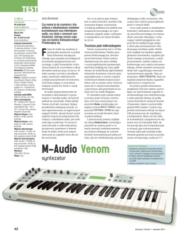 TEST 2.199 z PRODUCENT M-Audio/Avid www.m-audio.com DOSTARCZY Music Info Kraków tel. 12-267-24-80 www.musicinfo.pl Funkcje instrumentu: 49-klawiszowa klawiatura, 12-gosowa polifonia, 41 próbek oscylatora i 53 brzmienia perkusyjne, synteza PWM, Sync, FM i modulacja piercieniowa, filtr wielofunkcyjny z emulacj przesterowania lampowego i ograniczaniem; 3 LFO, 3 obwiednie AHDSR, 16 konfiguracji modulacji. Brzmienia: 512 barw pojedynczych, 256 brzmie warstwowych/multi. Efekty: 2 globalne na torach wysykowych (Reverb, Delay, Chorus, Flanger, Phaser), 1 efekt insertowy na parti (ogóem 4) – Compression, EQ, Distortion, Bit Reduction, AutoWah. Interfejs audio/MIDI: USB 2.0, 24 bity, 44,1 kHz. Vyzex (wymagania): PC – Windows XP, Vista lub Windows 7, procesor P4 lub odpowiednik; Mac – OS X 10.4, 10.5 lub 10.6, procesor PowerPC G5 lub Intel. Wyjcia liniowe: maks. poziom +6 dBV, dynamika 99 dB. Wejcia liniowe: maks. poziom 2,1 dBV, dynamika 96 dB. Wejcie mikrofonowe: maks. poziom –2,2 dBu, odstp od szumów –96 dB, zakres regulacji czuoci 35 dB. Wejcie instrumentalne: maks. poziom +10 dBV, odstp od szumów –95 dB, zakres regulacji czuoci 35 dB, impedancja 1 M:. Wymiary: 750×400×150 mm. Waga: 3 kg. 42 DVD Jono Buchanan Czy mamy tu do czynienia z klawiatur z wbudowanym moduem brzmieniowym oraz interfejsem audio, czy moe z rasowym syntezatorem, którego nazwa sugeruje co bardzo niebezpiecznego? Przekonajmy si. irma M-Audio ma ustaloną reputację jako producent wysokiej klasy klawiatur sterujących, różnego typu narzędzi pozwalających na kontrolę oprogramowania muzycznego, a także kontrolerów wykorzystywanych do wyzwalania i edycji dźwięków podczas pracy na żywo. To także uznany wytwórca interfejsów audio, monitorów odsłuchowych, a dzięki przynależności do koncernu Avid firma mająca w swej ofercie studyjny system Pro Tools w wersji M-Powered. M-Audio eksperymentowała też wcześniej z klawiaturami wyposażonymi w interfejs audio, do których należał np. KeyStudio. Kiedy jednak Venom (czyli jad, trucizna), będący przedmiotem niniejszej recenzji, został zaprezentowany na tegorocznych targach NAMM, okazał się być czymś zupełnie innym niż połączeniem klawiatury z interfejsem audio, jak wiele osób tego oczekiwało. W rzeczywistości nie była to tylko klawiatura, ale pierwszy syntezator w historii firmy M-Audio, która tym samym wkroczyła na zupełnie nowe dla siebie terytorium. F Ale to nie jedyna jego funkcja. Jest to także kontroler, interfejs USB, syntezator bogato wyposażony w kolekcję pokładowych próbek oraz urządzenie pozwalające na wprowadzenie sygnału audio i uzbrojone w manipulatory do edycji dźwięku na żywo. Trucizna pod mikroskopem Venom wyposażony jest w 49-klawiszową klawiaturę z bardzo przyjemnie funkcjonującymi, doważanymi klawiszami. Panel czołowy zdominowany jest przez tabelkę z wyszczególnionymi parametrami, nad którą znajdują się cztery gałki służące do modyfikacji odpowiednich elementów brzmienia, których opisy uporządkowano w sześciu rzędach wybieranych dedykowanym przyciskiem. Jest to system, który wykorzystano już w innych instrumentach, a pierwszym, jaki przychodzi mi na myśl, jest Use Audio Plugiator. W centralnej części panelu umiejscowiono jasno świecący wyświetlacz LCD oraz towarzyszące mu przyciski Mode, przełączające pomiędzy trybem MULTI i SINGLE, oraz przyciski PATTERN i STORE do zapisywania na trwałe brzmień, które wyedytowaliśmy. Z prawej strony panelu znajduje się sekcja Multi Control, zawierająca przyciski do wyboru partii w ramach aranżacji wieloinstrumentalnej (Venom obsługuje do czterech brzmień instrumentalnych jednocześnie), jak też wielofunkcyjny przycisk M-Audio Venom syntezator obsługujący tryby wyciszania, włączania oraz wyboru poszczególnych partii w ramach Multi. Lewa część panelu to standardowe kontrolery odstrojenia oraz modulacji, przyciski pozwalające na zmianę oktaw, przycisk włączający i wyłączający moduł arpeggiatora oraz przycisk do nabijania jego tempa, a także pięć potencjometrów wbudowanego interfejsu audio. Wśród nich znajduje się regulator ogólnej głośności instrumentu, regulator głośności samego syntezatora, a także potencjometry czułości wejścia mikrofonowego oraz wejścia instrumentalnego. Dwóm ostatnim towarzyszą diody LED, sygnalizujące obecność i przesterowanie sygnału. Piąty potencjometr, DIRECT MONITOR, służy do regulacji proporcji między sygnałem wejściowym a wyjściowym. Na tylnym panelu instrumentu znajdziemy fizyczne wejścia, pozwalające na wprowadzenie sygnału instrumentalnego oraz mikrofonowego, a także gniazda służące do podłączenia kontrolerów nożnych Sustain i Expression. Oprócz typowej trójki gniazd MIDI (wejście, wyjście oraz przelot) instrument oferuje też złącze USB przeznaczone do współpracy z komputerem. Służy ono nie tylko do komunikacji z programowym edytorem oraz do transmisji MIDI, ale też pracuje jako port komunikacyjny w sytuacji, gdy wykorzystujemy Venoma także jako interfejs audio. Ostatnie gniazdo pozwala na przyłączenie zewnętrznego zasilacza 9 V. ZAKRES ZASTOSOWA • budetowy syntezator do tworzenia charakterystycznych, agresywnych brzmie basowych, solowych, arpeggio oraz perkusyjnych • centralny element niewielkiego domowego studia nagra opartego na oprogramowaniu DAW • ciekawy syntezator do gry na ywo Estrada i Studio • sierpie 2011 Kontrolowana agresja Inżynierowie w firmie M-Audio zapewne dość długo myśleli nad tym, w co wyposażyć swój pierwszy produkt w zakresie syntezatorów i starannie wybrali barwy, które w nim się znalazły. Każdy z 512 pojedynczych programów ma, jako element podstawowy swego brzmienia, przynajmniej jedną próbkę klasycznego syntezatora lub maszyny perkusyjnej. Architektura instrumentu opiera się na sekcji trzech oscylatorów, z których każdy ma dostęp do dowolnego z 41 „przestrajanych
