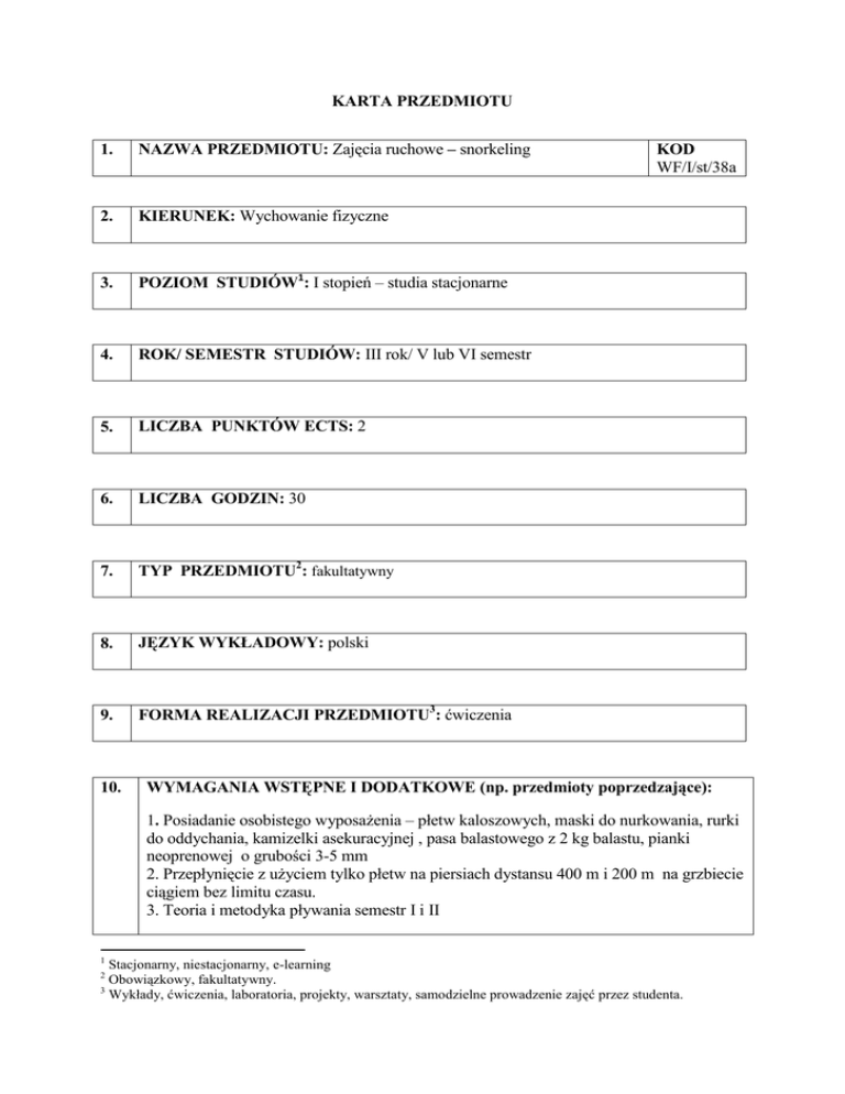 KARTA PRZEDMIOTU 1. NAZWA PRZEDMIOTU: Zajęcia ruchowe – snorkeling 2. KIERUNEK: Wychowanie fizyczne 3. POZIOM STUDIÓW1: I stopień – studia stacjonarne 4. ROK/ SEMESTR STUDIÓW: III rok/ V lub VI semestr 5. LICZBA PUNKTÓW ECTS: 2 6. LICZBA GODZIN: 30 7. TYP PRZEDMIOTU2: fakultatywny 8. JĘZYK WYKŁADOWY: polski 9. FORMA REALIZACJI PRZEDMIOTU3: ćwiczenia 10. KOD WF/I/st/38a WYMAGANIA WSTĘPNE I DODATKOWE (np. przedmioty poprzedzające): 1. Posiadanie osobistego wyposażenia – płetw kaloszowych, maski do nurkowania, rurki do oddychania, kamizelki asekuracyjnej , pasa balastowego z 2 kg balastu, pianki neoprenowej o grubości 3-5 mm 2. Przepłynięcie z użyciem tylko płetw na piersiach dystansu 400 m i 200 m na grzbiecie ciągiem bez limitu czasu. 3. Teoria i metodyka pływania semestr I i II 1 Stacjonarny, niestacjonarny, e-learning Obowiązkowy, fakultatywny. 3 Wykłady, ćwiczenia, laboratoria, projekty, warsztaty, samodzielne prowadzenie zajęć przez studenta. 2 11. CEL PRZEDMIOTU: Przygotowanie studentów do uprawiania snorkelingu czyli nurkowania z maską , fajką i w płetwach poprzez zapoznanie studentów z: wyposażeniem do uprawiania snorkelingu; ćwiczeniami kontroli oddychania na lądzie i w wodzie; ćwiczeniami i zadaniami pływania po powierzchni wody i pod powierzchnią wody w płetwach i bez płetw; zabawami i grami podwodnymi; zasadami bezpiecznego uprawiania snorkelingu. 12. PRZEDMIOTOWE EFEKTY KSZTAŁCENIA4 P_W01. Ma wiedzę o przystosowaniu ciała do Odniesienie do kierunkowych efektów kształcenia (symbol) Odniesienie do obszarowych efektów kształcenia i standardów kształcenia nauczycieli (symbol) K_W02 M1_W01 M1_W02 M1_W07 M1_W10 SN_Wa wody. Zna przeznaczenie sprzętu ABC (maska, płetwy, rurka), kamizelki asekuracyjnej i K_W27 skafandra. P_W02. Zna sposoby pływania po powierzchni wody K_W19 M1_W12 K_W01 M1_W01 M1_W02 SN_Wa K_W02 M1_W01 M1_W02 SN_Wa K_W20 M1_W08 M1_W11 M1_W12 K_U21 M1_U01 M1_U03 M1_U07 M1_U11 SN_Uc w płetwach i bez płetw oraz pod powierzchnią wody. P_W03. Potrafi wyjaśnić wpływ ciśnienia na organizm podczas zanurzania się i pływania pod powierzchnią wody. Zna sposoby kompensacji maski i uszu. P_W04. Zna reakcje organizmu na pływanie pod powierzchnią wody na wstrzymanym oddechu. Ma wiedzę o przystosowaniu ciała do zatrzymanego oddechu. P_W05. Zna zagrożenia ze strony środowiska wodnego -flory i fauny, dla osób uprawiających snorkeling. P_U01. Potrafi dopasować maskę, fajkę i płetwy. Posiada kontrolę nad sposobami oddychania przez fajkę w pływaniu po powierzchni i pod powierzchnią wody. 4 Efekty kształcenia w zakresie wiedzy (P_W), umiejętności (P_U) i kompetencji społecznych (P_K). P_U02. Posiada umiejętność zanurzania się i K_U20 M1_W08 M1_W11 M1_W12 K_U21 M1_U01 M1_U03 M1_U07 M1_U11 SN_Uc M1_W08 M1_W11 M1_W12 wynurzania z kontrolą powierzchni wody. Posiada umiejętność kompensacji uszu i maski. Zna postępowanie w przypadku kurczu mięśni nogi w wodzie głębokiej. P_U03. Posiada umiejętność korzystania z kamizelki asekuracyjnej zarówno w pływaniu po powierzchni wody, jak i pod powierzchnią wody. P_U04. Potrafi kontrolować zatrzymany oddech K_U20 w bezruchu i podczas pływania w zanurzeniu. Potrafi pokazać umiejętności udzielenia pomocy w wodzie osobom zmęczonym lub w stresie. P_K01. Potrafi uzasadnić potrzebę ustawicznego K_K01 usprawniania się w umiejętnościach kontroli oddychania, pływania sportowego i pływania pod wodą na wstrzymanym oddechu. P_K02. Posiada umiejętność samooceny w K_K06 zakresie poziomu umiejętności pływania w sprzęcie ABC i bez. Potrafi wymienić korzyści M1_K01 M1_K03 M1_K04 M1_K06 M1_K09 SN_Kf M1_K01 M1_K02 M1_K06 M1_K09 zdrowotne uprawiania snorkelingu. P_K03. Potrafi uzasadnić potrzebę ochrony środowiska podwodnego jako dziedzictwa kulturowego i światowego. K_K10 M1_K03 SN_Kb 13. METODY OCENY EFEKTÓW KSZTAŁCENIA Symbol przedmiotowego efektu kształcenia P_W01 Metody (sposoby) oceny5 Typ oceny6 Forma dokumentacji ocenianie ciągłe formująca zapis w dzienniku zajęć P_W02 ocenianie ciągłe formująca zapis w dzienniku zajęć P_W03 ocenianie ciągłe formująca zapis w dzienniku zajęć zaliczenie ustne P_W04 ocenianie ciągłe formująca zaliczenie ustne P_U01 ocena umiejętności formująca zapis w dzienniku zajęć P_U02 ocena umiejętności formująca zapis w dzienniku zajęć P_U03 sprawdzian umiejętności podsumowująca zapis w dzienniku zajęć P_U04 sprawdzian umiejętności podsumowująca zapis w dzienniku zajęć P_K01 ocenianie ciągłe formująca zapis w dzienniku zajęć P_K02 ocenianie ciągłe formująca zapis w dzienniku zajęć podsumowująca praca pisemna zaliczenie ustne P_K03 zaliczenie pisemne 14. TREŚCI PROGRAMOWE Forma zajęć7 Treść zajęć (liczba godz.) 1. Zapoznanie studenta z celami, efektami kształcenia i sposobami programowymi, ich weryfikacji, literaturą oraz treściami ćwiczenia (2) Symbol przedmiotowych efektów kształcenia P_W01, P_K03 sprawami organizacyjnymi. Przystosowanie ciała do wody. Flora i fauna mórz ciepłych. Wyposażenie do zajęć. 2. Dopasowanie sprzętu ABC (maska, płetwy, rurka). 5 ćwiczenia (2) P_W01, P_W02, Ocenianie ciągłe (bieżące przygotowanie do zajęć), śródsemestralne zaliczenie pisemne, śródsemestralne zaliczenie ustne, końcowe zaliczenia pisemne, końcowe zaliczenia ustne, egzamin pisemny, egzamin ustny, praca semestralna, ocena umiejętności ruchowych, praca dyplomowa, projekt, kontrola obecności 6 Formująca, podsumowująca. 7 Wykłady, ćwiczenia, laboratoria, samodzielne prowadzenie zajęć przez studenta. Kontrola nad sposobami oddychania na lądzie. P_U01 System partnerski w snorkelingu. Pływanie po powierzchni wody w płetwach i bez płetw omówienie i realizacja. 3. Przystosowanie ciała do bezdechu. Wpływ ciśnienia na organizm podczas zanurzania się ćwiczenia (2) P_U01, P_U02, ćwiczenia (2) P_U01, P_U03, ćwiczenia (2) P_U01, P_U02 ćwic