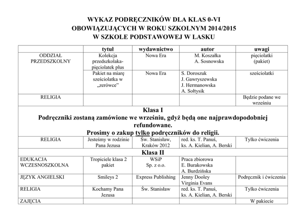 WYKAZ PODRĘCZNIKÓW DLA KLAS 0-VI OBOWIĄZUJĄCYCH W ROKU SZKOLNYM 2014/2015 W SZKOLE PODSTAWOWEJ W LASKU ODDZIAŁ PRZEDSZKOLNY tytuł wydawnictwo Kolekcja przedszkolakapięciolatek plus Pakiet na miarę sześciolatka w „zerówce” Nowa Era Nowa Era autor M. Koszałka A. Sosnowska S. Doroszuk J. Gawryszewska J. Hermanowska A. Sołtysik uwagi pięciolatki (pakiet) sześciolatki Będzie podane we wrześniu RELIGIA Klasa I Podręczniki zostaną zamówione we wrześniu, gdyż będą one najprawdopodobniej refundowane. Prosimy o zakup tylko podręczników do religii. RELIGIA Jesteśmy w rodzinie Pana Jezusa Św. Stanisław, Kraków 2012 red. ks. T. Panuś, ks. A. Kielian, A. Berski Tylko ćwiczenia Klasa II EDUKACJA WCZESNOSZKOLNA JĘZYK ANGIELSKI RELIGIA ZAJĘCIA Tropiciele klasa 2 pakiet WSiP Sp. z o.o. Smileys 2 Express Publishing Kochamy Pana Jezusa Św. Stanisław Praca zbiorowa E. Burakowska A. Burdzińska Jenny Dooley Virginia Evans red. ks. T. Panuś, ks. A. Kielian, A. Berski Podręcznik i ćwiczenia Tylko ćwiczenia W pakiecie KOMPUTEROWE Klasa III EDUKACJA WCZESNOSZKOLNA JĘZYK ANGIELSKI Wesoła szkoła i przyjaciele WSiP Sp. z o.o. New Sparks 3. Podręcznik dla szkoły podstawowej Oxford University Press Polska Sp. z o.o. H. Dobrowolska, A. Konieczna, W. Dziabaszewski, M. Zdrajkowska, J. Hanisz, B. Lewandowska P.A. Davies, C. Graham, M. Szpotowicz, M. Szulc- Kurpaska Pakiet Podręcznik i ćwiczenia Będzie podane we wrześniu W pakiecie RELIGIA ZAJĘCIA KOMPUTEROWE Klasa IV JĘZYK POLSKI JĘZYK ANGIELSKI RELIGIA HISTORIA I SPOŁECZEŃSTWO MATEMATYKA PRZYRODA Czarowanie słowem Today 2 Słuchamy Pana Boga Historia wokół nas Matematyka z kluczem Tajemnice przyrody. Podręcznik dla klasy 4 WSiP Sp. z o.o. Pearson A. Kania, K. Kwak, J. Majchrzak-Broda Tamzin Thompson David Todd Św. Stanisław, red. ks. T. Panuś, ks. A. Kraków Kielian, A. Berski WSiP R. Lolo, A. Pieńkowska, Sp. z o.o. R. Towalski Nowa Era M. Dobrowolska, Sp. z o. o. M. Jucewicz, P. Zarzycki Nowa Era Sp. z o.o. M. Marko- Worłowska, F. Szlajfer, J. Stawarz Podręcznik cz. I-V oraz zeszyt ćwiczeń Książka ucznia 2 i ćwiczenia Podręcznik i zeszyt ćwiczeń obowiązkowo Podręcznik 2cz, ćwiczenia, zbiór zadań Obowiązkowe ćwiczenia ( okładka książki z liściem i mrówkami- nowa podstawa programowa) MUZYKA ZAJĘCIA TECHNICZNE Klucz do muzyki. Podręcznik dla klasy 4 szkoły podstawowej Zajęcia techniczne. Część komunikacyjna. Podręcznik dla szkoły podstawowej. WSiP Sp. z o.o. U. Smoczyńska, K. Jakóbczak-Drążek, A. Sołtysik OPERON Sp. z o.o. U. Białka, J. Chrabąszcz ZAJĘCIA KOMPUTEROWE PLASTYKA Brak podręcznika Brak podręcznika Klasa V JĘZYK POLSKI JĘZYK ANGIELSKI RELIGIA HISTORIA I SPOŁECZEŃSTWO MATEMATYKA PRZYRODA Ciekawi świata Operon New English Zone 3. Oxford University Press Polska Sp. z o.o. Św. Stanisław, Kraków WSiP Sp. z o.o. Gdańskie Wydawnictwo Oświatowe M. Dobrowolska Sp. j. Nowa Era Sp. z o.o. Wierzymy w Pana Boga Historia wokół nas Matematyka z plusem Tajemnice przyrody 5 I. Rawicz R. Nolasco, D. Newbold red. ks. T. Panuś, ks. A. Kielian, A. Berski R. Lolo, A. Pieńkowska, R. Towalski M. Dobrowolska, M. Jucewicz, M. Karpiński, P. Zarzycki J. Ślosarczyk, R. Kozik, F. Szlajfer Podręcznik i ćwiczenia Książka i ćwiczenia podręcznik i zeszyt ćwiczeń ( 3 części) Obowiązkowe ćwiczenia ZAJĘCIA KOMPUTEROWE ZAJĘCIA TECHNICZNE MUZYKA Brak podręcznika Brak podręcznika Klucz do muzyki. Podręcznik. Szkoła podstawowa. Klasa 5 WSiP Sp. z o.o. U. Smoczyńska, K. Jakóbczak-Drążek, A. Sołtysik Brak podręcznika PLASTYKA Klasa VI JĘZYK POLSKI Czarowanie słowem WSiP JĘZYK ANGIELSKI New English Zone 4 Oxford University Press Polska Sp. z o.o. Św. Stanisław RELIGIA HISTORIA MATEMATYKA PRZYRODA INFORMATYKA PLASTYKA MUZYKA W kościele umacniamy wiarę Historia wokół nas Matematyka z plusem Tajemnice przyrody Nowa podstawa programowa WSiP Sp. z o.o. Gdańskie Wydawnictwp Oświatowe M. Dobrowolska Sp. j. Nowa Era Sp. z o.o. A. Kania, K. Kwak, J. Podręcznik i zeszyt Majchrzak- Broda ćwiczeń C.Lawday, M. Hancock Podręcznik i repetytorium red. ks. T. Panuś, ks. A. Kielian, A. Berski R. Lolo, A. Pieńkowska, R. Towalski M. Dobrowolska, M. Karpiński, P. Zarzycki J. Stawarz F. Szlajfer H. Kowalczyk Podręcznik i zeszyt ćwiczeń ( 3 części) Obowiązkowe ćwiczenia Brak podręcznika Brak podręcznika Klucz do muzyki. Podręcznik. Szkoła Podstawowa. Klasa VI WSiP Sp. z o.o. U. Smoczyńska, K. Jakóbczak-Drążek, A. Sołtysik