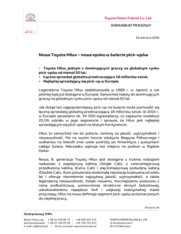 13 czerwca 2016 Nowa Toyota Hilux – nowa epoka w świecie pick-upów • Toyota Hilux jednym z dominujących graczy na globalnym rynku pick-upów od niemal 50 lat; • Łączna sprzedaż globalna przekraczająca 18 milionów sztuk; • Najlepiej sprzedający się pick-up w Europie. Legendarna Toyota Hilux zadebiutowała w 1968 r. w Japonii, a rok później była już dostępna w Europie. Samochód należy do dominujących graczy na globalnym rynku pick-upów od niemal 50 lat. Jak dotąd ten najpopularniejszy pick-up na świecie może pochwalić się łączną sprzedażą globalną przekraczającą 18 milionów sztuk. W 2015 r. w Europie sprzedano ok. 34 000 egzemplarzy, co zapewnia modelowi 23,1% udziału w jego segmencie i sprawia, że Hilux jest najlepiej sprzedającym się pick-upem na Starym Kontynencie. Hilux to samochód nie do pobicia, ceniony za jakość, wytrzymałość i niezawodność. Ma na swoim koncie zdobycie Bieguna Północnego i wulkanów na Islandii oraz wiele podróży po Antarktyce i pustyniach całego świata. Nierzadko zajmuje też miejsca na podium w Rajdzie Dakar. Nowa, 8. generacja Toyoty Hilux jest dostępna z trzema rodzajami nadwozia: z pojedynczą kabiną (Single Cab), z czteromiejscową przedłużoną kabiną (Extra Cab) i pięciomiejscową podwójną kabiną (Double Cab). Auto potwierdza doskonałą reputację budowaną od wielu lat i oferuje niezmiennie najwyższą jakość, wytrzymałość, a także legendarną niezawodność. Dzięki nowemu, mocniejszemu podwoziu z ramą podłużnicową, wzmocnionej strukturze skrzyni ładunkowej, udoskonalonemu napędowi 4x4 i większej maksymalnej masie przyczepy, Hilux na nowo definiuje segment pick-upów przeznaczonych do ciężkiej pracy. Strona 1 z 26 Jednocześnie nowa Toyota Hilux jest odpowiedzią na tendencję coraz częstszego wykorzystywania pick-upów do rekreacji, dlatego otrzymała nowy, uwspółcześniony design, oferuje też większą wygodę, bogate wyposażenie, nowoczesne technologie i wysoki standard bezpieczeństwa. Wszystko to sprawia, że jazda nowym stylowym Hiluxem jest bardziej komfortowa i przyjemna niż dotąd. Aby spełnić oczekiwania użytkowników, którzy domagają się zarówno wytrzymałego samochodu do pracy, jak i eleganckiego, wygodnego pojazdu z napędem 4x4 do celów rekreacyjnych, konstruktorzy nowego Hiluxa wprowadzili istotne udoskonalenia w sześciu kluczowych obszarach: Design – solidność i wytrzymałość połączone z jeszcze lepszym dopracowaniem szczegółów oraz atrakcyjny wygląd, który zadowoli wszystkich użytkowników, zarówno indywidualnych, jak i biznesowych. Komfort – obszerniejsze i wygodniejsze wnętrze łączące praktyczne i funkcjonalne rozwiązania typowe dla SUV-ów, z niskim poziomem hałasu, drgań i uciążliwości, porównywalnym z samochodami osobowymi. Bezpieczeństwo – wytrzymała struktura nadwozia skutecznie pochłaniająca uderzenia; system Toyota Safety Sense obejmujący układ wczesnego reagowania w razie ryzyka zderzenia (PCS) z funkcją wykrywania pieszych oraz układy ostrzegania o niezamierzonej zmianie pasa ruchu (LDA) i rozpoznawania znaków drogowych (RSA – opcja dostępna dla wersji SR i SR5), a także zaawansowane systemy sterowania hamowaniem, w tym ABS, EBD, VSC i TSC. Jakość, wytrzymałość i niezawodność – nowe, mocniejsze podwozie z ramą podłużnicową, wzmocniona struktura skrzyni ładunkowej oraz system aktywnej kontroli trakcji (A-TRC), system asystujący przy zjeździe ze wzniesienia (DAC) oraz system wspomagający pokonywanie podjazdu (HAC), dzięki którym wersja z napędem 4x4 dorównuje w terenie modelowi Land Cruiser. Znakomite parametry użytkowe – większa, mocniejsza i bardziej praktyczna skrzynia ładunkowa oraz zwiększona do 3,5 tony Strona 2 z 26 maksymalna masa przyczepy. Ładowność to również parametr, który został znacząco poprawiony. Wszystkie dostępne na polskim rynku wersje będą zapewniały ładowność na poziomie minimum 1000 kg, co jest rewelacyjnym wynikiem. Niskie całkowite koszty użytkowania – nowy silnik D-4D o pojemności 2,4 l, charakteryzujący się najlepszymi w segmencie parametrami zużycia paliwa. Mocniejszy, silniejszy i lepiej przygotowany do jazdy po bezdrożach niż kiedykolwiek – ten całkowicie nowy model Toyoty to w dalszym ciągu legendarny Hilux. Jednocześnie auto zapowiada nową epokę w segmencie pick-upów, oferując styl, wygodę, bezpieczeństwo i zaawansowane technologie niespotykane dotąd w popularnych pickupach. Zgodnie z prognozami nowa Toyota Hilux – odpowiadająca na zróżnicowane potrzeby jeszcze szerszego grona odbiorców – będzie sprzedawać się w Europie w tempie 40 tys. sztuk rocznie. STYLISTYKA • Solidność i wytrzymałość połączone z jeszcze lepszym dopracowaniem szczegółów; • Przestronniejsze wnętrze zapewniające komfort na poziomie porównywalnym z samochodami klasy SUV; • Większa, solidniejsza i praktyczniejsza skrzynia ładunkowa. Stylistyka nadwozia – wytrzymałość zdefiniowana na nowo Wytrzymałość i solidność cechujące wszystkie generacje tego modelu połączono teraz z dopracowaniem szczegółów na całkiem nowym poziomie – zgodnie z oczekiwaniami rosnącego rynku użytkowników w tym segmencie. Dzięki temu nowa gama modeli Hilux to niezwykle atrakcyjne pick-upy nowej generacji. Przód auta łączy elegancki styl zgodny z językiem stylistycznym Keen Look, zastosowany w ujednoliconej konstrukcji górnego grilla i przednich reflektorów, z solidnością mocnego zderzaka z dużym dolnym Strona 3 z 26 wlotem powietrza w stylu Under Priority. Drugi poziomy pas górnego grilla przebiega przez całą szerokość samochodu, przechodząc w przeprojektowane przednie reflektory i unikalne światła do jazdy dziennej z 12 białymi diodami LED (dostępne w wersji SR5). Nowe przednie reflektory z umieszczonym po boku zintegrowanym emblematem „Hilux” zachodzą na błotniki, co dodatkowo podk