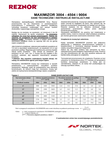 ® 1701MAX4PLPL MAXIMIZOR 3004 - 4504 i 9004 DANE TECHNICZNE I INSTRUKCJE INSTALACYJNE Wentylatory destratyfikacyjne MAXIMIZOR firmy Reznor przeznaczone są do stosowania w pomieszczeniach przemysłowych i handlowych, aby zapewnić dodatkową cyrkulację powietrza, zwiększając tym samym komfort środowiska i zapewniając oszczędność energii. Nadają się do montażu na wysokości, od (minimum) 3 do 30 metrów, mierzonych do spodu urządzenia. Ta minimalna odległość 3m musi być zawsze przestrzegana. Należy się upewnić, że urządzenie nie jest zainstalowane w zasięgu żadnych ludzi! Pomiędzy dachem a sufitem powinna być zachowana odległość równa co najmniej 300 mm do górnej części urządzenia. Jako kryterium projektowe, zalecana jest prędkości powietrza od 1,0 m/s w warunkach izotermicznych, na wysokości 2,0 m nad poziomem podłogi. Regulacja jest możliwa przy pomocy łopatek żaluzji wylotu powietrza. Gdy żaluzje są ustawione, jak pokazano na rys. 1a/b i rys. 3, muszą one być wygięte w obu punktach ustawień, aby zapewnić równomierny przepływ powietrza. UWAGA: Aby zapobiec uszkodzeniu łopatek żaluzji, nie należy ich wielokrotnie zginać pod dużym kątem. Wentylatory MAXIMIZOR muszą być instalowane w sposób podwieszany, z wykorzystaniem wszystkich punktów zawieszenia. Materiały użyte do podwieszenia oraz elementy konstrukcyjne, do których mają być mocowane, muszą być zdolne do wytrzymania dziesięciokrotnego ciężaru urządzenia. Tabela 1 Zawiesia łańcuchowe itp. muszą być ustawione pod kątem 20° (patrz rysunek 6) względem do pionu, aby upewnić się, że podczas uruchamiania i eksploatacji nie nastąpi ruch obrotowy. Sztywne zawiesia nie są zalecane, ponieważ mogą spowodować przenoszenie hałasu przez elementy konstrukcyjne budynku. Wentylatory MAXIMIZOR nie powinny być instalowane w pobliżu ściany, może to zniszczyć układ przepływu powietrza, jak również generować zawirowania obwodowe i hałas. Urządzenia te muszą być uziemione. Każdy wentylator MAXIMIZOR powinien być połączony elektrycznie z oddzielnym dwuprzerwowym izolatorem z bezpiecznikiem o minimalnej separacji kontaktu 3,0 mm między wszystkimi biegunami biegunami. Zaleca się, aby takie izolatory były zamykane na klucz, zabezpieczone przed dostępem niepowołanych osób. Powinny one być zainstalowane tak, aby były wyraźnie widoczne dla każdej osoby pracującej na urządzeniu. Termostat jest przymocowany do urządzenia. Powinien on być ustawiony na temperaturę pracy 5°C wyższą niż temperatura komfortu termicznego przestrzeni, w której jest on zainstalowany. Zapewni to, że osoby tam przebywające nie odczują czynników chłodu. DANE EKSPLOATACYJNE Kąt ustawienia żaluzji L° Główny strumień powietrza Vpierw (m³/h) Obszar skutecznego oddziaływania AxA (m²) (rys 5) Wysokość montażu do podłogi H (m) (rys. 5) Wielkość modelu 3004 4504 9004 3004 4504 9004 3004 4504 9004 0° 3000 4440 8840 12,0 19,5 27,0 3,0 4,0 6,0 15° 2900 4300 8620 6,5 10,5 13,5 5,0 6,0 9,0 30° 2830 4150 8400 5,5 9,0 11,0 8,0 13,0 19,0 45° 2780 4000 8180 4,5 7,0 8,5 10,0 17,0 25,0 60° 2730 3800 7960 3,5 5,5 6,0 11,0 19,0 29,0 75° 2670 3600 7740 3,0 4,0 4,0 11,0 19,8 29,0 Ilość wymaganych wentylatorów MAXIMIZOR może zostać określona na podstawie poniższego wzoru: n = Gdzie: Vx2 V prim x 1,5 n = ilość wymaganych wentylatorów MAXIMIZOR (zaokrąglić w górę) V = wielkość budynku m3 Vpierw = Pierwotna objętość powietrza z tabeli 1 Z zastrzeżeniem zmian bez wcześniejszego powiadomienia . 1/4 Wpływ gradientu temperatury na zalecaną wysokość montażową Tabela 2a: MAXIMIZOR 3004 Położenie żaluzji 0°C. 5°C. 10°C. 15°C. 20°C. 0° 12,1 10,8 10,3 9,9 9,7 15° 6,3 5,9 5,7 5,6 5,5 30° 5,4 5,1 4,9 4,9 4,8 45° 4,5 4,3 4,2 4,1 4,1 60° 3,6 3,4 3,4 3,3 3,3 75° 3,0 3,0 3,0 3,0 3,0 Położenie żaluzji 0°C. 5°C. 10°C. 15°C. 20°C. 0° 19,5 16,9 16,1 15,5 15,1 15° 10,5 9,5 9,1 9,0 8,8 30° 9,0 7,9 7,6 7,5 7,3 45° 7,0 6,2 6,0 5,9 5,8 60° 5,5 4,6 4,5 4,4 4,4 75° 4,0 3,2 3,1 3,1 3,0 Położenie żaluzji 0°C. 5°C. 10°C. 15°C. 20°C. 0° 27 23,2 21,9 21,1 20,5 15° 13,5 11,5 11,1 10,8 10,6 30° 11,0 9,5 9,2 9,0 8,8 45° 8,5 7,4 7,2 7,1 6,9 60° 6,0 5,4 5,3 5,2 5,1 75° 4,0 3,6 3,5 3,5 3,4 Tabela 2b: MAXIMIZOR 4504 Tabela 2c: MAXIMIZOR 9004 . 2/4 Tabela 4 : WYMIARY (Rys. 2 i 4) Tabela 3 : DANE TECHNICZNE OPIS 3004 4504 9004 230V 1 ~ N 50Hz Zasilanie i przyłącza # Prędkość wentylatora (obr/ min.) 920 1350 1310 Prąd pracy A 0.52 1.15 2.40 Pobór mocy kW 0.108 0.250 0.520 Poziom hałasu (l) dB(A) 45 53 60 Waga netto kg 13 16 23 (1) : r=5m; Q=1; A=160m² WYMIARY (mm) 3004 4504 A Wysokość podwieszenia 222 528 583 B Całkowita wysokość 330 671 732 515 626 4 4 475 565 555 665 C Lok. punktów pod wies zeni a 462x450 ilość 4 D średn. korpusu E Całkowita średnica 500 502 MAXIMIZOR 4504 - 9004 Ustawienia żaluzji WYMIARY (tol +/- 2mm) Rys. 2 Rys. 1a : Maximizor 4504 Rys. 1b : Maximizor 9004 1 2 3 . 3/4 Termostat Punkty podwieszenia średnica 10mm Regulowane żaluzje (0°-75°) 9004 WZÓR PIĘTRA MAXIMIZOR 3004 MAXIMIZOR 3004, 4504 & 9004 USTAWIENIE ŻALUZJI Rys. 3 Rys. 5 WYMIARY (tol. +/- 2mm) Rys. 4 KRYTERIA PODWIESZENIA MAXIMIZOR 3004, 4504 & 9004 Rys. 6 Producent Nortek Global HVAC Belgium nv J&M Sabbestraat 130/A000 B-8930 Menen, Belgia Tel. +32 (0)56 52 95 11 Fax +32 (0)56 52 95 33 www.reznor.eu 1 2 3 Dystrybutor na terenie Polski Best Poland Sp. z o.o. ul. Pyskowicka 19 41-807 Zabrze NIP 634-25-63-502 KRS 233751 Kapitał zakładowy 50.000.000 zł Termostat Punkty podwieszenia średnica 10mm Regulowane żaluzje (0°-75°) 4/4