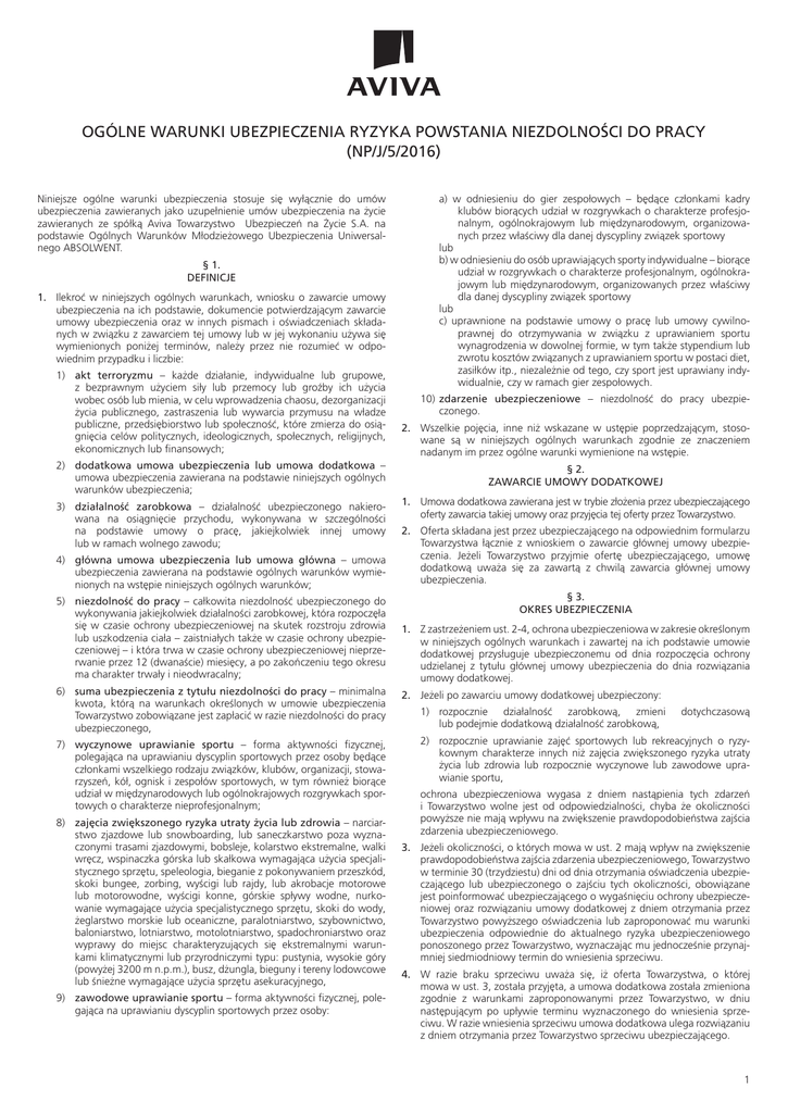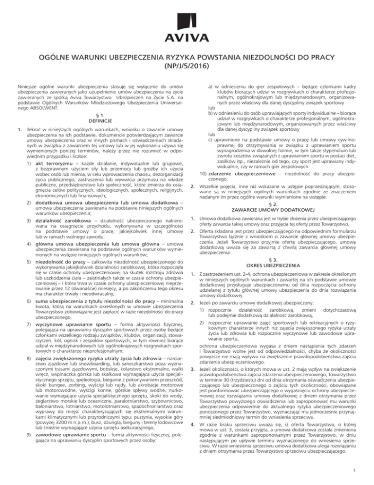 OGÓLNE WARUNKI UBEZPIECZENIA RYZYKA POWSTANIA NIEZDOLNOŚCI DO PRACY (NP/J/5/2016) a) w odniesieniu do gier zespołowych – będące członkami kadry klubów biorących udział w rozgrywkach o charakterze profesjonalnym, ogólnokrajowym lub międzynarodowym, organizowanych przez właściwy dla danej dyscypliny związek sportowy lub b) w odniesieniu do osób uprawiających sporty indywidualne – biorące udział w rozgrywkach o charakterze profesjonalnym, ogólnokrajowym lub międzynarodowym, organizowanych przez właściwy dla danej dyscypliny związek sportowy lub c) uprawnione na podstawie umowy o pracę lub umowy cywilnoprawnej do otrzymywania w związku z uprawianiem sportu wynagrodzenia w dowolnej formie, w tym także stypendium lub zwrotu kosztów związanych z uprawianiem sportu w postaci diet, zasiłków itp., niezależnie od tego, czy sport jest uprawiany indywidualnie, czy w ramach gier zespołowych. Niniejsze ogólne warunki ubezpieczenia stosuje się wyłącznie do umów ubezpieczenia zawieranych jako uzupełnienie umów ubezpieczenia na życie zawieranych ze spółką Aviva Towarzystwo Ubezpieczeń na Życie S.A. na podstawie Ogólnych Warunków Młodzieżowego Ubezpieczenia Uniwersalnego ABSOLWENT. § 1. DEFINICJE 1. Ilekroć w niniejszych ogólnych warunkach, wniosku o zawarcie umowy ubezpieczenia na ich podstawie, dokumencie potwierdzającym zawarcie umowy ubezpieczenia oraz w innych pismach i oświadczeniach składanych w związku z zawarciem tej umowy lub w jej wykonaniu używa się wymienionych poniżej terminów, należy przez nie rozumieć w odpowiednim przypadku i liczbie: 1) akt terroryzmu – każde działanie, indywidualne lub grupowe, z bezprawnym użyciem siły lub przemocy lub groźby ich użycia wobec osób lub mienia, w celu wprowadzenia chaosu, dezorganizacji życia publicznego, zastraszenia lub wywarcia przymusu na władze publiczne, przedsiębiorstwo lub społeczność, które zmierza do osiągnięcia celów politycznych, ideologicznych, społecznych, religijnych, ekonomicznych lub finansowych; 2) dodatkowa umowa ubezpieczenia lub umowa dodatkowa – umowa ubezpieczenia zawierana na podstawie niniejszych ogólnych warunków ubezpieczenia; 3) działalność zarobkowa – działalność ubezpieczonego nakierowana na osiągnięcie przychodu, wykonywana w szczególności na podstawie umowy o pracę, jakiejkolwiek innej umowy lub w ramach wolnego zawodu; 10)zdarzenie ubezpieczeniowe – niezdolność do pracy ubezpieczonego. 2. Wszelkie pojęcia, inne niż wskazane w ustępie poprzedzającym, stosowane są w niniejszych ogólnych warunkach zgodnie ze znaczeniem nadanym im przez ogólne warunki wymienione na wstępie. § 2. ZAWARCIE UMOWY DODATKOWEJ 1. Umowa dodatkowa zawierana jest w trybie złożenia przez ubezpieczającego oferty zawarcia takiej umowy oraz przyjęcia tej oferty przez Towarzystwo. 4) główna umowa ubezpieczenia lub umowa główna – umowa ubezpieczenia zawierana na podstawie ogólnych warunków wymienionych na wstępie niniejszych ogólnych warunków; 2. Oferta składana jest przez ubezpieczającego na odpowiednim formularzu Towarzystwa łącznie z wnioskiem o zawarcie głównej umowy ubezpieczenia. Jeżeli Towarzystwo przyjmie ofertę ubezpieczającego, umowę dodatkową uważa się za zawartą z chwilą zawarcia głównej umowy ubezpieczenia. 5) niezdolność do pracy – całkowita niezdolność ubezpieczonego do wykonywania jakiejkolwiek działalności zarobkowej, która rozpoczęła się w czasie ochrony ubezpieczeniowej na skutek rozstroju zdrowia lub uszkodzenia ciała – zaistniałych także w czasie ochrony ubezpieczeniowej – i która trwa w czasie ochrony ubezpieczeniowej nieprzerwanie przez 12 (dwanaście) miesięcy, a po zakończeniu tego okresu ma charakter trwały i nieodwracalny; 1. Z zastrzeżeniem ust. 2-4, ochrona ubezpieczeniowa w zakresie określonym w niniejszych ogólnych warunkach i zawartej na ich podstawie umowie dodatkowej przysługuje ubezpieczonemu od dnia rozpoczęcia ochrony udzielanej z tytułu głównej umowy ubezpieczenia do dnia rozwiązania umowy dodatkowej. 6) suma ubezpieczenia z tytułu niezdolności do pracy – minimalna kwota, którą na warunkach określonych w umowie ubezpieczenia Towarzystwo zobowiązane jest zapłacić w razie niezdolności do pracy ubezpieczonego, 7) wyczynowe uprawianie sportu – forma aktywności fizycznej, polegająca na uprawianiu dyscyplin sportowych przez osoby będące członkami wszelkiego rodzaju związków, klubów, organizacji, stowarzyszeń, kół, ognisk i zespołów sportowych, w tym również biorące udział w międzynarodowych lub ogólnokrajowych rozgrywkach sportowych o charakterze nieprofesjonalnym; 8) zajęcia zwiększonego ryzyka utraty życia lub zdrowia – narciarstwo zjazdowe lub snowboarding, lub saneczkarstwo poza wyznaczonymi trasami zjazdowymi, bobsleje, kolarstwo ekstremalne, walki wręcz, wspinaczka górska lub skałkowa wymagająca użycia specjalistycznego sprzętu, speleologia, bieganie z pokonywaniem przeszkód, skoki bungee, zorbing, wyścigi lub rajdy, lub akrobacje motorowe lub motorowodne, wyścigi konne, górskie spływy wodne, nurkowanie wymagające użycia specjalistycznego sprzętu, skoki do wody, żeglarstwo morskie lub oceaniczne, paralotniarstwo, szybownictwo, baloniarstwo, lotniarstwo, motolotniarstwo, spadochroniarstwo oraz wyprawy do miejsc charakteryzujących się ekstremalnymi warunkami klimatycznymi lub przyrodniczymi typu: pustynia, wysokie góry (powyżej 3200 m n.p.m.), busz, dżungla, bieguny i tereny lodowcowe lub śnieżne wymagające użycia sprzętu asekuracyjnego, 9) zawodowe uprawianie sportu – forma aktywności fizycznej, polegająca na uprawianiu dyscyplin sportowych przez osoby: § 3. OKRES UBEZPIECZENIA 2. Jeżeli po zawarciu umowy dodatkowej ubezpieczony: 1) rozpocznie działalność zarobkową, zmieni lub podejmie dodatkową działalność zarobkową, dotychczasową 2) rozpocznie uprawianie zajęć spo