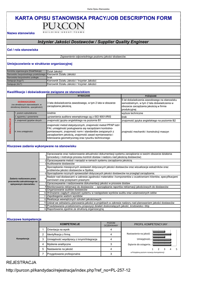 Karta Opisu Stanowiska KARTA OPISU STANOWISKA PRACY/JOB DESCRIPTION FORM Nazwa stanowiska Inżynier Jakości Dostawców / Supplier Quality Engineer Cel / rola stanowiska Zapewnienie odpowiedniego poziomu jakości dostawców. Umiejscowienie w strukturze organizacyjnej Komórka organizacyjna (Dział/Sekcja): Stanowisko bezpośredniego przełożonego: Stanowiska bezpośrednio podległe: Zastępuje (kogo?): Zastępuje (kto?): Dział Jakości Kierownik Działu Jakości brak Kierownik Działu Jakości / Inzynier Jakości Kierownik Działu Jakości / Inzynier Jakości Kwalifikacje i doświadczenie związane ze stanowiskiem POŻĄDANE WYMAGANE DOŚWIADCZENIA (na określonych stanowiskach, w określonej dziedzinie, specjalności) 3 lata doświadczenia zawodowego, w tym 2 lata w obszarze zarządzania jakością średnie uprawnienia auditora wewnętrznego zg z ISO 9001/IRIS znajomość języka angielskiego na poziomie B1 1. poziom wykształcenia KWALIFIKACJE 2. egzaminy i uprawnienia 3. znajomość języków obcych 5 lat doświadczenia zawodowego na stanowisku samodzielnym, w tym 2 lata doświadczenia w obszarze zarządzania jakością w firmie produkcyjnej wyższe techniczne brak znajomość języka angielskiego na poziomie B2 znajomość metod statystycznych, znajomość metod PPAP lub/i FAI; umiejętność posługiwania się narzędziami kontrolnopomiarowymi, znajomość norm i standardów związanych z znajmość mechaniki i konstrukcji maszyn zarządzaniem jakością, znajomość zasad wymiarowania i tolerowania geometryczneg oraz rysunku technicznego 4. inne umiejętności Kluczowe zadania wykonywane na stanowisku 1 2 3 4 5 6 Zadania realizowane przez pracownika zatrudnionego na opisywanym stanowisku. 7 8 9 10 11 12 13 14 15 Opracowanie oraz nadzorowanie aktualności dokumentacji systemu zarządzania w swoim obszarze działania (procedury i instrukcje procesu kontroli dostaw i nadzoru nad jakością dostawców) Opracowywanie metod i narzędzi w ramach systemu zarządzania jakością Auditowanie dostawców Sporządzanie miesięcznych zestawień dotyczacych jakości dostawców oraz wizualizacja wskaźników oraz problemów jakości dostawców w Spółce; Sporządzanie rocznych sprawozdań dotyczacych jakości dostawców na przegląd zarządzania; Nadzór nad dostawcami w zakresie zgodności materiałów i komponentów z oczekiwniami klientów, specyfikacjami zamówień oraz przepisami prawnymi Opracowywanie i nadzorowanie dokumentacji jakości w procesie dostaw Monitorowanie reklamacji do dostawców – sporządzanie raportów reklamacji jakościowych do dostawców Organizowanie auditów dostawców Wdrażanie ciągłych ulepszeń systemu w następstwie wyników auditu oraz ustanowionych celów Zapobieganie wadom wyrobów Realizacja wewnętrznych szkoleń jakościowych Udział we wdrażaniu planowania jakości w projektach w zakresie nadzoru nad planowaniem jakości dostawców Przedstawianie przełożonemu propozycji działań doskonalących jakość, środowisko i bhp Raportowanie zgodnie ze strukturą organizacyjną Kluczowe kompetencje KOMPETENCJE Kompetencje POZIOM OCZEKIWANY PROFIL KOMPETENCYJNY 1 Orientacja na wynik 4 2 Identyfikacja z firmą 4 3 Umiejętność współpracy z innymi/Integracja 4 Umiejętność… 4 Myślenie analityczne 3 Dążenie do osiagania… 5 Nastawienie na jakość 4 7 Przygotowanie profesjonalne 3 Nastawienie na jakość REJESTRACJA http://purcon.pl/kandydaci/rejestracja/index.php?ref_no=PL 257 12 1 2 3 Pożądany poziom rozwoju kompetencji 4 5