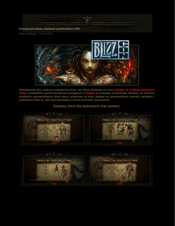 Koncepcyjne obrazy zestawów przedmiotów w DIII! Data publikacji : 24.10.2010 Wczorajszego dnia, podczas prowadzonej przez nas relacji tekstowej na żywo z Diablo III Crafting Sanctuary Panel, omawialiśmy grafiki koncepcyjne dostępnych w Diablo III zestawów przedmiotów. Niestety nie mieliśmy możliwości zaprezentowania Wam owych artworków na żywo, dlatego też postanowiliśmy nadrobić zaległości i przedstawić Wam to, nad czym developerzy mocno pracowali. Zapraszamy! Zestawy zbroi dla wybranych klas postaci. Narzędzia zniszczenia. Ponadto, wspominaliśmy również o możliwości podnoszenia poziomów klejnotów przez Rzemieślnika - Jeweler. Przykładowa grafika z gemami znajduje się poniżej. Autor: Dominik "BeLial" Misiak Data publikacji : 24.10.2010 Data modyfikacji : 24.10.2010 Liczba wyświetleń tekstu: 5429 Tagi: zestawy przedmiotów, grafiki koncepcyjne POWRÓT DRUKUJ PDF POLEĆ ZNAJOMEMU Komentarz (43) dodaj komentarz Ten barbariana set dla mnie swietny. Ale ogolnie przydaly by sie wieksze rozmiary tych screenow, nie da sie odczytac nazw poszczegolnych stopni gemow.~RaQ-HPL 2010/10/24 11:59 ~RaQ-HPL: Sorry, to największy rozmiar jaki mogłem zrobić. Nie mam już opcji High na streamie, nie wiem czemu. Robiłem to na medium. Po powiększeniu napisy mam zamazane niestety :(~BeLial Battlenet Network 2010/10/24 12:01 Maski Doktorka wyglądają niesamowicie..!~Dziarski 2010/10/24 12:07 Dobra robota, oglądałem ten panel jestem pod wrażeniem co tam pokazali. A za screeny thx;) A propo bety : podczas Q&A - padło chociarz jedno stwierdzenie odnośnie oddania jej w ręce graczy : http://www.youtube.com/watch?v=vKe8GqABJ_c&feature=sub 03:56 - podczas "odpowiedzi" na to pytanie ;)~IVIetal 2010/10/24 12:44 Wizard trochę taki mizerny ale nie jest źle. Jedna z dwóch postaci które na pewno wybiorę. A tylko jedna fota jest z Wizem? Czy bedzie jeszcze jakaś druga część? Bo z barbem i WD jest dużo zdjęć a z wizem jest tylko jedno.~Constantine 2010/10/24 13:16 http://www.youtube.com/watch?v=9aPXTNGoa3U Karty Diablo 3 ;P)~J1n 2010/10/24 13:18 Jak dla mnie po prostu awesome!~valdek1990 2010/10/24 13:19 Może kiedyś spełni się moje marzenie o Diablo TCG :D~benlinus 2010/10/24 13:23 Nie mogę się doczekać...~Darku 2010/10/24 13:24 Powiedział o kluczach do bety, ale kiedy i jak będą rozdawane już nie: http://www.youtube.com/watch?v=m__OCu8FjOk&translated=1~AnCiano 2010/10/24 13:47 Ja tam do gry w pokera wolę tradycyjne karty :D A nawet jak się pojawi Diablo TCG to i tak nie będzie nawet w połowie tak dobra jak MtG ;p~d_e_x 2010/10/24 13:59 Kiedy będzie wasz przetłumaczony wywiad wrzucony?~Danfoss 2010/10/24 14:39 Więcej stopni gemów pewno ma na celu zastąpienie run których już w broniach nie będzie. BTW Chyba jeszcze czaszeczki dorzucą:P~kupek 2010/10/24 14:46 Czyli czego właściwie nowego się dowiedzieliśmy na tym Blizzconie? Tylko DH i areny ( o których nie ma za dużo szczegółów) Jestem kompletnie zawiedziony, bo z zapowiedzi wynikało że podadzą dużo więcej wiadomości..~Reni 2010/10/24 14:52 Ja tez czekam na wywiad przetłumaczony bo nie wszystko rozumiem co mowią. Pzdr~az3r 2010/10/24 15:04 Czekam na przetlumaczone Q&A.~Kula Mocy Konia 2010/10/24 15:23 Zostały podane screeny kompletów zbroi ale nie podaliscie screenu z broniami ktore tez wygladaja niesamowicie screen nizej http://img693.imageshack.us/img693/981/toporki.png~Sempajers 2010/10/24 15:34 Nie podobają mi sie te sety barba... Głównie te odsłonięte nogi. Czyli chyba będę grał male DH.~Kazak 2010/10/24 15:37 Fajną sprawą jest ogromna skrytka za której pomocą będziemy mogli dzielić się przedmiotami z innymi postaciami na naszym koncie. Tylko ,że są przedmioty np 2 najlepsze typy run wypadające tylko na piekle... I co będzie można je sobie tak po prostu przerzucać?~Ksuri 2010/10/24 15:41 " Fajną sprawą jest ogromna skrytka za której pomocą będziemy mogli dzielić się przedmiotami z innymi postaciami na naszym koncie. Tylko ,że są przedmioty np 2 najlepsze typy run wypadające tylko na piekle... I co będzie można je sobie tak po prostu przerzucać? " skad posiadasz takie informacje ?~sempajers 2010/10/24 15:47 Z dzisiejszego panelu "pytania i odpowiedzi". (Q&A)~Ksuri 2010/10/24 15:51 oświećcie mnie ludki, bo mamy te gemy: square, rounded i star no i np. jest square, flawless square i .............. square ? (Radiant?)~Rogal 2010/10/24 15:55 1000 kluczy bety zostanie rozlosowanych wśród uczestników Blizzconu. Kiedy ona się rozpocznie - tego nie wie nikt :)~Raum 2010/10/24 16:20 Ale czy to był żart prowadzącego, czy prawda? Ale czy to był żart prowadzącego, czy prawda?~seraf 2010/10/24 16:26 Wydaje się, że to prawda. Ktoś wspomniał również, że Mike Morhaine powiedział o kluczach, ale nie jestem w stanie podać źródła. Nie chcą robić zamieszania przed wydaniem Cataclysmu. Nie miałoby to sensu z punktu widzenia marketingowego. Liczę, że będzie jak z SCII. Na wiosnę od razu rozpocznie się beta, bez zbędnych zapowiedzi.~AnCiano 2010/10/24 17:16 ile zazwyczaj trwaja takie beta testy i ile tych kluczy w ogole jest w obiegu i jak je mozna zdobyc~Sempajers 2010/10/24 17:40 Betatesty trwaja okolo pol roku, wiec gdy juz sie zaczna mozesz sam odpowiedziec sobie kiedy bedzie premiera:)~Gieszu 2010/10/24 17:55 A czy wiadomo ile bedzie aktor??Albo jakiś bosów z na których bedzie sie chodzilo po drop jakiś dobry ??~ Dziarski 2010/10/24 17:59 ~Dziarski Wystarczy użyć głowy i poszukać informacji na pytania, które zadałeś, bo są na nie odpowiedzi od dawien dawna...~Danfoss 2010/10/24 18:02 Co do tych kluczy do beta testu D3 - rozlosowanie tysiąca kluczy wśród uczestników Blizzconu 2010 zapowiedział Paul Sams COO Blizzarda - nie sądzę aby to był żart, zresztą zobaczcie sami: http://www.youtube.com/watch?v=m__OCu8FjOk~Yab 2010/10/24 21:33 aby zdobyć klucz tradycyjnymi sposobami - zaloguj się na battle.net Sempaj