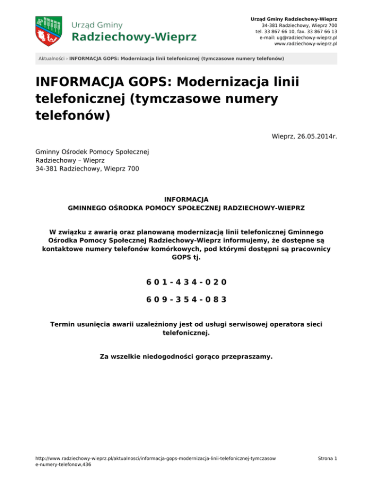 INFORMACJA GOPS: Modernizacja linii telefonicznej