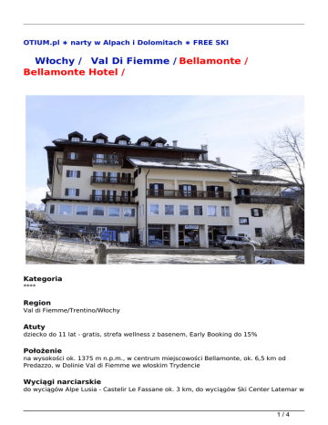 OTIUM.pl ∗ narty w Alpach i Dolomitach ∗ FREE SKI Włochy / Val Di Fiemme / Bellamonte / Bellamonte Hotel / Kategoria **** Region Val di Fiemme/Trentino/Włochy Atuty dziecko do 11 lat - gratis, strefa wellness z basenem, Early Booking do 15% Położenie na wysokości ok. 1375 m n.p.m., w centrum miejscowości Bellamonte, ok. 6,5 km od Predazzo, w Dolinie Val di Fiemme we włoskim Trydencie Wyciągi narciarskie do wyciągów Alpe Lusia - Castelir Le Fassane ok. 3 km, do wyciągów Ski Center Latemar w 1/4 Predazzo ok. 8 km. Przystanek skibusa (za opłatą, ok. 10 euro/tydz.) znajduje się ok. 100 m od hotelu Wyposażenie recepcja (czynna w godz. 07.00-23.00), winda, sala śniadaniowa, restauracja, bar, sala TV, przechowalnia sprzętu narciarskiego, parking (gratis). Hotel posiada 4 piętra Internet tak (WiFi w pomieszczeniach wspólnych, gratis) Karty kredytowe tak (Visa, Eurocard, Mastercard) Sport i relaks centrum wellness (gratis, czynne 14.00-19.00, dzieci poniżej 16 r.ż. wstęp wyłącznie do strefy z basenem) - basen, sauna, łaźnia turecka, hydromasaż, możliwość wypożyczenia szlafroków (za opłatą, 3 euro/os./dzień); masaże i zabiegi kosmetyczne (za opłatą); pokój zabaw dla dzieci Szkolenie narciarskie Val di Fiemme w terminach 14.01-26.02.2017 proponujemy (dodatkowo płatne) 6-dniowe grupowe szkolenia narciarskie na różnych poziomach zaawansowania dla dzieci od 4 lat, młodzieży i dorosłych - 2,5 h dziennie i dla jeżdżących w stopniu min. podstawowym dzieci 6-12 lat 4,5 h dziennie (Uwaga! w regionie Val di Fiemme nie prowadzimy szkoleń na poziomie 0). Fakultatywna dopłata przy rezerwacji. Szczegóły i ceny na stronie www - Szkolenia narciarskie - info Pokoje hotel dysponuje 43 pokojami. Pokoje dwuosobowe Standard (ok. 18 m<sup>2</sup>) nieodnowione, bez balkonu; pokoje dwuosobowe Superior z możliwością jednej dostawki (ok. 20 m<sup>2</sup>) - odnowione wyposażenie, z balkonem; pokoje dwuosobowe Family z możliwością dwóch dostawek (ok. 30 m<sup>2</sup>) - odnowione, na poddaszu, bez balkonu; wszystkie pokoje z łazienką z WC (w pokojach Family prysznic z hydromasażem), suszarka do włosów; telefon, TV-sat, minibar, sejf Wyżywienie śniadania w formie bufetu oraz 3-daniowe ciepłe kolacje podawane przez kelnera (wybór z 2 menu), bufet sałatkowy. Drink powitalny - gratis. Napoje do kolacji dodatkowo płatne. Raz w tygodniu kolacja z kuchnią regionalną Pieski nie Kategoria lokalna **** 2/4 Kolacja Wigilijna w cenie Kolacja Sylwestrowa w cenie Świadczenia 7 noclegów (Uwaga! w terminie 17-23.12.2016 - oferta z dojazdem własnym, 6 noclegów; w terminie 17-22.12.2016 - oferta z przejazdem autokarem, 5 noclegów, wykwaterowanie 22.12 ok. 18.00, bez kolacji), wyżywienie 2 x dziennie wg opisu, ubezpieczenie Signal Iduna - Bezpieczne Podróże (w tym rekreacyjne uprawianie narciarstwa zjazdowego, biegowego lub snowboardu na oznakowanych trasach zjazdowych) - KL, KR, NNW i bagażu, opieka włoskiego kontrahenta Uwaga Zalecamy dodatkowe ubezpieczenie OC/SS (w tym sprzęt sportowy) Signal Iduna - 35 zł/os/pobyt Obowiązkowe opłaty na miejscu taksa klimatyczna ok. 2 euro/os./dzień Zakwaterowanie przyjazd - od godz. 14.00, wyjazd - do godz. 10.00 Autokar przejazd komfortowym autokarem (klimatyzacja, WC, bar, video), warunki przewozu, cennik, program i rozkład jazdy na stronie organizatora (Uwaga! W terminie 16-23.12.2016 tylko dla pobytów 5-dniowych) Zniżki (na dostawkach) i dopłaty dzieci do 2,9 lat - gratis (możliwość wypożyczenia łóżeczka - za opłatą 10 euro/dzień), dzieci 3-11,9 lat na 3-cim łóżku - gratis, dzieci 3-6,9 lat na 4-tym łóżku - 50% zniżki, 7-11,9 lat na 4-tym łóżku - 30% zniżki, dzieci 12 - 13,9 lat - 15% zniżki, od 14 lat - 10% zniżki. W terminach Free Ski zniżki wg cen w systemie. Dopłata za ubezpieczenie od kosztów rezygnacji 2,4% Oferta Free Ski nie; w terminach 10-24.12.2016 i 18.03-01.04.2017 zniżki na zakup karnetów (fakultatywna dopłata do rezerwacji) - 6-dniowy karnet Fiemme-Obereggen - w terminach 10-24.12.2016 - 765 zł/os. (565 zł/junior, 725 zł/senior), Uwaga! w terminach 17-22.12.2016 (oferta autokarowa) i 17-23.12.2016 - karnet 5-dniowy - 640 zł/os. (470 zł/junior, 605 zł/senior), 18.03-01.04.2017 - 860 zł/os. (635 zł/junior, 815 zł/senior); 6-dniowy karnet SuperskiDolomiti - w terminach 10-24.12.2016 - 960 zł/os. (670 zł/junior, 865 zł/senior), Uwaga! w terminach 17-22.12.2016 (oferta autokarowa) i 17-23.12.2016 karnet 5-dniowy - 805 zł/os. (560 zł/junior, 720 zł/senior), 18.03-01.04.2017 - 1075 zł/os. (755 zł/junior, 970 zł/senior). Dzieci do 8 lat gratis (1 skipass gratis na 1 skipass pełnopłatny dla osoby dorosłej), junior - dzieci ur. po 26.11.2000, senior - dorośli ur. przed 3/4 26.11.1951 Uwaga W pozostałych terminach na podstawie Vouchera w kasach Alpe Cermis Cavalese, Ski Center Latemar, Predazzo, Pampeago, Obereggen, Bellamonte zniżka 5% dla Klientów Otium na zakup karnetów Fiemme-Obereggen Promocja Niezmienność ceny - na rezerwacje potwierdzone do 30.11.2016. Oferta 7=6 na pobyty w terminach 07-24.12.2016, 04.03-08.04.2017. Oferta Early Booking - 15% zniżki na rezerwacje potwierdzone do 01.09.2016, 10% zniżki na rezerwacje potwierdzone 30 dni przed przyjazdem. Oferty Early Booking oraz 7=6 nie łączą się. Ceny w systemie uwzględniają promocje data skąd pobyt opis cena / os 11.03.2017 nie dotyczy 7 dni Pokój: Pokój rodzinny 4-os. Wyżywienie: śniadania+obiadokolacje 1990 zł / os 01.04.2017 nie dotyczy 7 dni Pokój: Pokój rodzinny 4-os. Wyżywienie: śniadania+obiadokolacje 1820 zł / os OTIUM POLSKA SP. Z O.O. 30-150 KRAKÓW UL. ARMII KRAJOWEJ 12 lok. 11 tel./fax +48-12.4469214, 12.4469215, 12.4469216, 12.4469217 Zapraszamy poniedziałek-piątek w godzinach 10.00-18.00 (soboty 10.00-14.00 od połowy listopada do połowy kwietnia) E-mail: [email protected] Strona Internetowa: www.otium.pl 4/4 Powered by TCPDF (www.tcpdf.org)