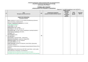 Dostawa komputerów, sprzętu komputerowego oraz oprogramowania dla potrzeb Transportowego Dozoru Technicznego Znak sprawy: Nr ZP10/2011 FORMULARZ CENOWY (JEDNOCZEŚNIE OPIS PRZEDMIOTU ZAMÓWIENIA) Załącznik nr 1 do SIWZ (modyfikacja z dnia 16.05.2011) OPIS Wymagane parametry techniczne LP SZT KOMPUTER PRZENOŚNY Wymagania minimalne: Ekran: przekątna od 14 cali do 14,1 cali z powłoką antyodblaskową, wbudowana kamera internetowa o rozdzielczości HD Procesor o częstotliwości taktowania: min. 2,4 GHz Liczba rdzeni procesora: 4 Pamięć RAM: min. 2 GB Rodzaj pamięci: DDR3 1333MHz Dysk twardy: min. 250 GB / 7200 obr. min. Ilość pamięci video: 128 MB ( moŜe być współdzielona z pamięcią komputera ) Napęd optyczny wbudowany: DVD+/-RW Typ baterii: Li-Ion Karta dźwiękowa: stereo 1 Ilość głośników: 2 Karta sieciowa: 10/100/1000 MB/s ( złącze RJ-45 ) Wbudowana karta WLAN: standard b/g obsługa WPA2 Wbudowane wyjścia: VGA 15-pin, Bluetooth, Ilość portów USB 2.0: min. 4 szt. System operacyjny: Windows XP Professional wersja Polska ( dopuszczalny downgrade z Windows 7) uzasadnienie: oprogramowanie zamawiającego wymaga środowiska Windows XP lub Windows 7 Pakiet biurowy: Office Small Business 2007 OEM wersja Polska + nośnik ( pakiet Office dostarczony z komputerem, nie zainstalowany ) Zamawiający dopuszcza wersję Office Home and Business 2010 OEM PL. Zamawiający dopuszcza nagranie przez oferenta na dowolny nośnik CD lub DVD pobranego 33 OFEROWANE PARAMETRY (przepisać lub podać oferowane wyŜsze)* MODEL/TYP/PR ODUCENT oraz adres strony internetowej ( jeŜeli dotyczy)** CENA za 1 szt NETTO WARTOŚĆ NETTO OPIS Wymagane parametry techniczne LP SZT OFEROWANE PARAMETRY (przepisać lub podać oferowane wyŜsze)* MODEL/TYP/PR ODUCENT oraz adres strony internetowej ( jeŜeli dotyczy)** CENA za 1 szt NETTO WARTOŚĆ NETTO produktu ze strony WWW Microsoft. Waga: max 2,5 kg gwarancja: 3 lata Wymagania dodatkowe: czytnik linii papilarnych, wejście mikrofonowe, wyjście słuchawkowe (Zamawiający dopuści port combo jako rozwiązanie równowaŜne), moŜliwość samodzielnego demontaŜu dysku twardego oraz napędu optycznego ( celem dostarczenia do serwisu ), torba do laptopa w zestawie, mysz USB optycznoradiowa: 2 przyciski + rolka - serwis gwarancyjny na terenie Polski w siedzibie zamawiającego - w przypadku awarii dysku twardego, uszkodzony dysk z danymi pozostaje w siedzibie zamawiającego KOMPUTER PRZENOŚNY Wymagania minimalne: Ekran: przekątna od 11 cali do 11,6 cali Procesor o częstotliwości taktowania: min. 1.3 GHz Pamięć RAM: min. 4 GB Dysk twardy: min. 250 GB / 7200 obr. min. Napęd optyczny USB: DVD+/-RW (Zamawiający dopuszcza zastosowanie napędu zewnętrznego) 2 Typ baterii: Li-Ion 2 Karta dźwiękowa: stereo Ilość głośników: 2 Karta sieciowa: 10/100/1000 MB/s ( złącze RJ-45 ) Wbudowana karta WLAN: standard b/g obsługa WPA2 Ilość portów USB 2.0: min. 3 szt. System operacyjny: Windows 7 Professional wersja Polska Pakiet biurowy: Office Small Business 2007 OEM wersja Polska + nośnik ( pakiet Office dostarczony z komputerem, nie zainstalowany ) 2 OPIS Wymagane parametry techniczne LP SZT OFEROWANE PARAMETRY (przepisać lub podać oferowane wyŜsze)* MODEL/TYP/PR ODUCENT oraz adres strony internetowej ( jeŜeli dotyczy)** CENA za 1 szt NETTO WARTOŚĆ NETTO uzasadnienie: oprogramowanie zamawiającego wymaga środowiska Windows XP lub Windows 7 Zamawiający dopuszcza wersję Office Home and Business 2010 OEM PL. Zamawiający dopuszcza nagranie przez oferenta na dowolny nośnik CD lub DVD pobranego produktu ze strony WWW Microsoft. Waga: max 1,5 kg (Zamawiający dopuszcza ofertę na notebooki o wadze 1,6 kg) gwarancja: 1 rok Wymagania dodatkowe: moŜliwość samodzielnego demontaŜu dysku twardego, torba do laptopa w zestawie, mysz USB optyczno-radiowa: 2 przyciski + rolka - serwis gwarancyjny na terenie Polski - w przypadku awarii dysku twardego w, uszkodzony dysk z danymi pozostaje w siedzibie zamawiającego. KOMPUTER STACJONARNY Wymagania minimalne: Procesor o częstotliwości taktowania: 3 Ghz BOX Płyta główna: - Chłodzenie chipsetu: radiator - Obsługa pamięci 1066 MHz - Rodzaj pamięci DDR2, 1066 MHz - Złącza PCI 2 szt. 3 - Złącza USB 2.0 min 4 szt., 5 - Minimalna ilość urządzeń Serial ATA 2 szt. - wbudowana automatyczna regulacja obrotów wentylatora procesora względem roboczej temperatury procesora - zintegrowana karta graficzna - zintegrowana karta sieciowa 100/1000 Mb/s Pamięć RAM: min. 2 GB DDR2 1066 MHz Dysk twardy: 3 OPIS Wymagane parametry techniczne LP SZT OFEROWANE PARAMETRY (przepisać lub podać oferowane wyŜsze)* MODEL/TYP/PR ODUCENT oraz adres strony internetowej ( jeŜeli dotyczy)** CENA za 1 szt NETTO WARTOŚĆ NETTO pojemność min.320 GB, interfejs Serial ATA 2 Prędkość obrotowa 7200 obr./min Pojemność pamięci podręcznej 16 MB Wbudowana funkcja: NCQ - Native Command Queuing Napęd optyczny: DVD +/- RW w kolorze obudowy, interfejs SATA Obudowa Mini Tower ( pionowa ): - zasilacz 450 W, - kolor srebrny lub czarny, - wymagane wyjścia USB na froncie obudowy, - przycisk włącznika na froncie obudowy - liczba kieszeni:5.25 cala max 2 szt. - zamontowany wentylator w tylnej części obudowy 80x80 mm Oprogramowanie: - Windows XP Professional wersja Polska + nośnik CD ( dopuszczalny downgrade z Windows 7 ) - Pakiet biurowy Office Small Businessl 2007 wersja Polska + nośnik CD ( pakiet Office dostarczony z komputerem, nie zainstalowany ) Zamawiający dopuszcza wersję Office Home and Business 2010 OEM PL. Zamawiający dopuszcza nagranie przez oferenta na dowolny nośnik CD lub DVD pobranego produktu ze strony WWW Microsoft - oprogramowanie do nagrywania płyt DVD zainstalowane w systemie uzasadnienie: oprogramowanie zamawiającego wymaga środowiska Windows XP lub Windows 7 Wymagania dodatkowe do zestawu: mysz optyczna USB klawiatura PS/2 lub USB podkładka z materiału kolor jednolity oprogramowanie do nagryw