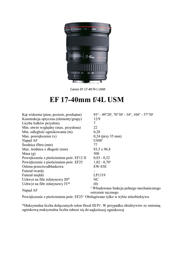 Canon EF 17-40 f4 L USM EF 17-40mm f/4L USM Kąt widzenia (pion, poziom, przekątna) Konstrukcja optyczna (elementy/grupy) Liczba listków przysłony Min. otwór względny (max. przysłona) Min. odległość ogniskowania (m) Max. powiększenie (x) Napęd AF Średnica filtru (mm) Max. średnica x długość (mm) Masa (g) Powiększenie z pierścieniem pośr. EF12 II Powiększenie z pierścieniem pośr. EF25 Osłona przeciwodblaskowa Futerał twardy Futerał miękki Uchwyt na filtr żelatynowy III* Uchwyt na filtr żelatynowy IV* 93° - 49°20', 70°30' - 34°, 104° - 57°30' 12/9 7 22 0,28 0,24 (przy 35 mm) USM¹ 77 83,5 x 96,8 500 0,83 - 0,32 1,02 - 0,70¹ EW-83E LP1319 NC (0) ¹ Wbudowana funkcja pełnego mechanicznego Napęd AF ostrzenie ręcznego Powiększenie z pierścieniem pośr. EF25 ¹ Obsługiwane tylko w trybie teleobiektywu *Maksymalna liczba dołączanych osłon Hood III/IV. W przypadku obiektywów ze zmienną ogniskową maksymalna liczba odnosi się do najkrótszej ogniskowej