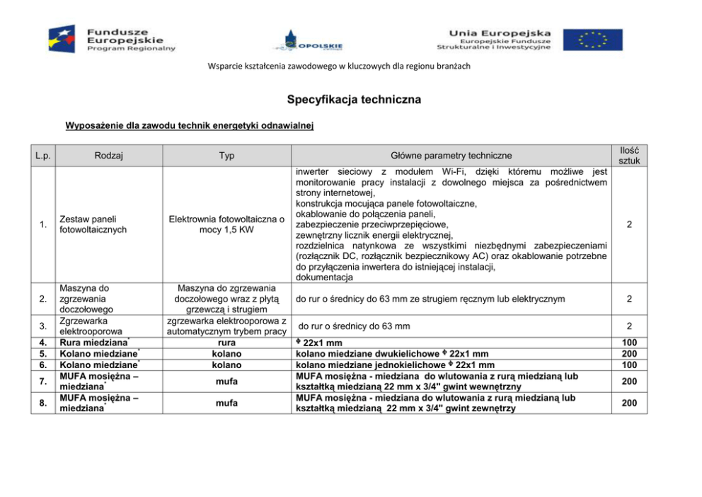 Wsparcie kształcenia zawodowego w kluczowych dla regionu branżach Specyfikacja techniczna Wyposażenie dla zawodu technik energetyki odnawialnej L.p. 1. 2. 3. 4. 5. 6. 7. 8. Typ Główne parametry techniczne Ilość sztuk Zestaw paneli fotowoltaicznych Elektrownia fotowoltaiczna o mocy 1,5 KW inwerter sieciowy z modułem Wi-Fi, dzięki któremu możliwe jest monitorowanie pracy instalacji z dowolnego miejsca za pośrednictwem strony internetowej, konstrukcja mocująca panele fotowoltaiczne, okablowanie do połączenia paneli, zabezpieczenie przeciwprzepięciowe, zewnętrzny licznik energii elektrycznej, rozdzielnica natynkowa ze wszystkimi niezbędnymi zabezpieczeniami (rozłącznik DC, rozłącznik bezpiecznikowy AC) oraz okablowanie potrzebne do przyłączenia inwertera do istniejącej instalacji, dokumentacja 2 Maszyna do zgrzewania doczołowego Zgrzewarka elektrooporowa Rura miedziana* Kolano miedziane* Kolano miedziane* MUFA mosiężna – miedziana* MUFA mosiężna – miedziana* Maszyna do zgrzewania doczołowego wraz z płytą grzewczą i strugiem zgrzewarka elektrooporowa z automatycznym trybem pracy rura kolano kolano do rur o średnicy do 63 mm ze strugiem ręcznym lub elektrycznym 2 do rur o średnicy do 63 mm 2 Rodzaj mufa mufa ᶲ 22x1 mm kolano miedziane dwukielichowe ᶲ 22x1 mm kolano miedziane jednokielichowe ᶲ 22x1 mm MUFA mosiężna - miedziana do wlutowania z rurą miedzianą lub kształtką miedzianą 22 mm x 3/4" gwint wewnętrzny MUFA mosiężna - miedziana do wlutowania z rurą miedzianą lub kształtką miedzianą 22 mm x 3/4" gwint zewnętrzy 100 200 100 200 200 9. 10. 11. 12. 13. 14. 15. 16. Zestaw palników do lutowania miedzi Butla gazowa Pasta do lutowania* Włóknina czyszcząca* Szczotka do rur miedzianych* Mufa miedziana* Cyna do lutowania* Zestaw dydaktyczny do energetyki odnawialnej Wsparcie kształcenia zawodowego w kluczowych dla regionu branżach Zestaw do lutowania o mocy palnika 2kW, temperaturze płomienia 1850°C. Palnik turbo o specjalnej konstrukcji przyspieszającej przepływ gazu. Palniki do lutowania miedzi Palnik turbo i punktowy wykonane z mosiądzu, o średnicy 17 mm. Zestaw zawiera również palnik punktowy i palnik otaczający. Z wężem o długości 2 m. Butla gazowa Butla gazowa 3 kg propan-butan Pasta do lutowania Pasta do lutowania miedzi z dodatkiem miedzi Włóknina czyszcząca włóknina czyszcząca rury miedziane Szczotka do rur Szczotka do rur miedzianych ᶲ 15,18,22x1mm (zestaw) miedzianych Mufa miedziana Mufa miedziana 22x22 mm Cyna do lutowania Cyna spoiwo lut miękki 2,5mm 100g do miedzi Części składowe zestawu: 1 x Ogniwo słoneczne 0.5 V, 420 mA, 1 x Ogniwo słoneczne 5,22V, 380 mA, 1 x Płyta główna, 1 x Moduł diodowy, 1 x Moduł potencjometryczny, 2 x Moduł żarówkowy, 1 x Moduł silnika bez przekładni, 1 x Podstawa do ogniwa słonecznego, 1 x Zestaw łopatek wirnika, Inteligentna sieć hybrydowa - 1 x Moduł do tworzenia podmuchu powietrza, zestaw rozbudowany 1 x Moduł turbiny wiatrowej, 2 x Moduł sieci elektrycznej, 1 x Modułu kondensatora 5.0F/5.4V, 1 x Moduł ogniwa paliwowego Pro, 1 x Model samochodu o napędzie elektrycznym, 1 x Moduł IU, 2 x Inteligentny miernik mocy i energii elektrycznej, 1 x Inteligentny zasilacz, 12 x Przezroczyste nakładki ochronne 5,0 x 11,1 mm (wysokość x przekrój), 1 x Moduł śmigła, 2 2 20 50 12 100 20 1 17. 18. Klucz do rur Zgrzewarka polifuzyjna 19. Elektrownia wiatrowa Wsparcie kształcenia zawodowego w kluczowych dla regionu branżach 1 x Obudowa lampy, 1 x Źródło światła 120W, 12°, 4 x Przewód obwodu pomiarowego - czarny, 25 cm, 4 x przewód obwodu pomiarowego - czerwony, 25 cm, 1 x przewód obwodu pomiarowego - czarny, 50 cm, 1 x Odwracalne ogniwo paliwowe Pro, 1 x Wkładka na elementy zestawu, 1 x Aluminiowa walizka do przechowywania zestawu, 1 x Płyta CD wraz z instrukcjami przeprowadzanych eksperymentów. Zakres możliwych eksperymentów: Zmiany mocy ogniwa słonecznego w ciągu dnia, Zmiany mocy turbiny wiatrowej w ciągu dnia, Przyczyny i skutki nadmiaru oraz niedoborów mocy elektrycznej w sieci energetycznej, Zaopatrywanie gospodarstwa domowego w energię elektryczną przy pomocy ogniwa słonecznego, Zaopatrywanie gospodarstwa domowego w energię elektryczną przy pomocy turbiny wiatrowej, Wyznaczanie krzywej ładowania kondensatora, Wyznaczanie krzywej rozładowania kondensatora, Zasilanie odbiorników prądu i akumulatorów poprzez ogniwa słoneczne, Zasilanie odbiorników prądu i akumulatorów, przez turbinę wiatrową, Niestabilność sieci energetycznej spowodowana decentralnym wytwarzaniem energii elektrycznej, Wzrost efektywności przesyłu energii w inteligentnej sieci energetycznej, klucz do rur Kuty klucz do rur nastawny ''SZWED'' 1,5" 45 stopni Zgrzewarka polifuzyjna do rur o średnicy od 16 do 63 mm Elektrownia wiatrowa 1000W (generator, śmigła, ogon, mocowanie do masztu) + inverter sieciowy do turbiny - 1500W, Gotowy system do produkcji możliwość wpięcia do gniazda sieciowego, energii licznik wyprodukowanej energii, odczyt aktualnej produkcji energii 1 2 2 20. Miernik parametrów instalacji elektrycznej 26. 27. 28. 29. 30. 31. Wielozakresowy miernik mocy Dwubiegunowy próbnik napięcia Mostek pomiarowy Zespół przygotowania powietrza Imadło instalatorskie do rur Wiertarka udarowa Wkrętarka elektryczna Stacja lutownicza Pompa do napełniania Piłka ręczna Wiertła do betonu 32. 21. 22. 23. 24. 25. Wsparcie kształcenia zawodowego w kluczowych dla regionu branżach Umożliwia wykonanie wszystkich pomiarów w instalacji elektrycznej przewidzianych normą PN-EN 61557: impedancja pętli zwarcia - dokładny pomiar również w obwodach z wyłącznikami RCD, miernik cyfrowy parametry wyłączników RCD, rezystancja izolacji, rezystancja uziemienia, ciągłość połączeń ochronnych i wyrównawczych. wskazówkowy pomiary mocy czynnej 2 próbnik napięcia 2 mostek Wheatstone'a sprężarka 2 2 230V, 6 bar typ Pionier 2 2 min mo
