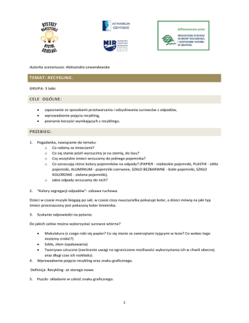 Autorka scenariusza: Aleksandra Lewandowska TEMAT: RECYKLING. GRUPA: 5 latki CELE OGÓLNE: zapoznanie ze sposobami przetwarzania i odzyskiwania surowców z odpadów, wprowadzenie pojęcia recykling, poznanie korzyści wynikających z recyklingu. PRZEBIEG: 1. Pogadanka, nawiązanie do tematu: o Co robimy ze śmieciami? o Co się stanie jeżeli wyrzucimy je na ziemię, do lasu? o Czy wszytskie śmieci wrzucamy do jednego pojemnika? o Co oznaczają różne kolory pojemników na odpady? (PAPIER - niebieskie pojemniki, PLASTIK - żółte pojemniki, ALUMINIUM - pojemniki czerwone, SZKŁO BEZBARWNE - białe pojemniki, SZKŁO KOLOROWE - zielone pojemniki), o Jakie odpady wrzucamy do nich? 2. "Kolory segregacji odpadów"- zabawa ruchowa. Dzieci w czasie muzyki biegają po sali, w czasie ciszy nauczycielka pokazuje kolor, a dzieci mówią na jaki typ śmieci przeznaczony jest pokazany kolor śmietnika. 3. Szukanie odpowiedzi na pytania: Do jakich celów można wykorzystać surowce wtórne? 4. Makulatura (z czego robi się papier? Co się stanie ze zwierzętami żyjącymi w lesie? Co wobec tego możemy zrobić?) Szkło, złom (opakowania) Tworzywo sztuczne (zwrócenie uwagi na ograniczone możliwości wykorzystania ich w chwili obecnej oraz długi czas ich rozkładu). Wprowadzenie pojęcia recykling oraz znaku graficznego. Definicja: Recykling- ze starego nowe. 5. Puzzle- składanie w całość znaku graficznego. 1 6. Podsumowanie zmniejszenie ilości odpadów trafiających na wysypiska. oszczędzanie surowców, zasobów naturalnych i energii 2