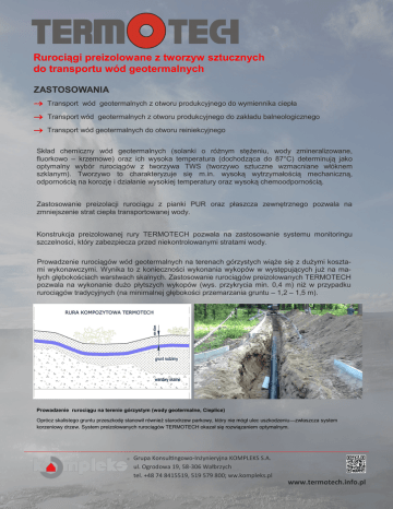 Rurociągi preizolowane z tworzyw sztucznych do transportu wód geotermalnych ZASTOSOWANIA Transport wód geotermalnych z otworu produkcyjnego do wymiennika ciepła Transport wód geotermalnych z otworu produkcyjnego do zakładu balneologicznego Transport wód geotermalnych do otworu reiniekcyjnego Skład chemiczny wód geotermalnych (solanki o różnym stężeniu, wody zmineralizowane, fluorkowo – krzemowe) oraz ich wysoka temperatura (dochodząca do 87°C) determinują jako optymalny wybór rurociągów z tworzywa TWS (tworzywo sztuczne wzmacniane włóknem szklanym). Tworzywo to charakteryzuje się m.in. wysoką wytrzymałością mechaniczną, odpornością na korozję i działanie wysokiej temperatury oraz wysoką chemoodpornością. Zastosowanie preizolacji rurociągu z pianki PUR oraz płaszcza zewnętrznego pozwala na zmniejszenie strat ciepła transportowanej wody. Konstrukcja preizolowanej rury TERMOTECH pozwala na zastosowanie systemu monitoringu szczelności, który zabezpiecza przed niekontrolowanymi stratami wody. Prowadzenie rurociągów wód geotermalnych na terenach górzystych wiąże się z dużymi kosztami wykonawczymi. Wynika to z konieczności wykonania wykopów w występujących już na małych głębokościach warstwach skalnych. Zastosowanie rurociągów preizolowanych TERMOTECH pozwala na wykonanie dużo płytszych wykopów (wys. przykrycia min. 0,4 m) niż w przypadku rurociągów tradycyjnych (na minimalnej głębokości przemarzania gruntu – 1,2 – 1,5 m). Prowadzenie rurociągu na terenie górzystym (wody geotermalne, Cieplice) Oprócz skalistego gruntu przeszkodę stanowił również starodrzew parkowy, który nie mógł ulec uszkodzeniu—zwłaszcza system korzeniowy drzew. System preizolowanych rurociągów TERMOTECH okazał się rozwiązaniem optymalnym. Grupa Konsultingowo-Inżynieryjna KOMPLEKS S.A. ul. Ogrodowa 19, 58-306 Wałbrzych tel. +48 74 8415519, 519 579 800; ww.kompleks.pl www.termotech.info.pl