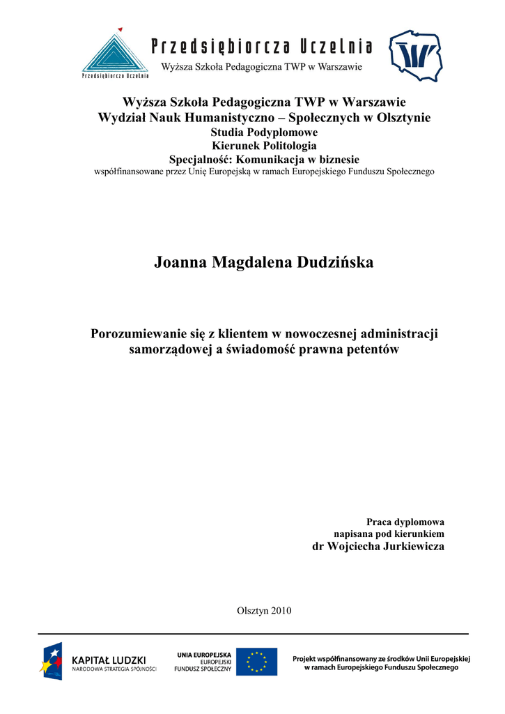 Wyższa Szkoła Pedagogiczna TWP w Warszawie Wydział Nauk Humanistyczno – Społecznych w Olsztynie Studia Podyplomowe Kierunek Politologia Specjalność: Komunikacja w biznesie współfinansowane przez Unię Europejską w ramach Europejskiego Funduszu Społecznego Joanna Magdalena Dudzińska Porozumiewanie się z klientem w nowoczesnej administracji samorządowej a świadomość prawna petentów Praca dyplomowa napisana pod kierunkiem dr Wojciecha Jurkiewicza Olsztyn 2010 Spis treści Wstęp………..……………………………………………………………………….3 1. Usługowa rola administracji lokalnej……………………………………………5 1.1.Standardy świadczenia usług w urzędzie…………………………………...5 1.2.Narzędzia i metody doskonalenia usług administracyjnych………………....8 2. Komunikowanie się z klientem………………………………………………...10 2.1.Proces komunikowania się z klientem……………………………………...10 2.2.Przeszkody w komunikowaniu się…………………………………………12 2.3.Skuteczne porozumiewanie się……………………………………………..14 2.4.Postępowanie z trudnym klientem urzędu………………………………….18 3. Informatyzacja usług samorządu terytorialnego………………………………..22 3.1.Koncepcja e-Urzędu………………………………………………………..22 Zakończenie………….…………………………………………………………….28 Bibliografia……………….………………………………………………………..29 2 Wstęp Władza publiczna ponosi odpowiedzialność za dostarczanie usług publicznych, ich dostępność, odpowiednią jakość i jawność kosztów. Zgodnie z art. 16 Konstytucji Rzeczypospolitej Polskiej1 samorząd terytorialny uczestniczy w sprawowaniu władzy. W wyniku decentralizacji funkcji państwa samorząd terytorialny przejął kompetencje świadczenia podstawowych usług publicznych. Stanowią one ważny element w codziennym życiu każdego mieszkańca i istotne jest aby wykonawca usług znajdował się jak najbliżej ich odbiorcy. W odczuciu społeczności lokalnych, ich poziom życia zależy wprost od poziomu usług administracyjnych. Nie ma wątpliwości, że samorząd pełni rolę usługową w stosunku do mieszkańców, którzy używając terminologii rynkowej są jego klientami. Niestety, w języku potocznym, o wiele częściej używane są terminy: strona, petent czy interesant. Użyte w temacie niniejszej pracy słowo „petent” to – zgodnie z definicją Słownika Języka Polskiego2 - osoba ubiegająca się o coś, składająca podanie w jakiejś instytucji lub załatwiająca coś ustnie w jakimś urzędzie. „Interesant” według tego samego źródła to: osoba, która przychodzi w interesie, w celu załatwienia jakiejś sprawy. Petent czy interesant to osoba, która stara się coś uzyskać, załatwić sprawę, na której jej zależy, składa podanie, a więc jest w sytuacji proszącego (żądającego). Relacja pomiędzy pracownikiem instytucji publicznej a petentem nie jest zatem partnerska, w odróżnieniu od relacji z klientem. Świadomość uprawnień posiadanych przez obywateli i umiejętność korzystania z nich powinny ograniczyć uciążliwość załatwiania spraw. Analogicznie, świadomość pracowników instytucji samorządowych o służebnej roli administracji oraz znajomość przepisów prawa, określających zadania, kompetencje i uprawnienia organów i instytucji niewątpliwie pozytywnie wpływa na poprawę relacji administracja – obywatel albo inaczej urząd – klient i umożliwia skuteczne ich komunikowanie się. Demokratyczne władze istnieją po to, aby służyć obywatelom.3 Rozważania niniejszej pracy mają za zadanie obalić powszechne przekonanie, że urząd to władza, a nie wykonawca usług, porównywalny z innymi usługodawcami na rynku oraz udowodnić, że instytucje administracji samorządowej podejmują działania mające na celu zapewnienie dobrej obsługi klienta, opierając się na czy- 1 Konstytucja Rzeczypospolitej Polskiej z dnia 2 kwietnia 1997 (Dz.U. z 1997 r. Nr 78 poz. 483 z późn. zm.). 2 Słownik Języka Polskiego, pod red. M. Szymczaka, Warszawa 1979, PWN, t. II, s. 640. 3 D. Osborne, T. Gaebler, Rządzić inaczej, Jak duch przedsiębiorczości przenika i przekształca administrację publiczną, Media Rodzina of Poznań, Poznań, s. 74. 3 telnych procedurach, dobrej organizacji pracy, wykonywanej przez dobrze przygotowany i etyczny personel aby efektywnie porozumiewać się z klientami zapewniając szybką, skuteczną i uprzejmą ich obsługę. Niniejsza praca składa się z 3 części. W rozdziale pierwszym skupiam się na uregulowaniach prawnych działalności samorządów w zakresie obsługi mieszkańców. Zwracam uwagę na prawa klienta w urzędzie oraz standardy świadczenia usług, których opracowanie i wdrożenie poprawia jakość i efektywność obsługi klienta a także polepsza wizerunek urzędu w oczach klientów. W rozdziale drugim poruszam ważną kwestie skutecznego porozumiewania się z klientem. Przy czym klienta traktuję jako jednostkę indywidualną a nie ogół mieszkańców. Bez wątpienia uprzejma obsługa wynika z potrzeby klienta do bycia traktowanym jako niezwykle ważną osobę. Każdy klient urzędu przychodzi z indywidualnym problemem, z indywidualną, dla niego priorytetową, sprawą i z takim podejściem w nowoczesnej administracji jest obsługiwany. Rozdział trzeci to próba ukazania zinformatyzowania usług administracyjnych przy obaleniu mitu o tym, że w urzędach panuje wciąż zbytnia biurokracja i sztywne, zamierzchłe procedury. 4 Rozdział 1 Usługowa rola administracji lokalnej 1.1 Standardy świadczenia usług w urzędzie Sprawność urzędu ściśle wiąże się z jakością usług administracyjnych, świadczonych na rzecz