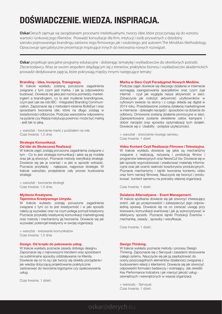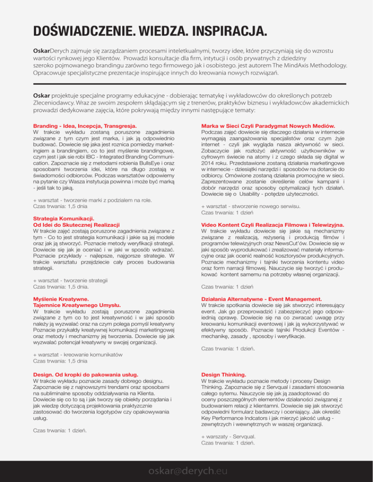 DOŚWIADCZENIE. WIEDZA. INSPIRACJA. OskarDerych zajmuje się zarządzaniem procesami inteletkualnymi, tworzy idee, które przyczyniają się do wzrostu wartości rynkowej jego Klientów. Prowadzi konsultacje dla firm, intytucji i osób prywatnych z dziedziny szeroko pojmowanego brandingu zarówno tego firmowego jak i osobistego. jest autorem The MindAxis Methodology. Opracowuje specjalistyczne prezentacje inspirujące innych do kreowania nowych rozwiązań. Oskar projektuje specjalne programy edukacyjne - dobierając tematykę i wykładowców do określonych potrzeb Zleceniodawcy. Wraz ze swoim zespołem skłądającym się z trenerów, praktyków biznesu i wykładowców akademickich prowadzi dedykowane zajęcia, które pokrywają między innymi następujące tematy: Branding - Idea, Incepcja, Transgresja. W trakcie wykładu zostaną poruszone zagadnienia związane z tym czym jest marka, i jak ją odpowiednio budować. Dowiecie się jaka jest roznica pomiedzy marketingiem a brandingiem, co to jest myślenie brandingowe, czym jest i jak sie robi IBC - Integrated Branding Communication. Zapoznacie się z metodami robienia BullsEye i oraz sposobami tworzenia idei, które na długo zostają w świadomości odbiorców. Podczas warsztatów odpowiemy na pytanie czy Wasza instytucja powinna i może być marką - jeśli tak to jaką. + warsztat - tworzenie marki z podzialem na role. Czas trwania: 1,5 dnia Strategia Komunikacji. Od Idei do Skutecznej Realizacji W trakcie zajęć zostają poruszone zagadnienia związane z tym - Co to jest strategia komunikacji i jakie są jej modele oraz jak ją stworzyć. Poznacie metody weryfikacji strategii. Dowiecie się jak je oceniać i w jaki w sposób wdrażać. Poznacie przykłady - najlepsze, najgorsze strategie. W trakcie warsztatu przejdziecie cały proces budowania strategii. + warsztat - tworzenie strategii Czas trwania: 1,5 dnia. + warsztat - stworzenie nowego serwisu. Czas trwania: 1 dzień Video Kontent Czyli Realizacja Filmowa i Telewizyjna. W trakcie wykładu dowiecie się jakie są mechanizmy związane z realizacją, reżyserią i produkcją filmów i programów telewizyjnych oraz NewsCut’ów. Dowiecie się w jaki sposób wyprodukować i zrealizować materiały informacyjne oraz jak ocenić realność kosztorysów produkcyjnych. Poznacie mechanizmy i tajniki tworzenia kontentu video oraz form narracji filmowej. Nauczycie się tworzyć i produkować kontent samemu na potrzeby własnej organizacji. Czas trwania: 1 dzień Myślenie Kreatywne. Tajemnice Kreatywnego Umysłu. W trakcie wykładu zostają poruszone zagadnienia związane z tym co to jest kreatywność i w jaki sposób należy ją wyzwalać oraz na czym polega pomyśl kreatywny Poznacie przykałdy kreatywnej komunikacji marketingowej oraz metody i mechanizmy jej tworzenia. Dowiecie się jak wyzwalać potencjał kreatywny w swojej organizacji. + warsztat - kreowanie komunikatów Czas trwania: 1,5 dnia Design. Od kropki do pakowania usług. W trakcie wykładu poznacie zasady dobrego designu. Zapoznacie się z najnowszymi trendami oraz sposobami na subliminalne sposoby oddziaływania na Klienta. Dowiecie się co to są i jak tworzy się obiekty porządania i jak wiedzę dotyczącą projektowania praktyzcznie zastosować do tworzenia logotypów czy opakowywania usług. Czas trwania: 1 dzień. Marka w Sieci Czyli Paradygmat Nowych Mediów. Podczas zajęć dowiecie się dlaczego działania w internecie wymagają zaangażowania specjalistów oraz czym żyje internet - czyli jak wygląda nasza aktywność w sieci. Zobaczycie jak rozłożyć aktywność użytkowników w cyfrowym świecie na atomy i z czego składa się digital w 2014 roku. Przedstawione zostaną działania marketingowe w internecie - dziesiątki narzędzi i sposobów na dotarcie do odbiorcy. Omówione zostaną działania promocyjne w sieci. Zaprezentowane zostanie określenie celów kampanii i dobór narzędzi oraz sposoby optymalizacji tych działań. Dowiecie się o Usability - potędze użyteczności. Działania Alternatywne - Event Management. W trakcie spotkania dowiecie się jak stworzyć interesujący event. Jak go przeprowadzić i zabezpieczyć jego odpowiednią oprawę. Dowiecie się na co zwracać uwagę przy kreowaniu komunikacji eventowej i jak ją wykorzystywać w efektywny sposób. Poznacie tajniki Produkcji Eventów mechanikę, zasady , sposoby i weryfikacje. Czas trwania: 1 dzień. Design Thinking. W trakcie wykładu poznacie metody i procesy Design Thinking. Zapoznacie się z Servqual i zasadami stosowania całego sytemu. Nauczycie się jak ją zaadoptować do oceny poszczegółnych elementów działaności związanej z budowaniem relacji z klientamni. Dowiecie się jak stworzyć odpowiedni formularz badawczy i oceniający. Jak określić Key Performance Indcators i jak mierzyć jakość usług zewnętrzych i wewnętrznych w waszej organizacji. + warszaty - Servqual. Czas trwania: 1 dzień. [email protected] Oto kilka opinii od osób, z którymi Oskarowi przyszło dzielić zawodowe sprawy. Znajdują się tu opinie zarówno tych, dla których Oskar pracował jak i tych, których rozwojem się zajmował. Na osobistą prośbę podajemy jedynie te odpowiednie, choć przyznać trzeba, że jego osobowość, dynamika i charakter działania potrafią polaryzować i nie pozostawiając w obojętności. PROF. PIOTR ŁUKASIEWICZ. DYREKTOR STRATEGICZNY I’ve had a chance to work with Oskar Derych in the course of last 3 years at McCann Erickson Poland. Initially he was leading the account team for Plus, a mobile operator, and the largest Agency client at a time. Then he took a charge of Growth&New Business, being both a contact for prospects and a driver of NB projects within the agency. Oskar’s background is in telecom business. Previously he was responsible for designing and launching of Idea mobile, one of the most successful market entries in the nineties in Poland. However his interests and skills go far beyond the a