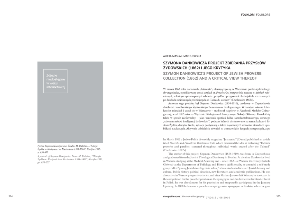 FOLKLOR | FOLKLORE Alicja Maślak-Maciejewska Szymona Dankowicza projekt zbierania przysłów żydowskich (1862) i jego krytyka Zdjęcie niedostępne w wersji internetowej Portret Szymona Dankowicza. Źródło: M. Bałaban, „Historja Żydów w Krakowie i na Kazimierzu 1304-1868”, Kraków 1936, ss. 656-657 A portrait of Szymon Dankowicz. From: M. Bałaban, “Historja Żydów w Krakowie i na Kazimierzu 1304–1868”, Kraków 1936, pp. 656-657 374 Szymon Dankowicz’s Project of Jewish Proverb Collection (1862) and a Critical View thereof W marcu 1862 roku na łamach „Jutrzenki”, ukazującego się w Warszawie polsko-żydowskiego dwutygodnika, opublikowany został artykuł pt. Przysłowia i przypowieści zawarte w dziełach rabinicznych, w którym opisano pomysł zebrania „przysłów i przypowieści hebrajskich, rozrzuconych po dziełach rabinicznych późniejszych od Talmudu wieków” (Dankowicz 1862a). Autorem tego projektu był Szymon Dankowicz (1834-1910), urodzony w Częstochowie absolwent wrocławskiego Żydowskiego Seminarium Teologicznego. W tamtym okresie Dankowicz mieszkał i uczył się w Warszawie – studiował najpierw w Akademii Medyko-Chirurgicznej, a od 1862 roku na Wydziale Filologiczno-Historycznym Szkoły Głównej. Kształcił się także w sposób nieformalny – jako uczestnik spotkań kółka samokształceniowego, zwanego „salonem młodej inteligencji żydowskiej”, podczas których dyskutowano na temat kultury i historii Żydów, dziejów Polski, sytuacji politycznej, a także najnowszych utworów literackich i publikacji naukowych. Aktywnie udzielał się również w warszawskich kręgach postępowych, a po In March 1862 a Judeo-Polish bi-weekly magazine “Jutrzenka” [Dawn] published an article titled Proverbs and Parables in Rabbinical texts, which discussed the idea of collecting “Hebrew proverbs and parables, scattered throughout rabbinical works created after the Talmud” (Dankowicz 1862a). The author of this project, Szymon Dankowicz (1834-1910), was born in Częstochowa and graduated from the Jewish Theological Seminary in Breslau. At the time Dankowicz lived in Warsaw, studying at the Medical Academy and – since 1862 – at Warsaw University (Szkoła Główna) at the Department of Philology and History. Additionally, he attended a self-study group called “young Jewish intelligentsia salon,” where students discussed Jewish history and culture, Polish history, political situation, new literature, and academic publications. He was also active in Warsaw progressive circles, and after Markus Jastrow left Warsaw, he took part in the competition for the preacher position in the synagogue on Daniłowiczowska Street. Fluent in Polish, he was also famous for his patriotism and supposedly participated in the January Uprising. In 1868 he became a preacher in a progressive synagogue in Kraków, where he gave etnografia nowa | the new ethnography 07|2015 / 08|2016 375 Szymon Dankowicz’s Project of Jewish Proverb Collection... wyjeździe Markusa Jastrowa z Warszawy stanął nawet do konkursu na posadę kaznodziei w synagodze przy ul. Daniłowiczowskiej. Znał bardzo dobrze język polski i słynął ze swojej patriotycznej postawy – miał na przykład brać udział w powstaniu styczniowym. W 1868 roku został kaznodzieją synagogi postępowej (Tempel) w Krakowie, gdzie wygłaszał polskie kazania, a w późniejszym okresie był rabinem i nauczycielem w kilku mniejszych gminach. Na przełomie lat 80. i 90. XIX wieku był rabinem naczelnym Bułgarii (Maślak-Maciejewska 2013a; 2013b). Aż do ostatnich lat biografia i działalność Dankowicza nie budziły większego zainteresowania badaczy i jego postać pozostawała niemal zupełnie nieznana. Wyjątkiem był projekt opisany w artykule Przysłowia i przypowieści, który ze względu na swój pionierski charakter był kilkakrotnie, aczkolwiek krótko, wspominany (Zinberg 1978: 62; Szacki 1947: 254; Schumacher-Brunhes 2009: 213; Eisenbach 1972: 315)1. Tekst Przysłowia i przypowieści był przejawem zainteresowania Dankowicza historią, tradycją i literaturą Żydów, a także pierwszą w jego dorobku pracą o charakterze naukowym. W artykule tym autor zauważał, iż w przeciwieństwie do przysłów i aforyzmów talmudycznych, przysłowia z literatury rabinicznej nie zostały zebrane, a z powodu tego, że są rozproszone i słabo dostępne, nie wzbudzały dotychczas należnego im zainteresowania. Dankowicz podkreślał, że stworzenie zestawienia „zawierającego w sobie wszystkie przysłowia i przypowieści po licznych dziełach rabinicznych rozsiane” byłoby bardzo szerokim i czasochłonnym projektem. Dlatego też czytelnikom „Jutrzenki” proponował jedynie niewielki wybór, który traktował jako ewentualny wstęp do dalszych prac na tym polu, jeśli zagadnienie wzbudzi ich zainteresowanie. Przygotowany przez niego i opublikowany w trzech częściach na łamach „Jutrzenki” zbiór obejmował w sumie dwanaście przysłów, które pochodziły z tekstów średniowiecznych i wczesnonowożytnych autorów, takich jak Izaak ben Szeszet, Solomon Almoli, Eliezer Aszkenazy, Berachia ha-Nakdan (Dankowicz 1862a; 1862c; 1862d). Dankowicz zawsze podawał ich dokładne tłumaczenie na język polski, a niekiedy też ich oryginalne brzmienie w języku hebrajskim. W przypadku, kiedy istniała taka analogia, podawał również polski odpowiednik danego przysłowia – podobieństwo między nimi dotyczyło zazwyczaj treści, nie zaś sposobu, w jaki dana myśl została ujęta. Swój polski odpowiednik znalazło osiem z dwunastu przysłów z tego zestawienia. Były to następujące pary (jako pierwsze podawane rabiniczne, jako drugie – polskie): - „Pokarm dla wszystkich stworzeń z nieba przychodzi” oraz „Kogo Pan Bóg stworzy, tego głodem nie umorzy”. - „Po śmierci stał się świętym” oraz „Każdy nieboszczyk dobrym był”. - „Do pszczoły: nie chcę twego miodu, ani też żądł