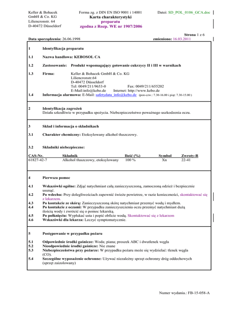 Keller & Bohacek GmbH & Co. KG Liliencronstr. 64 D-40472 Düsseldorf Forma zg. z DIN EN ISO 9001 i 14001 Datei: SD_POL_0106_GCA.doc Karta charakterystyki preparatu zgodna z Rozp. WE nr 1907/2006 Strona 1 z 6 zmieniono: 16.03.2011 Data sporządzenia: 26.06.1998 1 Identyfikacja preparatu 1.1 Nazwa handlowa: KEBOSOL CA 1.2 Zastosowanie: Produkt wspomagający gotowanie cukrzycy II i III w warnikach 1.3 Firma: 1.4 Keller & Bohacek GmbH & Co. KG Liliencronstr.64 D-40472 Düsseldorf Tel: 0049/211/9653-0 Fax: 0049/211/655202 E-Mail:[email protected] Internet: http://www.kebo.de Informacja alarmowa: E-Mail: [email protected] (pon-czw.: 7.30-16.00 i piąt: 7.30-15.00 ) 2 Identyfikacja zagrożeń Działa szkodliwie w przypadku spożycia. Niebezpieczeństwo poważnego uszkodzenia oczu. 3 Skład i informacja o składnikach 3.1 Charakter chemiczny: Etoksylowany alkohol tłuszczowy. 3.2 Składniki niebezpieczne: CAS-Nr. 61827-42-7 Składnik Alkohol tłuszczowy, etoksylowany Ilość (%) 100 % Symbol Xn Zwroty-R_ 22-41 4 Pierwsza pomoc 4.1 4.5 4.6 Wskazówki ogólne: Zdjąć natychmiast całą zanieczyszczoną, zamoczoną odzież i bezpiecznie usunąć. Po wdechu: Przy dolegliwościach zapewnić świeże powietrze, w razie konieczności, skontaktować się z lekarzem. Po kontakcie ze skórą: Zanieczyszczoną skórę natychmiast przemyć wodą i mydłem. Po kontakcie z oczami: W przypadku zanieczyszczenia oczu przemyć natychmiast dużą ilością wody i zwrócić się o pomoc lekarską. Po połknięciu: Wypłukać usta i popić obficie wodą. Skontaktować się z lekarzem Wskazówki dla lekarza: Leczyć symptomatycznie. 5 Postępowanie w przypadku pożaru 5.1 5.2 5.3 Odpowiednie środki gaśnicze: Woda; piana; proszek ABC i dwutlenek węgla Nieodpowiednie środki gaśnicze: Nie znane Niebezpieczeństwa przy pożarze: W przypadku pożaru może się wydzielać: tlenek węgla (CO). Szczególne wyposażenie ochronne: Używać niezależny sprzęt ochronny dróg oddechowych (sprzęt zaizolowany) 4.2 4.3 4.4 5.4 Numer wydania.: FB-15-058-A Keller & Bohacek GmbH & Co. KG Liliencronstr. 64 D-40472 Düsseldorf Forma zg. z DIN EN ISO 9001 i 14001 Datei: SD_POL_0106_GCA.doc Karta charakterystyki preparatu zgodna z Rozp. WE nr 1907/2006 Strona 2 z 6 zmieniono: 16.03.2011 Data sporządzenia: 26.06.1998 KEBOSOL CA 5.5 Wskazówki dodatkowe: Spalone pozostałości i skażona woda gaśnicza muszą zostać usunięte zgodnie z przepisami miejscowych władz. Zebrać oddzielnie skażoną wodę gaśniczą, nie może przedostać się do kanalizacji 6 Postępowanie w przypadku niezamierzonego uwolnienia do środowiska 6.1 6.2 6.3 6.4 Środki ostrożności dla ludzi: Używać osobistą odzież ochronną Środki ostrożności dla środowiska: Nie dopuścić do przedostania się do kanalizacji/wód powierzchniowych. Metody oczyszczania/zassania: Wchłonąć mechanicznie. Pozostałości spłukać wodą Uwagi dodatkowe: 7 Postępowanie z preparatem i jego magazynowanie 7.1 7.1.1 7.1.2 Instrukcja postępowania Wskazówki bezpieczeństwa: Ostrożnie otwierać i manipulować pojemnikiem Wskazówki przeciwpożarowe i przeciwwybuchowe: Produkt jest niepalny 7.2 7.2.1 7.2.3 Przechowywanie Wymagania magazynowe i dla pojemników: Przechowywać tylko w orginalnym opakowaniu. Zapobiegać przedostaniu się do podłoża. Wskazówki przy przechowywaniu z innymi materiałami: Nie przechowywać razem z karmą dla zwierząt. Nie przechowywać razem z żywnością. Dodatkowe dane do warunków przechowywania: Chronić przed mrozem. 8 Kontrola narażenia i środki ochrony indywidualnej 8.1 Wartości-NDS/NDSCh/NDSP: nie określono żadnych wartości 7.2.2 Materiał Wartość-NDS/NDSCh/NDSP (Rok) 8.2 Ochronne wyposażenie osobiste 8.2.1 Maska ochronna: Zapewnić wystarczające przewietrzanie, w innym wypadku krótko stosować urządzenie filtrujące (EN136/EN141/EN143/EN371). Ochrona rąk: Rękawice ochronne z kauczuku butylowego, 0,7 mm warstwa ochronna, odpowiada > 60 minut czasu przenikalności zg. z EN 374 Ochrona oczu: szczelne okulary ochronne zg. z EN 166 Inne środki ochronne: Nie jeść, nie pić, nie palić oraz nie zażywać leków podczas stosowania. W zależności od czynności i możliwego zagrżenia jako uzupełnienie do wymienionego wyposażenia ochronnego należy wybrać: np. buty ochronne, chemiczne ubranie ochronne (zg. z EN 465). 8.2.2 8.2.3 8.2.4 8.3 Środki ochrony higienicznej: Ogólna ochrona higieniczna zg. z TRGS 500 jako wymaganie minimalne, jeżeli nie wymagane są żadne dodatkowe przedsięwzięcia higieniczne i ochronne. Numer wydania.: FB-15-058-A Keller & Bohacek GmbH & Co. KG Liliencronstr. 64 D-40472 Düsseldorf Forma zg. z DIN EN ISO 9001 i 14001 Datei: SD_POL_0106_GCA.doc Karta charakterystyki preparatu zgodna z Rozp. WE nr 1907/2006 Strona 3 z 6 zmieniono: 16.03.2011 Data sporządzenia: 26.06.1998 KEBOSOL CA 9 Właściwości fizykochemiczne Postać przy 25 °C: o konsystencji pasty Barwa: biała Zapach: wyczuwalny Zmiany postaci stała-ciecz: ok. 25 °C ciecz-gaz: Metoda: DIN 51556 Wartość-pH: 4,6 – 6,9 (100 g/l woda 20 °C) Metoda: DIN 19268 Punkt zapłonu: >100 °C Metoda: Samozapłon: Nie dotyczy Właściwości wywołujące pożar: Nie dotyczy Prężność par: Nie oznaczona Granice wybuchowości Nie oznaczone dolna: Gęstość g/cm3 ( 25 °C ): ok. 1,0 górna: Metoda: DIN 12809 Gęstość nasypowa: Nie dotyczy Lepkość: Nie oznaczona Rozpuszczalność w wodzie przy 25 °C: ok. 100 g/l Rozpuszczalność tłuszczu: Nie oznaczona Współczynnik rozdziału n-oktanol/woda: Nie oznaczony Pozostałe dane: 10 Stabilność i reaktywność 10.1 Rozkład termiczny: przy właściwym określonym stosowaniu brak rozkładu termicznego 10.2 Niebezpieczne reakcje: Nie znane żadne niebezpieczne reakcje 10.3 Niebezpieczne produkty rozkładu: nie znane 10.4 Pozostałe dane: Numer wydania.: FB-15-058-A Keller & Bohacek GmbH & Co. KG Liliencronstr. 64 D-40472 Düsseldorf Forma zg. z DIN EN ISO 9001 i 14001 Datei: SD_POL_0106_GCA
