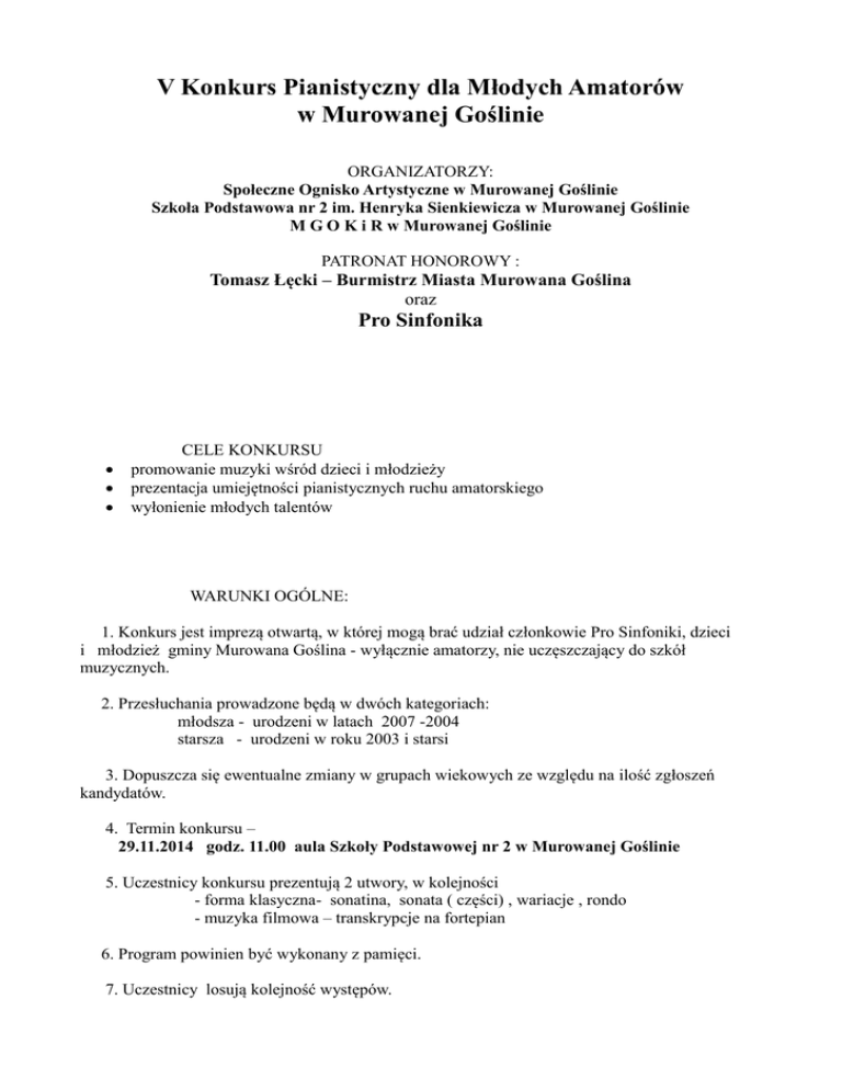 V Konkurs Pianistyczny dla Młodych Amatorów w Murowanej Goślinie ORGANIZATORZY: Społeczne Ognisko Artystyczne w Murowanej Goślinie Szkoła Podstawowa nr 2 im. Henryka Sienkiewicza w Murowanej Goślinie M G O K i R w Murowanej Goślinie PATRONAT HONOROWY : Tomasz Łęcki – Burmistrz Miasta Murowana Goślina oraz Pro Sinfonika CELE KONKURSU promowanie muzyki wśród dzieci i młodzieży prezentacja umiejętności pianistycznych ruchu amatorskiego wyłonienie młodych talentów WARUNKI OGÓLNE: 1. Konkurs jest imprezą otwartą, w której mogą brać udział członkowie Pro Sinfoniki, dzieci i młodzież gminy Murowana Goślina - wyłącznie amatorzy, nie uczęszczający do szkół muzycznych. 2. Przesłuchania prowadzone będą w dwóch kategoriach: młodsza - urodzeni w latach 2007 -2004 starsza - urodzeni w roku 2003 i starsi 3. Dopuszcza się ewentualne zmiany w grupach wiekowych ze względu na ilość zgłoszeń kandydatów. 4. Termin konkursu – 29.11.2014 godz. 11.00 aula Szkoły Podstawowej nr 2 w Murowanej Goślinie 5. Uczestnicy konkursu prezentują 2 utwory, w kolejności - forma klasyczna- sonatina, sonata ( części) , wariacje , rondo - muzyka filmowa – transkrypcje na fortepian 6. Program powinien być wykonany z pamięci. 7. Uczestnicy losują kolejność występów. 8. Zgłoszenia uczestników należy dostarczyć do 21.XI.2014 na ręce Jadwigi Maćkowiak – organizatora konkursu lub drogą elektroniczną [email protected] 9. Przesłuchania uczestników odbywać się będą z udziałem publiczności. 10. Jury oceniać będzie umiejętności wykonawcze zwracając uwagę na stopień trudności utworów, czas nauczania i ogólne wrażenia artystyczne. 11. Przewiduje się nagrody dla laureatów i dyplomy uczestnictwa dla wszystkich uczestników. 12. O sposobie podziału nagród decyduje Jury. 13 Decyzje Jury są ostateczne i niepodważalne. 14. Przesłuchania zakończą się koncertem laureatów, na którym zostaną wręczone dyplomy i nagrody, ADRES PLACÓWKI ORGANIZACYJNEJ Szkoła Podstawowa nr 2 ul. gen. T. Kutrzeby 3 62-020 Murowana Goślina [email protected]