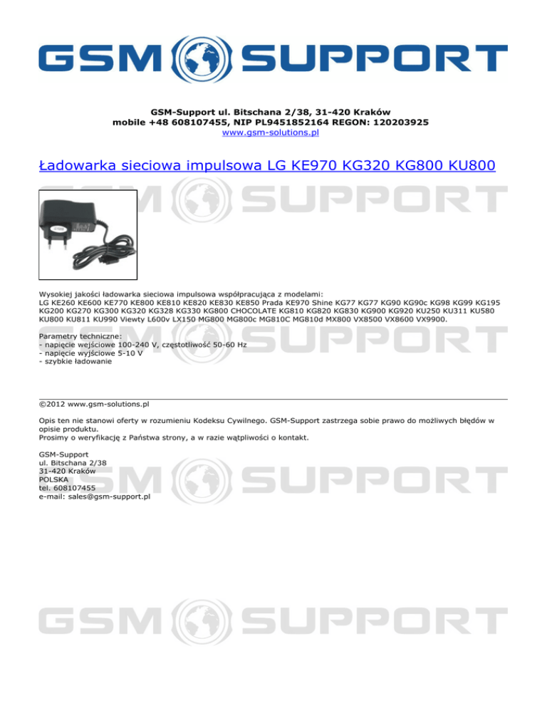 GSM-Support ul. Bitschana 2/38, 31-420 Kraków mobile +48 608107455, NIP PL9451852164 REGON: 120203925 www.gsm-solutions.pl Ładowarka sieciowa impulsowa LG KE970 KG320 KG800 KU800 Wysokiej jakości ładowarka sieciowa impulsowa współpracująca z modelami: LG KE260 KE600 KE770 KE800 KE810 KE820 KE830 KE850 Prada KE970 Shine KG77 KG77 KG90 KG90c KG98 KG99 KG195 KG200 KG270 KG300 KG320 KG328 KG330 KG800 CHOCOLATE KG810 KG820 KG830 KG900 KG920 KU250 KU311 KU580 KU800 KU811 KU990 Viewty L600v LX150 MG800 MG800c MG810C MG810d MX800 VX8500 VX8600 VX9900. Parametry techniczne: - napięcie wejściowe 100-240 V, częstotliwość 50-60 Hz - napięcie wyjściowe 5-10 V - szybkie ładowanie ©2012 www.gsm-solutions.pl Opis ten nie stanowi oferty w rozumieniu Kodeksu Cywilnego. GSM-Support zastrzega sobie prawo do możliwych błędów w opisie produktu. Prosimy o weryfikację z Państwa strony, a w razie wątpliwości o kontakt. GSM-Support ul. Bitschana 2/38 31-420 Kraków POLSKA tel. 608107455 e-mail: [email protected] Powered by TCPDF (www.tcpdf.org)