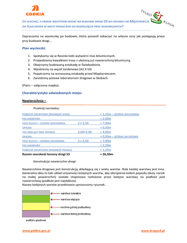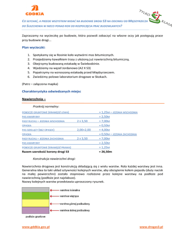 CO SŁYCHAĆ, A PRZEDE WSZYSTKIM WIDAĆ NA BUDOWIE DROGI S3 NA ODCINKU OD MIĘDZYRZECZA DO SULECHOWA W NIECO PONAD ROK OD ROZPOCZĘCIA PRAC BUDOWLANYCH? Zapraszamy na wycieczkę po budowie, która pozwoli zobaczyć na własne oczy jak postępują prace przy budowie drogi... Plan wycieczki: 1. 2. 3. 4. 5. 6. Spotykamy się w Rosinie koło wytwórni mas bitumicznych. Przejedziemy kawałkiem trasy z ułożoną już nawierzchnią bitumiczną. Obejrzymy budowaną estakadę w Świebodzinie. Wjedziemy na węzeł Jordanowo (A2 X S3) Popatrzymy na wznoszoną estakadę przed Międzyrzeczem. Zwiedzimy polowe laboratorium drogowe w Skokach. (Patrz – załączona mapka) Charakterystyka odwiedzanych miejsc Nawierzchnia – Przekrój normalny: POBOCZE GRUNTOWE (KRAWĘDŹ LEWA) PAS AWARYJNY PASY RUCHU – JEZDNIA WSCHODNIA 2 X 3,50 OPASKA PAS DZIELĄCY (BEZ OPASEK) 2,00+2,00 OPASKA PASY RUCHU – JEZDNIA ZACHODNIA PAS AWARYJNY POBOCZE GRUNTOWE (KRAWĘDŹ PRAWA) Razem szerokość korony drogi S3 2 X 3,50 = 1,25M – JEZDNIA WSCHODNIA = 2,50M = 7,00M = 0,50M = 4,00M = 0,50M – JEZDNIA ZACHODNIA = 7,00M = 2,50M = 1,25M = 26,50m Konstrukcja nawierzchni drogi: Nawierzchnia drogowa jest konstrukcją składającą się z wielu warstw. Rola każdej warstwy jest inna. Generalna idea to taki układ sztywności kolejnych warstw, aby obciążenie kołem pojazdu (duży nacisk na małej powierzchni) zostało stopniowo rozłożone przez kolejne warstwy na podłoże pod nawierzchnią (podłoże jest najsłabsze). Nazwy kolejnych warstw przedstawia uproszczony rysunek. www.gddkia.gov.pl www.drogas3.pl Podział warstw bitumicznych konstrukcji nawierzchni Warstwa ścieralna Zadaniem warstwy ścieralnej jest nadanie nawierzchni drogowej cech powierzchniowych (szorstkość, równość, komfort jazdy), jak również zabezpieczenie jej przed czynnikami atmosferycznymi. Warstwa wiążąca Zadaniem warstwy wiążącej jest przeniesienie naprężeń indukowanych w trakcie obciążania nawierzchni do warstw położonych niżej. W tej warstwie bardzo często znajdują się ekstrema naprężeń odpowiedzialnych za deformacje trwałe (koleinowanie). Warstwa podbudowy zasadniczej Najniższa bitumiczna warstwa nawierzchni stanowi fundament całej jej konstrukcji. Obecnie stosuje się najczęściej betony asfaltowe o strukturze częściowo zamkniętej, bardzo podobne do stosowanych w warstwie wiążącej, zazwyczaj jednak o grubszym uziarnieniu. Nawierzchnia drogi ekspresowej S3 posiadać będzie następującą konstrukcję: MIESZANKA MINERALNO-ASFALTOWA SMA 0/11,2 - 4 CM - WARSTWA ŚCIERALNA BETON ASFALTOWY 0/20 - 8 CM - WARSTWA WIĄŻĄCA BETON ASFALTOWY 0/25 - 17 CM - PODBUDOWA BITUMICZNA KRUSZYWO ŁAMANE STABILIZOWANE MECHANICZNIE 0/31,5 - 22 CM GRUNT STABILIZOWANY CEMENTEM R=2,5 MPA - 20 CM WARSTWA MROZOOCHRONNA - 15 CM Jest to typ nawierzchni pół-sztywnej, czyli takiej w której warstwy podbudowy zostały wykonane z chudego betonu lub stabilizacji cementem, a warstwy górne są asfaltowe. WARTO WIEDZIEĆ! Asfalt dla drogowców to lepiszcze, czyli składnik mieszanek mineralno-asfaltowych. Natomiast asfalt dla społeczeństwa to nawierzchnia, czyli (w języku drogowców) mieszanka mineralnoasfaltowa. Nawierzchnia asfaltowa składa się z warstw mieszanki mineralno-asfaltowej. W takiej mieszance kruszywa jest ok. 95%, a asfaltu tylko 5%. Asfalt ma za zadanie “skleić” ziarna kruszywa. Asfalt, czyli lepiszcze, jest produktem albo przerobu ropy naftowej w rafinerii (asfalt ponaftowy), albo kopaliną występującą w stanie naturalnym (asfalt skalny, asfalt jeziorny). Asfaltu, jako takiego, nigdy nie “leje się” na drogę, zawsze jest to mieszanka asfaltu z kruszywem. Zastosowana na drodze S3 warstwa ścieralna to mieszanka SMA, czyli mastyksu grysowego. Jest to mieszanka mineralno-asfaltowa stosowana do budowy bitumicznych warstw nawierzchni drogowych, głównie właśnie warstw ścieralnych (wierzchnich). SMA charakteryzuje się mieszanką mineralną o nieciągłym uziarnieniu, tzn. że przyrost wielkości ziaren w mieszance nie jest stopniowy tak jak w betonie asfaltowym, ale "skokowy" www.gddkia.gov.pl www.drogas3.pl tzn. mamy duży udział mączki wapiennej, drobnego kruszywa oraz dużych grysów. Brak jest generalnie frakcji pośrednich. Zawartość frakcji grysowej (> 2mm) wynosi 70-80%. Duża zawartość wypełniacza i zarazem asfaltu, tworzy tzw. mastyks który wypełnia przestrzenie między grysami. To daje szczelność mieszanki. Z kolei grysy opierając się na sobie i klinując, tworzą bardzo stabilny szkielet. To daje dużą odporność mieszanki na koleiny. Zalety: + duża trwałość + duża odporność na deformacje, dzięki dużej zawartości grubych ziaren oraz silnemu szkieletowi sklinowanych ziaren, + zwiększona odporność na zmęczenie dzięki zwiększonej zawartości asfaltu + zwiększona odporność na zużycie pod ruchem dzięki obecności twardych ziaren grysowych + dobra makrotekstura powierzchni warstwy i zmniejszenie mgły wodnej generowanej przez ruch pojazdów po mokrej nawierzchni + dobre właściwości przeciwhałasowe Estakada w Świebodzinie – Obiekt jest wieloprzęsłowym wiaduktem żelbetowym, sprężonym (kablobeton). Składa sie z dwóch niezależnych konstrukcji nośnych pod każdą z jezdni drogi ekspresowej S3. Wiadukt w ciągu jezdni wschodniej posiada 23 przęsła, a w ciągu jezdni zachodniej 24 przęsła. Podpory pośrednie obiektu jednosłupowe. Wiadukt jest obiektem wznoszonym na terenie o zróżnicowanym stopniu zabudowy. Ze względu na uwarunkowania krajobrazowe oraz niekorzystne warunki gruntowe panujące na obszarze miedzy linią kolejową L003 i drogą gminną, zaprojektowano wiadukt o rozdzielonych konstrukcjach nośnych dla każdej z jezdni drogi S3. Wiadukt umożliwia bezkolizyjny przejazd drogą ekspresową S3 nad pokonywanymi przeszkodami: − droga gminna w km 19+829,55 − droga krajowa nr 3 w km 20+089,62 − rzeka Struga Świebodzińska w km 20+214,00 − u