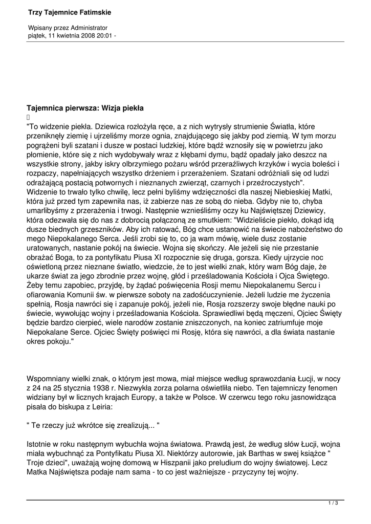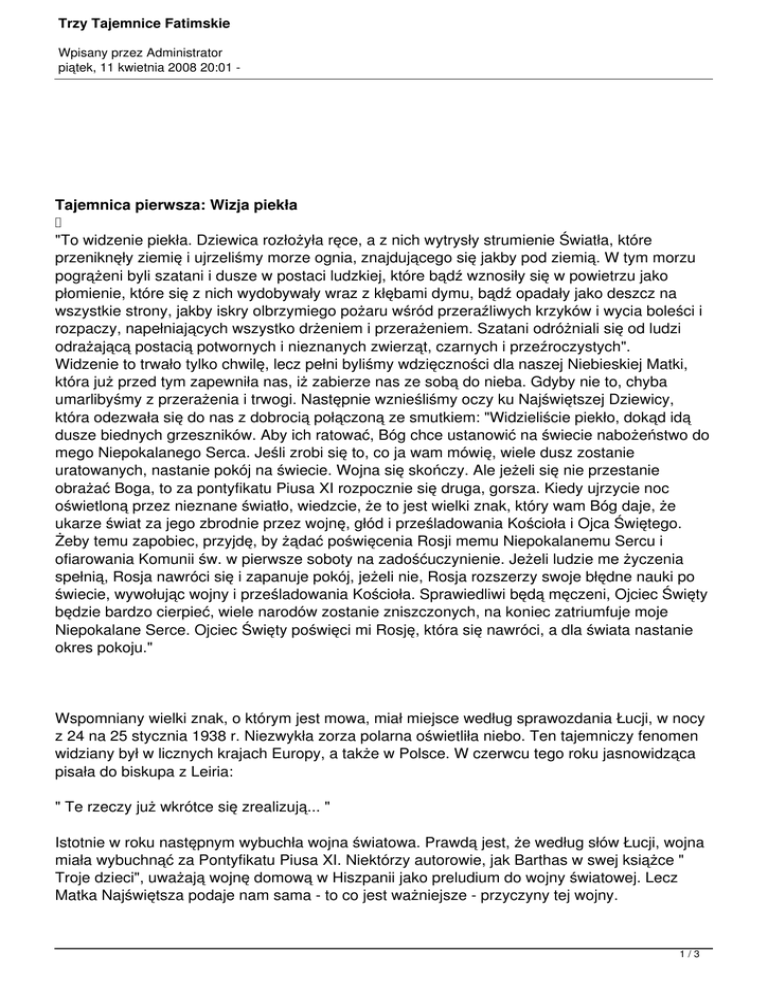 Trzy Tajemnice Fatimskie Wpisany przez Administrator piątek, 11 kwietnia 2008 20:01 - Tajemnica pierwsza: Wizja piekła "To widzenie piekła. Dziewica rozłożyła ręce, a z nich wytrysły strumienie Światła, które przeniknęły ziemię i ujrzeliśmy morze ognia, znajdującego się jakby pod ziemią. W tym morzu pogrążeni byli szatani i dusze w postaci ludzkiej, które bądź wznosiły się w powietrzu jako płomienie, które się z nich wydobywały wraz z kłębami dymu, bądź opadały jako deszcz na wszystkie strony, jakby iskry olbrzymiego pożaru wśród przeraźliwych krzyków i wycia boleści i rozpaczy, napełniających wszystko drżeniem i przerażeniem. Szatani odróżniali się od ludzi odrażającą postacią potwornych i nieznanych zwierząt, czarnych i przeźroczystych". Widzenie to trwało tylko chwilę, lecz pełni byliśmy wdzięczności dla naszej Niebieskiej Matki, która już przed tym zapewniła nas, iż zabierze nas ze sobą do nieba. Gdyby nie to, chyba umarlibyśmy z przerażenia i trwogi. Następnie wznieśliśmy oczy ku Najświętszej Dziewicy, która odezwała się do nas z dobrocią połączoną ze smutkiem: "Widzieliście piekło, dokąd idą dusze biednych grzeszników. Aby ich ratować, Bóg chce ustanowić na świecie nabożeństwo do mego Niepokalanego Serca. Jeśli zrobi się to, co ja wam mówię, wiele dusz zostanie uratowanych, nastanie pokój na świecie. Wojna się skończy. Ale jeżeli się nie przestanie obrażać Boga, to za pontyfikatu Piusa XI rozpocznie się druga, gorsza. Kiedy ujrzycie noc oświetloną przez nieznane światło, wiedzcie, że to jest wielki znak, który wam Bóg daje, że ukarze świat za jego zbrodnie przez wojnę, głód i prześladowania Kościoła i Ojca Świętego. Żeby temu zapobiec, przyjdę, by żądać poświęcenia Rosji memu Niepokalanemu Sercu i ofiarowania Komunii św. w pierwsze soboty na zadośćuczynienie. Jeżeli ludzie me życzenia spełnią, Rosja nawróci się i zapanuje pokój, jeżeli nie, Rosja rozszerzy swoje błędne nauki po świecie, wywołując wojny i prześladowania Kościoła. Sprawiedliwi będą męczeni, Ojciec Święty będzie bardzo cierpieć, wiele narodów zostanie zniszczonych, na koniec zatriumfuje moje Niepokalane Serce. Ojciec Święty poświęci mi Rosję, która się nawróci, a dla świata nastanie okres pokoju." Wspomniany wielki znak, o którym jest mowa, miał miejsce według sprawozdania Łucji, w nocy z 24 na 25 stycznia 1938 r. Niezwykła zorza polarna oświetliła niebo. Ten tajemniczy fenomen widziany był w licznych krajach Europy, a także w Polsce. W czerwcu tego roku jasnowidząca pisała do biskupa z Leiria: " Te rzeczy już wkrótce się zrealizują... " Istotnie w roku następnym wybuchła wojna światowa. Prawdą jest, że według słów Łucji, wojna miała wybuchnąć za Pontyfikatu Piusa XI. Niektórzy autorowie, jak Barthas w swej książce " Troje dzieci", uważają wojnę domową w Hiszpanii jako preludium do wojny światowej. Lecz Matka Najświętsza podaje nam sama - to co jest ważniejsze - przyczyny tej wojny. 1/3 Trzy Tajemnice Fatimskie Wpisany przez Administrator piątek, 11 kwietnia 2008 20:01 - " Ta wojna jest karą za grzechy". Jeśli chcemy się cieszyć trwałym pokojem opartym na sprawiedliwości i miłości, posłuchajmy ze czcią tego Głosu, który przypomina nasz obowiązek poświęcenia się z całego serca Niepokalanemu Sercu Maryi, zapowiedziany w Fatimie, wynagradzając temu Sercu Macierzyńskiemu za zniewagi, jakimi jest obrażana. "Przy śpieszmy dzień zmiłowania Bożego nad nami... " Druga tajemnica: Niepokalane Serce Maryi "Druga tajemnica odnosi się o nabożeństwa Niepokalanego Serca Maryi. Jak już poprzednio mówiłam, Nasza Pani 13 czerwca 1917 r. zapewniła mnie, że nigdy mnie nie opuści i że Jej Niepokalane Serce będzie zawsze moją ucieczką i drogą, która mnie będzie prowadziła do Boga. Mówiąc te słowa, rozłożyła swe ręce i przeszyła nasze serca światłością, która z nich płynęła. Wydaje mi się, że tego dnia to światło miało przede wszystkim utwierdzić w nas poznanie i miłość szczególną do Niepokalanego Serca Maryi, tak jak to było w dwóch innych wypadkach odnośnie do Boga i do tajemnicy Trójcy Przenajświętszej. Od tego dnia odczuliśmy w sercu bardziej płomienną miłość do Niepokalanego Serca Maryi." Trzecia część tajemnicy wyjawionej 13 lipca 1917 w Cova da Iria. "Piszę w duchu posłuszeństwa Tobie, mój Boże, który mi to nakazujesz poprzez Jego Ekscelencję Czcigodnego Biskupa Leirii i Twoją i moją Najświętszą Matkę. Po dwóch częściach, które już przedstawiłam, zobaczyliśmy po lewej stronie Naszej Pani nieco wyżej Anioła trzymającego w lewej ręce ognisty miecz; iskrząc się wyrzucał języki ognia, które zdawało się, że podpalą świat; ale gasły one w zetknięciu z blaskiem, jaki promieniował z prawej ręki Naszej Pani w jego kierunku; Anioł wskazując prawą ręką ziemię, powiedział mocnym głosem: Pokuta, Pokuta, Pokuta! I zobaczyliśmy w nieogarnionym świetle, którym jest Bóg: ?coś podobnego do tego, jak widzi się osoby w zwierciadle, kiedy przechodzą przed nim? Biskupa odzianego w Biel ?mieliśmy przeczucie, że to jest Ojciec Święty?. Wielu innych Biskupów, Kapłanów, zakonników i zakonnic wchodzących na stromą górę, na której szczycie znajdował się wielki Krzyż zbity z nieociosanych belek jak gdyby z drzewa korkowego pokrytego korą; Ojciec Święty, zanim tam dotarł, przeszedł przez wielkie miasto w połowie zrujnowane i na poły drżący, chwiejnym krokiem, udręczony bólem i cierpieniem, szedł modląc się za dusze martwych ludzi, których ciała napotykał na swojej drodze; doszedłszy do szczytu góry, klęcząc u stóp wielkiego Krzyża, został zabity przez grupę żołnierzy, którzy kilka razy ugodzili go pociskami z broni palnej i strzałami z łuku i w ten sam sposób zginęli jeden po drugim inn