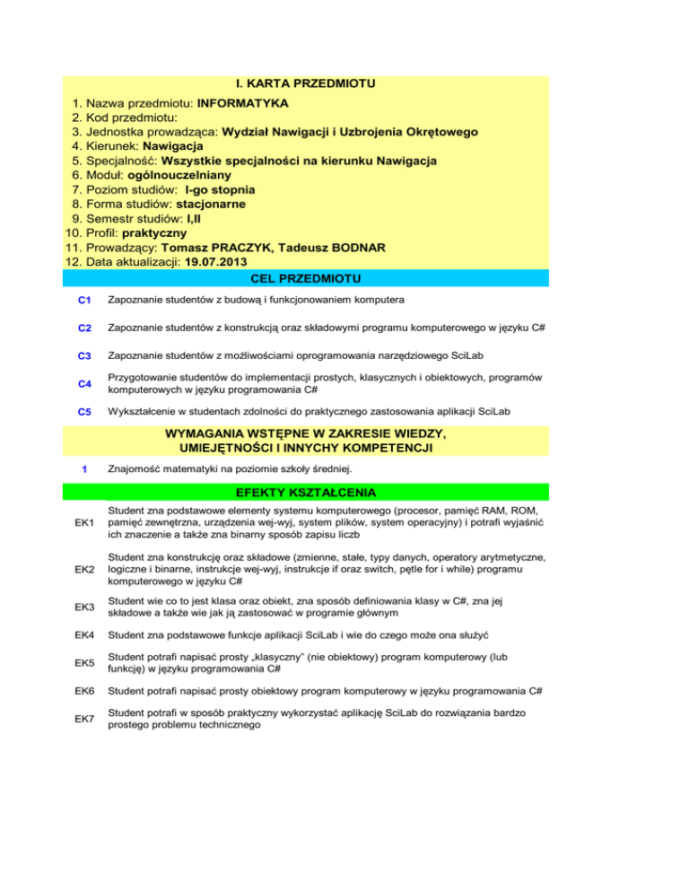 I. KARTA PRZEDMIOTU 1. Nazwa przedmiotu: INFORMATYKA 2. Kod przedmiotu: 3. Jednostka prowadząca: Wydział Nawigacji i Uzbrojenia Okrętowego 4. Kierunek: Nawigacja 5. Specjalność: Wszystkie specjalności na kierunku Nawigacja 6. Moduł: ogólnouczelniany 7. Poziom studiów: I-go stopnia 8. Forma studiów: stacjonarne 9. Semestr studiów: I,II 10. Profil: praktyczny 11. Prowadzący: Tomasz PRACZYK, Tadeusz BODNAR 12. Data aktualizacji: 19.07.2013 CEL PRZEDMIOTU C1 Zapoznanie studentów z budową i funkcjonowaniem komputera C2 Zapoznanie studentów z konstrukcją oraz składowymi programu komputerowego w języku C# C3 Zapoznanie studentów z możliwościami oprogramowania narzędziowego SciLab C4 Przygotowanie studentów do implementacji prostych, klasycznych i obiektowych, programów komputerowych w języku programowania C# C5 Wykształcenie w studentach zdolności do praktycznego zastosowania aplikacji SciLab WYMAGANIA WSTĘPNE W ZAKRESIE WIEDZY, UMIEJĘTNOŚCI I INNYCHY KOMPETENCJI 1 Znajomość matematyki na poziomie szkoły średniej. EFEKTY KSZTAŁCENIA EK1 Student zna podstawowe elementy systemu komputerowego (procesor, pamięć RAM, ROM, pamięć zewnętrzna, urządzenia wej-wyj, system plików, system operacyjny) i potrafi wyjaśnić ich znaczenie a także zna binarny sposób zapisu liczb EK2 Student zna konstrukcję oraz składowe (zmienne, stałe, typy danych, operatory arytmetyczne, logiczne i binarne, instrukcje wej-wyj, instrukcje if oraz switch, pętle for i while) programu komputerowego w języku C# EK3 Student wie co to jest klasa oraz obiekt, zna sposób definiowania klasy w C#, zna jej składowe a także wie jak ją zastosować w programie głównym EK4 Student zna podstawowe funkcje aplikacji SciLab i wie do czego może ona służyć EK5 Student potrafi napisać prosty „klasyczny” (nie obiektowy) program komputerowy (lub funkcję) w języku programowania C# EK6 Student potrafi napisać prosty obiektowy program komputerowy w języku programowania C# EK7 Student potrafi w sposób praktyczny wykorzystać aplikację SciLab do rozwiązania bardzo prostego problemu technicznego STRUKTURA PRZEDMIOTU Forma zajęćwykłady Liczba godzin Forma zajęććwiczenia EK1 W1 1 … EK2 W1-W6 5 … EK3 W7 6 … EK4 W8,W9 4 … EK5 EK6 … EK7 Suma godzin Liczba godzin Forma zajęćlaboratoria Liczba godzin … … L1-L4 12 … L5, L6 12 … L7,L8 8 16 0 32 TREŚCI PROGRAMOWE W1 Składowe systemu komputerowego i ich znaczenie (procesor, pamięć RAM, ROM i pamięć zewnętrzna, system wej-wyj, system plików, system operacyjny). System binarny zapisu liczb. W2 Konstrukcja programu w języku programowania C#. Podstawowe elementy programu: zmienne, stałe, liczbowe typy danych, znakowe typy danych, tablice W3 Instrukcje wej-wyj. Różne sposoby wyprowadzania danych na standardowe wyjście systemu komputerowego. W4 Operatory arytmetyczne, logiczne i binarne. W5 Instrukcje sterujące: instrukcje warunkowe oraz pętle. W6 Debugowanie programu. W7 Definiowanie klasy C#. Składowe klasy: atrybuty i metody (funkcje). Wykorzystanie klas w programie głównym W8 Wprowadzenie do SciLab. Podstawowe funkcje SciLab. W9 Tworzenie prostych skryptów SciLab L1 Zastosowanie instrukcji wej-wyj. L2 Zastosowanie instrukcji warunkowych. L3 Zastosowanie pętli for. L4 Zastosowanie pętli while. L5 Implementacja funkcji bezparametrycznych w klasach C# oraz ich wykorzystanie. L6 Implementacja funkcji parametrycznych w klasach C# oraz ich wykorzystanie. L7 Zastosowanie podstawowych funkcji SciLab. L8 Zastosowanie skryptów SciLab. NARZĘDZIA DYDAKTYCZNE 1 Notebook z projektorem 2 Tablica i kolorowe pisaki 3 Oprogramowanie Visual Studio firmy Microsoft 4 Oprogramowanie SciLab SPOSOBY OCENY (F-FORMUJĄCA, P-PODSUMOWUJĄCA) F1 Sprawdzian EK1-EK7 P1 Kolokwium nr 1 EK1,EK2,EK5 P2 Kolokwium nr 2 EK3,EK5,EK6 P3 Kolokwium nr 3 EK4,EK7 OBCIĄŻENIE PRACĄ STUDENTA Średnia liczba godzin na zrealizowanie aktywności Forma aktywności semestr I II razem Godziny kontaktowe z nauczycielem 24 24 48 Przygotowanie się do wykładów i ćwiczeń 12 12 24 Samodzielne opracowanie zagadnień 35 35 70 Rozwiązywanie zadań domowych 19 19 38 SUMA GODZIN W SEMESTRZE 90 90 r.a 180 PUNKTY ECTS W SEMESTRZE 2 2 r.a 4 LITERATURA PODSTAWOWA I UZUPEŁNIAJACĄ 1 Thomas H. Carmen, Charles E. Leiserson, Ronald L. Rivest: Wprowa-dzenie do algorytmów, WNT, Warszawa. 2 Alfred V. Aho, John E. Hopcroft, Jeffrey D. Ullman: Algorymy i struktury danych, Hellion. 3 NIKLAUS WIRTH. Wstęp do programowania systematycznego. WNT. 4 Stephen C. Perry: C# i .NET, Helion 2006 PROWADZĄCY PRZEDMIOT (IMIĘ, NAZWISKO, ADRES E-MAIL) 1 dr inż. Tomasz Praczyk, [email protected] 2 mgr inż. Tadeusz Bodnar [email protected]
