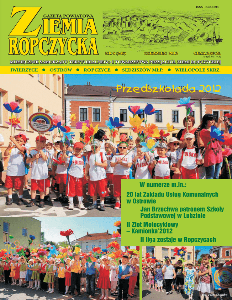 IEMIA Z ROPCZYCKA ISSN 1508-4604 GAZETA POWIATOWA NR 6 (248) CZERWIEC 2012 CENA 2,50 ZŁ (w tym 5% VAT) MIESIĘCZNIK SAMORZĄDU TERYTORIALNEGO I TOWARZYSTWA PRZYJACIÓŁ ZIEMI ROPCZYCKIEJ IWIERZYCE l OSTRÓW l ROPCZYCE l SĘDZISZÓW MŁP. l WIELOPOLE SKRZ. Przedszkolada 2012 W numerze m.in.: 20 lat Zakładu Usług Komunalnych w Ostrowie Jan Brzechwa patronem Szkoły Podstawowej w Lubzinie II Zlot Motocyklowy – Kamionka’2012 II liga zostaje w Ropczycach Fot. Piotr Skałuba WIELOPOLE SPIS TREŚCI WIEŚCI Z MAGISTRATU ............................................................................4-5 OBRADOWAŁA RADA MIEJSKA ................................................................................6 • XXIII sesja SPOŁECZEŃSTWO I GOSPODARKA ........................................................7-12 • Zakłady Magnezytowe „ROPCZYCE” S.A. promują markę ROPCZYCE na świecie • Informacja o wywieszeniu wykazu nieruchomości • Punkt konsultacyjny • Budowa sieci kanalizacyjnej w Ropczycach • Przedsiębiorstwo Usług Komunalnych laureatem wielu nagród • Nowoczesny sprzęt w pracowni endoskopowej • XII Powiatowa Impreza Sportowo-Integracyjna • Konferencja historyczna ZNP • Delegacja Samorządu Ropczyc z wizytą w Opatowie • Przeżyli razem 50 lat • Podsumowanie rocznej działalności PCK • Dzień Godności Osób Niepełnosprawnych VII Ogólnopolskie Prezentacje Teatrów Poszukujących W dniach 25-27 maja w Wielopolu Skrzyńskim gościły amatorskie teatry alternatywne, uczestniczące w VII Ogólnopolskich Prezentacjach Teatrów Poszukujących o Nagrodę im. Tadeusza Kantora. ciąg dalszy na str. 32 650-LECIE ROPCZYC ............................................................................13-17 • Król Kazimierz Wielki i jego czasy • Piknik Jubileuszowy • Moje miejsce na ziemi • Ropczyce moich marzeń • Legenda o Ropczycach • 650 lat mojego miasta MIEJSKA I POWIATOWA BIBLIOTEKA PUBLICZNA W ROPCZYCACH...17-19 • Spotkanie w klubie książki • Salonik literacki • Cała Polska czyta dzieciom • Biblioteka poleca • Kazimierz Rymut CENTRUM KULTURY W ROPCZYCACH ..................................................20-21 • Witraż w herbie Ropczyc • Dzień Działacza Kultury • Jarmark Kowalski • Konkurs filmowy rozstrzygnięty • Najpiękniejsze polskie piosenki • Dni Ropczyc za nami ZE SZKÓŁ I PRZEDSZKOLI GMINY ROPCZYCE ......................................22-27 • W przedszkolu jak w domu • Dziękujemy naszym mamom • Wizyta dostojnego gościa • Spotkanie ze strażakami • Święto dzieci • Wycieczka do piekarni • Święto w Gnojnicy Dolnej • Zuchowe święto w Niedźwiadzie Dolnej • Tydzień kultury języka polskiego • Miłe spotkanie • Wizytacja w ZS nr 2 • Jan Brzechwa patronem Szkoły Podstawowej w Lubzinie • Piknik rodzinny w Niedźwiadzie Górnej: Zawsze niech będzie mama, tata i ja WIADOMOŚCI Z GMINY OSTRÓW .........................................................30-31 • Rozwój współpracy z dalekim Grong • Zawody wędkarskie w Kamionce • 20 lat Zakładu Usług Komunalnych w Ostrowie • Dzień Dziecka w Ociece WIADOMOŚCI Z GMINY WIELOPOLE SKRZYŃSKIE ..............................32-33 • VII Ogólnopolskie Prezentacje Teatrów Poszukujących • Zaproszenie • Gżegżółka i spółka WIADOMOŚCI Z ZAGORZYC I IWIERZYC ....................................................34 • V Powiatowa Majówka Młodych • Święto w naszej bibliotece! NA KARTACH HISTORII ..........................................................................35-36 • Ropczyce siedzibą władz powiatowych i instytucji o zasięgu powiatowym LICEUM OGÓLNOKSZTAŁCĄCE W ROPCZYCACH .................................37-38 • Systematyczność popłaca • Matematyka na plaży • Spotkania czwartkowe • Lwiątka i kangury • Humor z zeszytów szkolnych ZESPÓŁ SZKÓŁ AGRO-TECHNICZNYCH W ROPCZYCACH ....................39-40 • Gotowali na EKOGALI • Nasi kucharze gotowali na II Europejskim Festiwalu Smaków • Kurs barmański • Uroczystości patriotyczne • Znów najlepsi! • Ogłoszenie o przetargu Uczniowie Szkoły Podstawowej im. Tadeusza Kantora w Wielopolu Skrzyńskim Grażyna Szeliga, dyrektor DKiODN Urzędu Marszałkowskiego w Rzeszowie oraz Marek Jastrzębski, dyrektor WDK w Rzeszowie wręczyli główną statuetkę „Krzesło kantorowski” przedstawicielowi Szkolnego Teatru Lalki i Aktora z Zespołu Szkół w Turzym Polu OSTRÓW Rozwój współpracy z dalekim Grong W dniach 16-19 maja 2012 r. delegacja Gminy Ostrów przebywała z oficjalną wizytą w Grong. ciąg dalszy na str. 30 ZESPÓŁ SZKÓŁ W ROPCZYCACH ..........................................................41-42 • Dzień dawców szpiku • Dzień patrona szkoły • Międzyszkolny turniej gier planszowych i logicznych TO I OWO ................................................................................................43-46 • II Zlot Motocyklowy – Kamionka’2012 • Woda – źródło życia, zdrowia, energii • Lekarz weterynarii radzi • Pełna rezerwacja miejsc w pociągach TLK • Cejlon – egzotyka i zagadki WIADOMOŚCI SPORTOWE....................................................................47-53 • II liga zostaje w Ropczycach • Sukces młodych siatkarzy • Podkarpacka siatkówka na szczycie • IV Międzynarodowy Turniej Piłki Siatkowej – Jasło’2012 • Nabór chłopców do grup treningowych na sezon 2012/2013 • Gimnazjada lekkoatletyczna 2012 • Mini piłka nożna chłopców • Mistrzostwa Polski kadetów i juniorów w sumo • Turniej piłki nożnej gimnazjalistów • Turniej piłki siatkowej plażowej • Pobiegli w hołdzie królowi • Tenisiści walczyli o statuetkę króla Kazimierza • Sportowe podsumowanie Dni Ziemi Ropczyckiej IEMIA Z ROPCZYCKA GAZETA POWIATOWA Fot. Grzegorz Ożóg Delegacja z Ostrowa w Domu Opieki Społecznej Wydawca: Towarzystwo Przyjaciół Ziemi Ropczyckiej w Ropczyca