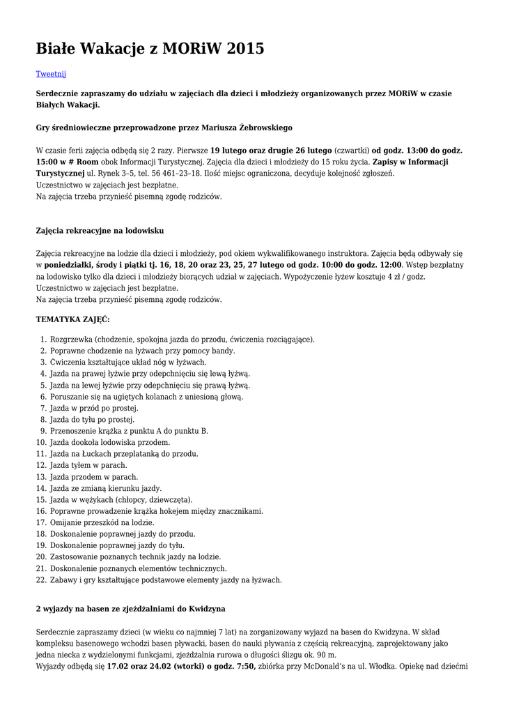 Białe Wakacje z MORiW 2015 Tweetnij Serdecznie zapraszamy do udziału w zajęciach dla dzieci i młodzieży organizowanych przez MORiW w czasie Białych Wakacji. Gry średniowieczne przeprowadzone przez Mariusza Żebrowskiego W czasie ferii zajęcia odbędą się 2 razy. Pierwsze 19 lutego oraz drugie 26 lutego (czwartki) od godz. 13:00 do godz. 15:00 w # Room obok Informacji Turystycznej. Zajęcia dla dzieci i młodzieży do 15 roku życia. Zapisy w Informacji Turystycznej ul. Rynek 3–5, tel. 56 461–23–18. Ilość miejsc ograniczona, decyduje kolejność zgłoszeń. Uczestnictwo w zajęciach jest bezpłatne. Na zajęcia trzeba przynieść pisemną zgodę rodziców. Zajęcia rekreacyjne na lodowisku Zajęcia rekreacyjne na lodzie dla dzieci i młodzieży, pod okiem wykwalifikowanego instruktora. Zajęcia będą odbywały się w poniedziałki, środy i piątki tj. 16, 18, 20 oraz 23, 25, 27 lutego od godz. 10:00 do godz. 12:00. Wstęp bezpłatny na lodowisko tylko dla dzieci i młodzieży biorących udział w zajęciach. Wypożyczenie łyżew kosztuje 4 zł / godz. Uczestnictwo w zajęciach jest bezpłatne. Na zajęcia trzeba przynieść pisemną zgodę rodziców. TEMATYKA ZAJĘĆ: 1. 2. 3. 4. 5. 6. 7. 8. 9. 10. 11. 12. 13. 14. 15. 16. 17. 18. 19. 20. 21. 22. Rozgrzewka (chodzenie, spokojna jazda do przodu, ćwiczenia rozciągające). Poprawne chodzenie na łyżwach przy pomocy bandy. Ćwiczenia kształtujące układ nóg w łyżwach. Jazda na prawej łyżwie przy odepchnięciu się lewą łyżwą. Jazda na lewej łyżwie przy odepchnięciu się prawą łyżwą. Poruszanie się na ugiętych kolanach z uniesioną głową. Jazda w przód po prostej. Jazda do tyłu po prostej. Przenoszenie krążka z punktu A do punktu B. Jazda dookoła lodowiska przodem. Jazda na Łuckach przeplatanką do przodu. Jazda tyłem w parach. Jazda przodem w parach. Jazda ze zmianą kierunku jazdy. Jazda w wężykach (chłopcy, dziewczęta). Poprawne prowadzenie krążka hokejem między znacznikami. Omijanie przeszkód na lodzie. Doskonalenie poprawnej jazdy do przodu. Doskonalenie poprawnej jazdy do tyłu. Zastosowanie poznanych technik jazdy na lodzie. Doskonalenie poznanych elementów technicznych. Zabawy i gry kształtujące podstawowe elementy jazdy na łyżwach. 2 wyjazdy na basen ze zjeżdżalniami do Kwidzyna Serdecznie zapraszamy dzieci (w wieku co najmniej 7 lat) na zorganizowany wyjazd na basen do Kwidzyna. W skład kompleksu basenowego wchodzi basen pływacki, basen do nauki pływania z częścią rekreacyjną, zaprojektowany jako jedna niecka z wydzielonymi funkcjami, zjeżdżalnia rurowa o długości ślizgu ok. 90 m. Wyjazdy odbędą się 17.02 oraz 24.02 (wtorki) o godz. 7:50, zbiórka przy McDonald’s na ul. Włodka. Opiekę nad dziećmi w czasie wyjazdu będzie sprawowało 3 opiekunów (nauczycieli, ratowników WOPR). Chętne osoby prosimy o zapisywanie dzieci w Informacji Turystycznej ul. Rynek 3–5, tel. 56 461–23–18, na pierwszy termin do dnia 13 lutego, zaś na drugi termin do dnia 20 lutego. Przy zapisach koniecznością jest wyrażenie pisemnej zgody rodziców na wyjazd dziecka. Ilość miejsc ograniczona, decyduje kolejność zgłoszeń. Dziecko musi być zaopatrzone w ręcznik, strój kąpielowy oraz obuwie kąpielowe (klapki). Koszt wyjazdu to 10 zł. W ramach wpisowego Organizator zapewnia przejazd autokarem do Kwidzynia i z powrotem, opiekę w czasie wyjazdu, wstęp na basen oraz słodki upominek dla wszystkich dzieci. ZBIÓRKA GODZ. 07:50 Ferie na sportowo – minibasket We wtorki (17.02 oraz 24.02) i piątki (20.02 oraz 27.02) od godz. 14:00 do godz. 16:00 odbędą się bezpłatne zajęcia dla dzieci w wieku od 6 do 10 lat. Organizatorami jest MORiW i KS Basketstal. W programie: ćwiczenia i zabawy z piłką do koszykówki. Hala MORiW ul. Sienkiewicza 22 Informacje pod numerem telefonu: 609 – 990 – 509 lub 697 – 527 – 700 Warsztaty z Sztewite Gang – podstawy tańca breakdance W pierwszy tydzień ferii zimowych zapraszamy na zajęcia w dniach 16 – 20 lutego 2015, godz. 13:00 – 16:00. Warsztaty tańca break – dance prowadzone będą przez Macieja Wentowskiego i Piotra Kanię oraz gościa zaproszonego – Kamila Graczyka – Bboy`a Gaca z Rock Kings Street Grudziądz. Instruktorzy dopasują stopnień nauczania do posiadanego poziomu uczestników. Uczestnicy warsztatów mogą liczyć na naukę ruchów tanecznych, obycie z muzyką i przyswojenie wiedzy w temacie historii tańca. Zapisy: e-mail: [email protected] lub tel. 537 – 132 – 718. Udział w warsztatach jest bezpłatny!Miejsce warsztatów:Marina Grudziądz, ul. Portowa 8 Dodatkowe informacje: na zajęcia zabieramy strój i obuwie sportowe! Pokaz jazdy figurowej na lodzie W pierwszą sobotę ferii (21 lutego) o godz. 12:00 serdecznie zapraszamy na pokaz jazdy figurowej na lodzie w wykonaniu pary tanecznej. Po przedstawieniu dla najmłodszych przygotowane będą gry i zabawy na lodzie. Kuligi O ile będą sprzyjające warunki pogodowe, kuligi odbędą się we wszystkie weekendy Białych Wakacji oraz w dni powszednie. Opłata za kulig: bilet ulgowy: 5 zł, normalny: 10 zł. Świadczenia: miejsce na kuligu, ognisko, gorąca herbata, zupa i chleb. Szczegóły na www.moriw.pl Data 02/03/2015