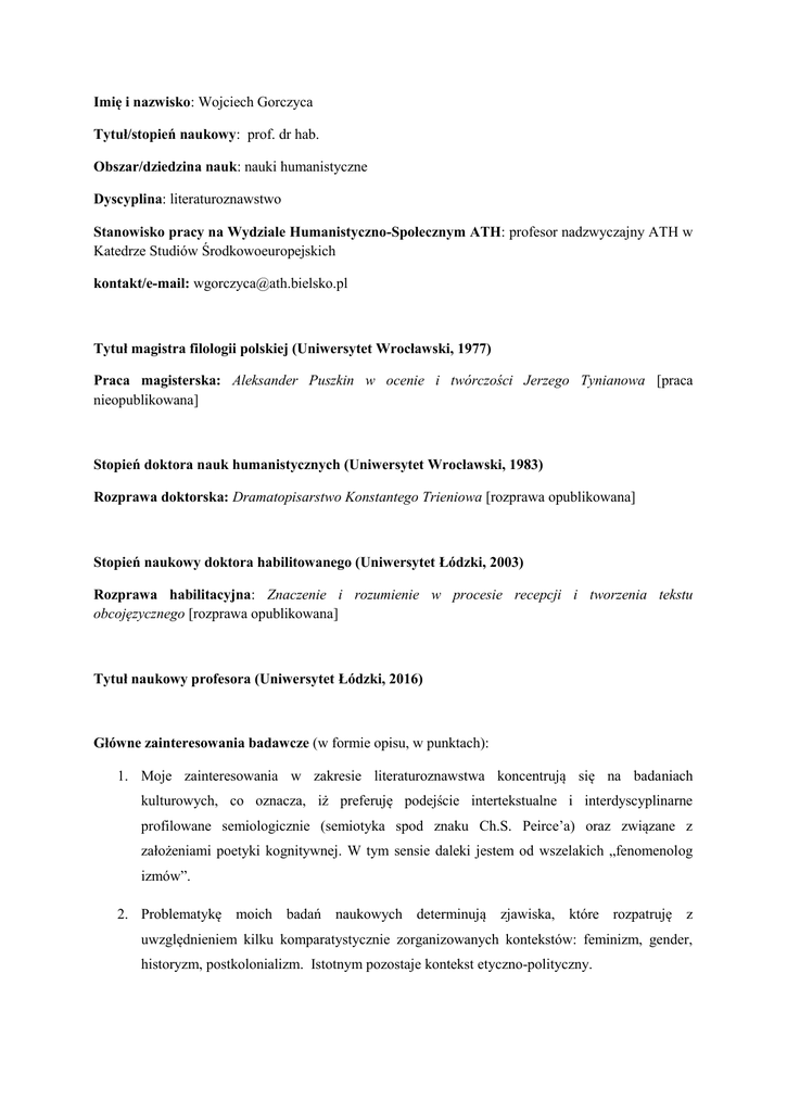 Imię i nazwisko: Wojciech Gorczyca Tytuł/stopień naukowy: prof. dr hab. Obszar/dziedzina nauk: nauki humanistyczne Dyscyplina: literaturoznawstwo Stanowisko pracy na Wydziale Humanistyczno-Społecznym ATH: profesor nadzwyczajny ATH w Katedrze Studiów Środkowoeuropejskich kontakt/e-mail: [email protected] Tytuł magistra filologii polskiej (Uniwersytet Wrocławski, 1977) Praca magisterska: Aleksander Puszkin w ocenie i twórczości Jerzego Tynianowa [praca nieopublikowana] Stopień doktora nauk humanistycznych (Uniwersytet Wrocławski, 1983) Rozprawa doktorska: Dramatopisarstwo Konstantego Trieniowa [rozprawa opublikowana] Stopień naukowy doktora habilitowanego (Uniwersytet Łódzki, 2003) Rozprawa habilitacyjna: Znaczenie i rozumienie w procesie recepcji i tworzenia tekstu obcojęzycznego [rozprawa opublikowana] Tytuł naukowy profesora (Uniwersytet Łódzki, 2016) Główne zainteresowania badawcze (w formie opisu, w punktach): 1. Moje zainteresowania w zakresie literaturoznawstwa koncentrują się na badaniach kulturowych, co oznacza, iż preferuję podejście intertekstualne i interdyscyplinarne profilowane semiologicznie (semiotyka spod znaku Ch.S. Peirce’a) oraz związane z założeniami poetyki kognitywnej. W tym sensie daleki jestem od wszelakich „fenomenolog izmów”. 2. Problematykę moich badań naukowych determinują zjawiska, które rozpatruję z uwzględnieniem kilku komparatystycznie zorganizowanych kontekstów: feminizm, gender, historyzm, postkolonializm. Istotnym pozostaje kontekst etyczno-polityczny. 3. W ostatnich latach (2011/2015) moje badania zdominowała problematyka utopii i antyutopii w literaturze rosyjskiej i literaturach słowiańskich w ogóle. Szczególnie dotyczyło to identyfikacji składnika destrukcyjno-krytycznego w literaturze rosyjskiej. Składnik ów decyduje o tym, iż literatura ta nie jest w sensie kulturowym i cywilizacyjnym literaturą słowiańską. 4. Istotną częścią moich badań pozostają badania w zakresie glottodydaktyki. Utrzymują się one w nurcie Langackerowskim, co oznacza, iż odrzucam koncepcje glottodydaktyki autonomicznej, która nawiązuje do założeń gramatyki generatywno-transformacyjnej Noama Chomsky’ego i dychotomicznie rozumianego podejścia komunikacyjnego (kompetencja lingwistyczna – kompetencja komunikacyjna). Próby adaptacji teorii konstruktywistycznej uczenia się na grunt glottodydaktyki neguję. Najważniejsze książki/monografie naukowe (autorskie i pod redakcją): AUTORSKIE KSIĄŻKI NAUKOWE Dramatopisarstwo Konstantego Trieniowa, Wrocław 1990, s. 125. Znaczenie i rozumienie w procesie recepcji i tworzenia tekstu obcojęzycznego, Warszawa 2000, ss. 153. Mariny Cwietajewej myśli o Innym, Bielsko-Biała 2004, ss. 102. Briusow * Iwanow * Gumilow. Prawdy o micie, symbolu i historii, Bielsko-Biała 2008, ss. 195. Iwan IV Groźny. Portret kulturowy władcy, Bielsko-Biała 2012, ss. 249. Utopizmy Lwa Tołstoja (1852-1869), Bielsko-Biała 2015, ss. 139. PUBLIKACJE ZBIOROWE POD REDAKCJĄ Historia w historii Rosji. Literatura i dokument, red. W. Gorczyca, Bielsko-Biała 2007, s. 87. Pamięć lingwistyczna i pamięć kulturowa w przekładzie, red. W. Gorczyca i E. Michalska, Bielsko-Biała 2008, ss. 102. Topos władcy w kulturze Rosji, red. W. Gorczyca, Bielsko-Biała 2009, s. 105. Tekst literacki i tekst kultury w glottodydaktyce, red. W. Gorczyca, Bielsko-Biała 2010, s. 155. Problemy utopii i antyutopii w literaturach słowiańskich i historii Słowian. Red. naukowa W. Gorczyca i I. Pospišil, Bielsko-Biała 2014, s. 217. Lista najważniejszych recenzowanych artykułów naukowych odzwierciedlających główne zainteresowania badawcze: ARTYKUŁY W CZASOPISMACH I ROZDZIAŁY W PRACACH ZBIOROWYCH Funkcja przestrzeni w dramatach Konstantego Trieniowa „Пyгaчeвщинa” i „Любoвь Яpoвaя”, „Slavica Wratislaviensia , XXII 1982, s. 53-66. Inspiracje filmowe w twórczości prozatorskiej Jurija Tynianowa lat dwudziestych, „Slavica Wratislaviensia”, XXIII 1982, s. 43-58. Czternasty grudnia. Zapomniany dramat Jurija Tynianowa, „Slavica Wratislaviensia, XXXI 1984, s. 67-77. Postaci w Intermedium 1905 roku Konstantego Trieniowa, „Slavica Wratislaviensia”, XXIX 1984, s.31-40. Monolog i dialog w dramatach Konstantego Trieniowa, „Studia Rossica Posnaniensia”, XX 1988, s.117-132. Koncepcja teatru wewnętrznego Aleksandra Wampiłowa, „Slavica Wratislaviensia”, L 1989, s. 77-86. O czasoprzestrzennym centrum w twórczości Michała Bułhakowa, „Slavica Wratislaviensia”, LXXIV 1992. O uczeniu się kategorii u Mariny Cwietajewej, „Języki Obce w Szkole”, nr 5 2002, s. 11-17. Профиль белого и черного в поэзии Марины Цветаевой, «Русский язык за рубежом», №2/2003, стр. 84-90. Mit scytyjski Walerego Briusowa, w: Pocta Evĕ Mrhačowẻ, Ostrawa 2006, s. 273-284. Dwaj królowie Walerego Briusowa, w: Historia w historii Rosji. Literatura i dokument, pod red. W. Gorczycy, Bielsko-Biała 2007, s. 9-17. Biegacze Prometeusza, „Studia Slavica” XI, Ostrava 2007, s. 53-70. Metafora w polskich przekładach „Kindżału” Michała Lermontowa, [w:] Pamięć kulturowa i pamięć lingwistyczna w przekładzie, pod red. W. Gorczycy i E. Michalskiej, Wyd. Naukowe ATH, Bielsko-Biała 2008, s. 7-14. Iwan Groźny – fenomen władcy złego, [w:] Topos władcy w kulturze Rosji, pod red. W. Gorczycy, Bielsko-Biała 2009, s. 7-14. Historyczno-mityczny i retoryczny Iwan Groźny, „Studia Slavica” XIII, Ostrava 2009, s. 121132. Две «Шинели» в плане семиотического понимания, „Litteraria Humanitas” XV. (N.V. Gogol: Bytí díla v prostoru a čase (Studie o živém dĕdictví), Brno 2010, s. 119-130. Ikoniczny Iwan Groźny, „Studia Slavica” XIV, Opole 2010, s. 187-197. O ingerencji Iwana Groźnego w los podwładnych. „Proudy”. Středoevropskỳ časopis pro vĕdu a literaturu, 3/ 4 2