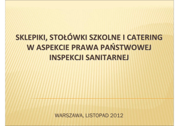 SKLEPIKI, STOŁÓWKI SZKOLNE I CATERING W ASPEKCIE PRAWA PAŃSTWOWEJ INSPEKCJI SANITARNEJ WARSZAWA, LISTOPAD 2012 Zgodnie z art. 61 Ustawy o bezpieczeństwie żywności i żywienia z dnia 25 sierpnia 2006r. „Państwowy powiatowy inspektor sanitarny lub państwowy graniczny inspektor sanitarny są organami właściwymi w sprawach rejestracji oraz zatwierdzania, warunkowego zatwierdzania, przedłużania warunkowego zatwierdzania, zawieszania oraz cofania zatwierdzenia zakładów, które: 1) produkują lub wprowadzają do obrotu żywność pochodzenia niezwierzęcego (…) 3)produkują lub wprowadzają do obrotu żywność zawierającą jednocześnie środki spożywcze pochodzenia niezwierzęcego i produkty pochodzenia zwierzęcego, o której mowa w art.1 ust. 2 rozporządzenia nr 853/2004, z zastrzeżeniem art. 73 ust. 6 (…) w trybie i na zasadach określonych w rozporządzeniu nr 852/2004 i rozporządzeniu nr 882/2004 Rozporządzenie (WE) Nr 852 w sprawie higieny środków spożywczych określa warunki jakie powinny spełniać obiekty produkujące i wprowadzające żywność do obrotu, w tym sklepiki szkolne, stołówki, zakłady cateringowe. Wydawane przez właściwego PPIS ze względu na miejsce prowadzenia działalności decyzje zatwierdzające lub zaświadczenia o wpisie do rejestru obiektów objętych nadzorem PIS określają szczegółowo zakres działalności jaki może być prowadzony w danym obiekcie żywieniowo żywnościowym. W przypadku stołówek korzystających z usług zakładów cateringowych wskazane jest zapoznanie się z treścią decyzji PPIS wydanych dla w/w zakładów. Zakłady, które otrzymują gotowe posiłki, a na miejscu jedynie je porcjują lub podgrzewają są również zobowiązane do wystąpienia do PPIS z wnioskiem o zatwierdzenie i wpis do rejestru obiektów. Obowiązujące przepisy prawa żywnościowego nie regulują rodzaju żywności mogącej być przedmiotem produkcji lub sprzedaży w stołówkach czy sklepikach szkolnych, jak również brak jest w przepisach wymagań odnośnie prawidłowości układania jadłospisów i kaloryczności wydawanych posiłków: Zalecane są w tym zakresie normy żywienia opracowane przez Instytut Żywności i Żywienia. Zgodnie z art. 72 cytowanej Ustawy 1. Zakład żywienia zbiorowego typu zamkniętego może przechowywać próbki wszystkich potraw o krótkim okresie przydatności do spożycia, wyprodukowanych i przeznaczonych do żywienia konsumentów w tym zakładzie. 2. Zakład, o którym mowa w ust. 1, w przypadku wprowadzania do obrotu gotowych potraw pochodzących z innych zakładów przechowuje próbki poszczególnych potraw otrzymanych wraz z dostawą partii każdej potrawy o krótkim okresie przydatności do spożycia z zakładu, w którym zostały wyprodukowane. 3. Na podstawie pisemnej umowy zakłady, o których mowa w ust. 2, mogą ustalić, że obowiązek pobierania i przechowywania próbek potraw będzie dotyczył zakładu, w którym potrawy te zostały wyprodukowane. 4. Pobrane próbki potraw są udostępniane organom Państwowej Inspekcji Sanitarnej na żądanie tych organów. dnie z art. 72 cytowanej Ustawy