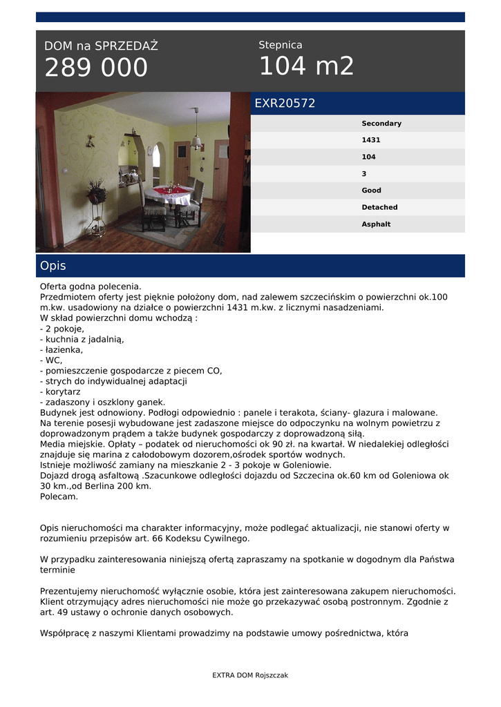DOM na SPRZEDAŻ 289 000 Stepnica 104 m2 EXR20572 Secondary 1431 104 3 Good Detached Asphalt Opis Oferta godna polecenia. Przedmiotem oferty jest pięknie położony dom, nad zalewem szczecińskim o powierzchni ok.100 m.kw. usadowiony na działce o powierzchni 1431 m.kw. z licznymi nasadzeniami. W skład powierzchni domu wchodzą : - 2 pokoje, - kuchnia z jadalnią, - łazienka, - WC, - pomieszczenie gospodarcze z piecem CO, - strych do indywidualnej adaptacji - korytarz - zadaszony i oszklony ganek. Budynek jest odnowiony. Podłogi odpowiednio : panele i terakota, ściany- glazura i malowane. Na terenie posesji wybudowane jest zadaszone miejsce do odpoczynku na wolnym powietrzu z doprowadzonym prądem a także budynek gospodarczy z doprowadzoną siłą. Media miejskie. Opłaty – podatek od nieruchomości ok 90 zł. na kwartał. W niedalekiej odległości znajduje się marina z całodobowym dozorem,ośrodek sportów wodnych. Istnieje możliwość zamiany na mieszkanie 2 - 3 pokoje w Goleniowie. Dojazd drogą asfaltową .Szacunkowe odległości dojazdu od Szczecina ok.60 km od Goleniowa ok 30 km.,od Berlina 200 km. Polecam. Opis nieruchomości ma charakter informacyjny, może podlegać aktualizacji, nie stanowi oferty w rozumieniu przepisów art. 66 Kodeksu Cywilnego. W przypadku zainteresowania niniejszą ofertą zapraszamy na spotkanie w dogodnym dla Państwa terminie Prezentujemy nieruchomość wyłącznie osobie, która jest zainteresowana zakupem nieruchomości. Klient otrzymujący adres nieruchomości nie może go przekazywać osobą postronnym. Zgodnie z art. 49 ustawy o ochronie danych osobowych. Współpracę z naszymi Klientami prowadzimy na podstawie umowy pośrednictwa, która EXTRA DOM Rojszczak wymaga formy pisemnej pod rygorem nieważności, zgodnie z art. 180, pkt 3 Ustawy o gospodarce nieruchomościami. Nasze transakcje objęte są ubezpieczeniem od odpowiedzialności cywilnej na kwotę 200 000,00 EURO. BIURO NIERUCHOMOŚCI EXTRA DOM ROJSZCZAK 72-200 Nowogard ul. Boh. Warszawy 1 (przy placówce Alior Banku) www.extradom.net.pl tel./fax 91 392 22 33 Co robimy dla klienta zainteresowanego zakupem: * Sprawdzamy zdolność kredytową * Wyszukujemy odpowiednią nieruchomość, * Pomagamy w prowadzeniu negocjacji, * Pomagamy w uzyskaniu potrzebnych dokumentów * Pomagamy w uzyskaniu kredytu hipotecznego * Współpracujemy z kancelariami notarialnymi, geodetami Korzystając z naszych usług oszczędzasz swój czas, a także zyskujesz pewność, że Twoja transakcja zostanie przeprowadzona z należytą starannością, w sposób profesjonalny i co najważniejsze - BEZPIECZNY. Nr licencji pośredników: 21317, 21318 Dorota Więzowska tel. 517 770 353 tel. (91) 392 22 33 email: [email protected] EXTRA DOM Rojszczak Powered by TCPDF (www.tcpdf.org)