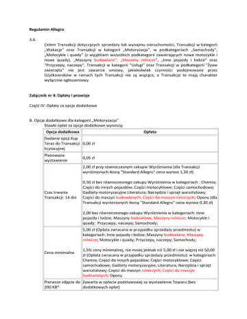 Regulamin Allegro 3.6. Celem Transakcji dotyczących sprzedaży lub wynajmu nieruchomości, Transakcji w kategorii „Wakacje” oraz Transakcji w kategorii „Motoryzacja”, w podkategoriach „Samochody”, „Motocykle i quady” (z wyjątkiem wszystkich podkategorii zawierających nowe motocykle i nowe quady), „Maszyny budowlane”, „Maszyny rolnicze”, „Inne pojazdy i łodzie” oraz "Przyczepy, naczepy", Transakcji w kategorii "Usługi" oraz Transakcji w podkategorii "Żywe zwierzęta" nie jest zawarcie umowy, jakiekolwiek czynności podejmowane przez Użytkowników w ramach tych Transakcji nie są wiążące, a Transakcje te mają charakter wyłącznie ogłoszeniowy. Załącznik nr 4: Opłaty i prowizje Część IV: Opłaty za opcje dodatkowe B. Opcje dodatkowe dla kategorii „Motoryzacja” Stawki opłat za opcje dodatkowe wynoszą: Opcja dodatkowa Opłata Dodanie opcji Kup Teraz do Transakcji 0,00 zł licytacyjnej Planowane wystawienie 0,05 zł 2,00 zł przy równoczesnym zakupie Wyróżnienia (dla Transakcji wyróżnionych ikoną "Standard Allegro" cena wynosi 1,30 zł) Czas trwania Transakcji: 14 dni 0,50 zł bez równoczesnego zakupu Wyróżnienia w kategoriach : Chemia; Części do innych pojazdów; Części motocyklowe; Części samochodowe; Gadżety motoryzacyjne Literatura; Narzędzia i sprzęt warsztatowy; Części do maszyn budowlanych; Części do maszyn rolniczych; Opony (dla Transakcji wyróżnionych ikoną "Standard Allegro" cena wynosi 0,30 zł) 2,00 bez równoczesnego zakupu Wyróżnienia w kategoriach: Inne pojazdy i łodzie; Maszyny budowlane; Maszyny rolnicze; Motocykle i quady; Przyczepy, naczepy; Samochody; 5,00 zł (Opłata zwracana w przypadku sprzedaży przedmiotu) w kategoriach: Inne pojazdy i łodzie; Maszyny budowlane; Maszyny rolnicze; Motocykle i quady; Przyczepy, naczepy; Samochody; Cena minimalna 1,5% ceny minimalnej, nie mniej jednak niż 5,00 zł i nie więcej niż 50,00 zł (Opłata zwracana w przypadku sprzedaży przedmiotu): w kategoriach: Chemia; Części do innych pojazdów; Części motocyklowe; Części samochodowe; Gadżety motoryzacyjne; Literatura; Narzędzia i sprzęt warsztatowy; Części do maszyn rolniczych; Części do maszyn budowlanych; Opony Pierwsze zdjęcie do Zawarta w opłacie podstawowej za wystawienie Towaru (bez 200 KB* dodatkowych opłat) Każde dodatkowe zdjęcie (drugie i kolejne) do 200 KB* 0,10 zł 2,00 zł dla kategorii : Chemia; Części do innych pojazdów; Części motocyklowe; Części samochodowe; Gadżety motoryzacyjne; Literatura; Części do maszyn budowlanych; Części do maszyn rolniczych; Opony Pogrubienie 4,00 zł dla kategorii: Inne pojazdy i łodzie; Maszyny budowlane; Maszyny rolnicze; Motocykle i quady; Narzędzia i sprzęt warsztatowy; Przyczepy, naczepy; Samochody; 3,00 zł dla kategorii: Chemia; Części do innych pojazdów; Części motocyklowe; Części samochodowe; Gadżety motoryzacyjne; Literatura; Części do maszyn budowlanych; Części do maszyn rolniczych; Opony Podświetlenie 6,00 zł w kategoriach: Inne pojazdy i łodzie; Maszyny budowlane; Maszyny rolnicze; Motocykle i quady; Narzędzia i sprzęt warsztatowy; Przyczepy, naczepy; Samochody; Wyróżnienie 19,00 zł w kategoriach: Chemia; Części do innych pojazdów; Części motocyklowe; Części samochodowe; Gadżety motoryzacyjne; Literatura; Części do maszyn budowlanych; Części do maszyn rolniczych; Opony; (dla Transakcji wyróżnionych ikoną "Standard Allegro" cena wynosi 12,00 zł) 19,00 zł w kategoriach: Maszyny budowlane; Maszyny rolnicze; Motocykle; Narzędzia i sprzęt warsztatowy; Przyczepy, naczepy; 24,00 zł w kategoriach: Inne pojazdy i łodzie; Samochod Strona działu 18,00 zł w kategoriach: Chemia; Części motocyklowe; Części samochodowe; Gadżety motoryzacyjne; Literatura; Narzędzia i sprzęt warsztatowy; Części do maszyn budowlanych; Części do maszyn rolniczych; Części do innych pojazdów; Opony (dla Transakcji wyróżnionych ikoną "Standard Allegro" cena wynosi 15,00 zł) 29,00 zł w kategoriach: Samochody; Motocykle i quady; Inne pojazdy i łodzie; Maszyny budowlane; Maszyny rolnicze; Przyczepy, naczepy; Załącznik nr 6. Polityka ochrony prywatności Dopiszemy nowy artykuł jako 15. (obecny 15 zmieni numerację na 16). Treść dopisanego artykułu: 15. Aplikacja mobilna Allegro używa usługi Google Account w celu uwierzytelnienia urządzenia Użytkownika i potwierdzenia jego tożsamości. W trakcie procesu uwierzytelnienia i weryfikacji nie są pozyskiwane ani zapisywane żadne dane Użytkownika pochodzące od operatora zewnętrznej usługi.