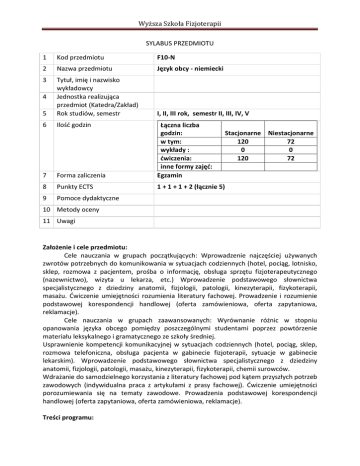 Wyższa Szkoła Fizjoterapii SYLABUS PRZEDMIOTU 1 Kod przedmiotu F10-N 2 Nazwa przedmiotu Język obcy - niemiecki 3 5 Tytuł, imię i nazwisko wykładowcy Jednostka realizująca przedmiot (Katedra/Zakład) Rok studiów, semestr I, II, III rok, semestr II, III, IV, V 6 Ilość godzin 4 7 Forma zaliczenia Łączna liczba godzin: w tym: wykłady : ćwiczenia: inne formy zajęć: Egzamin 8 Punkty ECTS 1 + 1 + 1 + 2 (łącznie 5) 9 Pomoce dydaktyczne Stacjonarne Niestacjonarne 120 72 0 0 120 72 10 Metody oceny 11 Uwagi Założenie i cele przedmiotu: Cele nauczania w grupach początkujących: Wprowadzenie najczęściej używanych zwrotów potrzebnych do komunikowania w sytuacjach codziennych (hotel, pociąg, lotnisko, sklep, rozmowa z pacjentem, prośba o informację, obsługa sprzętu fizjoterapeutycznego (nazewnictwo), wizyta u lekarza, etc.) Wprowadzenie podstawowego słownictwa specjalistycznego z dziedziny anatomii, fizjologii, patologii, kinezyterapii, fizykoterapii, masażu. Ćwiczenie umiejętności rozumienia literatury fachowej. Prowadzenie i rozumienie podstawowej korespondencji handlowej (oferta zamówieniowa, oferta zapytaniowa, reklamacje). Cele nauczania w grupach zaawansowanych: Wyrównanie różnic w stopniu opanowania języka obcego pomiędzy poszczególnymi studentami poprzez powtórzenie materiału leksykalnego i gramatycznego ze szkoły średniej. Usprawnienie kompetencji komunikacyjnej w sytuacjach codziennych (hotel, pociąg, sklep, rozmowa telefoniczna, obsługa pacjenta w gabinecie fizjoterapii, sytuacje w gabinecie lekarskim). Wprowadzenie podstawowego słownictwa specjalistycznego z dziedziny anatomii, fizjologii, patologii, masażu, kinezyterapii, fizykoterapii, chemii surowców. Wdrażanie do samodzielnego korzystania z literatury fachowej pod kątem przyszłych potrzeb zawodowych (indywidualna praca z artykułami z prasy fachowej). Ćwiczenie umiejętności porozumiewania się na tematy zawodowe. Prowadzenia podstawowej korespondencji handlowej (oferta zapytaniowa, oferta zamówieniowa, reklamacje). Treści programu: Wyższa Szkoła Fizjoterapii Grupy początkujące: Głównym zadaniem nauczania języka niemieckiego na poziomie elementarnym jest wprowadzenie podstawowych struktur gramatycznych oraz zakres słownictwa umożliwiającego podstawowa komunikacje w ramach czterech podstawowych sprawności językowych – mówienia, rozumienia, czytania i pisania. Program realizowany jest w oparciu o podręczniki i materiały autentyczne (czasopisma fachowe i naukowe, urządzenia i słownictwo fizjoterapeutyczne). Tematyka: 2. i 3. semestr: Tematyka ogólna ( sytuacje codzienne, small talk) i parametryczna (nacisk na język specjalistyczny) 4. i 5. semestr: Podstawowe słownictwo z zakresu patologii, masażu, kinezyterapii, fizykoterapii. Słownictwo zawodowe. Grupy zaawansowane: Głównym zadaniem nauczania języka niemieckiego na poziomie zaawansowanym jest doskonalenie praktycznej znajomości języka w ramach czterech podstawowych sprawności językowych – mówienia, rozumienia, czytania i pisania. Tematyka: 2. semestr: Tematyka ogólna (sytuacje codzienne, small talk, etc.), słownictwo zawodowe. 3. semestr: Słownictwo z zakresu anatomii i fizykoterapii. 4. i 5. semestr: Konwersacje dotyczące zagadnień kinezyterapii, fizykoterapii, patologii, masażu. Zakres materiału gramatycznego: Czasy, strona bierna, czasowniki modalne, zdania warunkowe, tworzenie pytań, rozkazów, zdania grzecznościowe, tryb przypuszczający. Materiał gramatyczny i ćwiczenia dostosowane do poziomu grupy i aktualnych potrzeb. Literatura: 1) Bęza S. Nowe repetytorium z języka niemieckiego. Warszawa 2000 2) Podręczny słownik polsko-niemiecki, Wiedza Powszechna. Warszawa 2000 3) Wörterbuch medizinischer Fachausdrücke. Dudenverlag. Manheim 1998 4) Dreyer S. Praktyczna gramatyka j. niemieckiego. REA 1998 5) Muesch, Esser. Die deutsche Sprache. Max Hueber Verlag 2003 6) Griesbach, Schulz. 1000 deutsche Redensarten. Berlin 2000 7) Hacker, Klett. Neue Schreibung. Stuttgart 1996 8) Heller K. Rechtsschreibung. Lektor 2000 9) Haberg, Lewiccy. Mała gramatyka języka niemieckiego. PWN. Warszawa 2003 10) Janik E. Deutsch für Medizinstudenten. PZWL. Warszawa 1998 11) Laskant S. Das neue Trendwort. Bertelsmann.2004 12) Papa. Charly hat gesagt. Langenscheidt. Berlin 1996 13) Reymont, Tomiczek. Grammatik? Kein Problem. Kwant. Wrocław 1999 14) Tafil-Klawe M., Klawe J. Podręczny słownik medyczny polsko-niemiecki i niemieckopolski, Warszawa 2007