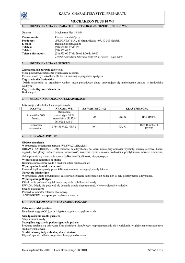 KARTA CHARAKTERYSTYKI PREPARATU MUCHAKRON PLUS 10 WP 1. IDENTYFIKACJA PREPARATU I IDENTYFIKACJA PRZEDSIĘBIORSTWA Nazwa: Muchakron Plus 10 WP Zastosowanie: Producent: E-mail: Telefon: Telefax: Telefon alarmowy: Preparat owadobójczy „FREGATA” S.A., ul. Grunwaldzka 497, 80-309 Gdańsk [email protected] (58) 552 00 27 do 29 (58) 552 48 31 (58) 552 00 27 do 29 od 8:00 do 16:00 Telefony ośrodków toksykologicznych w Polsce – p.16. karty 2. IDENTYFIKACJA ZAGROŻEŃ Zagrożenia dla zdrowia człowieka Może powodować uczulenie w kontakcie ze skórą. Preparat może być szkodliwy dla ludzi i zwierząt w przypadku spożycia. Zagrożenia dla środowiska Działa toksycznie na organizmy wodne; może powodować długo utrzymujące się niekorzystne zmiany w środowisku wodnym. Zagrożenia fizyczne / chemiczne Brak danych. 3. SKŁAD / INFORMACJA O SKŁADNIKACH Informacja o składnikach niebezpiecznych: NAZWA NR CAS / WE Mieszanina Azametifos 50% zawierająca 50 % Premix azametifosu (3557596-3/252-626-0) Benzoesan 3734-33-6/223-095-2 denatonium 4. ZAWARTOŚĆ [%] KLASYFIKACJA 20 Xn, N R43, R50/53 <0,1 Xn, Xi R22, R36/37/38, R52/53 PIERWSZA POMOC Objawy narażenia W przypadku podejrzenia zatrucia WEZWAĆ LEKARZA. OBJAWY ZATRUCIA LUDZI: trudności w oddychaniu, ból oczu, utrata przytomności, wymioty, objawy sercowe, kolka, drgawki, ból głowy, skórcze mięśni, nerwowość, zwężenie źrenic - miosis, trudności z przełykaniem, uczucie osłabienia, obfite pocenie się, zaburzenia mowy (bełkotliwość), ślinotok, niedyspozycja. W przypadku kontaktu ze skórą Dokładnie umyć skórę wodą z mydłem, zdjąć brudną odzież. W przypadku kontaktu z oczami Płukać dużą ilością wody przez kilkanaście minut i zasięgnąć porady lekarza. Narażenie inhalacyjne W przypadku utraty przytomności zastosować sztuczne oddychanie lub podać tlen w celu podtrzymania oddychania. W przypadku połknięcia Kilkakrotnie podawać węgiel medyczny w dużych ilościach wody. UWAGA: Nigdy nie podawać nic doustnie osobie nieprzytomnej. Nie wywoływać wymiotów. Uwaga dla lekarza Produkt to inhibitor esterazy cholinowej. ANTIDOTUM: atropina pod nadzorem lekarza. 5. POSTĘPOWANIE W PRZYPADKU POŻARU Zalecane środki gaśnicze Dwutlenek węgla (CO ), proszki gaśnicze, piana, rozpylona woda 2 Nieodpowiednie środki gaśnicze Silny strumień wody Szczególne zagrożenia podczas gaszenia pożaru Produkty spalania są toksyczne i/lub drażniące. Zapobiegać rozprzestrzenianiu się i wsiąkaniu w glebę zanieczyszczonych środków gaśniczych. Środki ochrony indywidualnej dla strażaków Używać aparatu oddechowego do ochrony przed oparami. Data wydania:09.2008 / Data aktualizacji: 08.2010 Strona 1 z 5 KARTA CHARAKTERYSTYKI PREPARATU MUCHAKRON PLUS 10 WP 6. POSTĘPOWANIE W PRZYPADKU NIEZAMIERZONEGO UWOLNIENIA DO ŚRODOWISKA Indywidualne środki ostrożności Stosować ubranie i rękawice ochronne. Patrz punkt 8 karty. Ochrona środowiska Nie dopuścić do przedostania się produktu do kanalizacji, cieków i zbiorników wodnych, wód gruntowych lub gleby. Metody usuwania zanieczyszczeń Zebrać rozsypany produkt do szczelnych, oznakowanych opakowań w celu bezpiecznej utylizacji. Zwilżyć ostrożnie w celu ograniczenia pylenia. Rozsypany produkt nie może być użyty i musi być utylizowany. Jeżeli bezpieczna utylizacja nie jest możliwa, skontaktować się z producentem lub przedstawicielem lokalnym. 7. POSTĘPOWANIE Z PREPARATEM I JEGO MAGAZYNOWANIE Postępowanie z preparatem Ogólne: Unikać wdychania pyłu. Unikać kontaktu z oczyma, skórą i odzieżą. Pracować tylko w miejscach dobrze wentylowanych. Zapewnić szczelność aparatury. Poza normalnie stosowanym w przemyśle chemicznym osobistym sprzętem ochronnym mogą być konieczne inne środki. Magazynowanie Przechowywać w oryginalnych zamkniętych opakowaniach. Nie przechowywać razem z żywnością, napojami i paszami dla zwierząt. Minimalna temperatura przechowywania: 5oC Maksymalna temperatura przechowywania: 30oC 8. KONTROLA NARAŻENIA I ŚRODKI OCHRONY INDYWIDUALNEJ Wartości graniczne narażenia Brak danych. W praktyce przemysłowej Ryzyko toksykologiczne przy pracy z produktem: nieznacznie podwyższone. Codziennie zmieniać odzież roboczą. Kontrola narażenia w miejscu pracy - działania organizacyjne (techniczne) Brak danych. Ochrona dróg oddechowych Przy silnym narażeniu - maska pyłochronna. Ochrona rąk Rękawice ochronne. Ochrona oczu Okulary ochronne. Ochrona skóry Odzież ochronna. Kontrola narażenia środowiska Brak danych. 9. WŁAŚCIWOŚCI FIZYCZNE I CHEMICZNE Dane ogólne Postać, stan fizyczny proszek Kolor biały do jasnobeżowego Zapach nieprzyjemny Dane techniczne pH 4,0 do 6,0 (1% dyspersja w wodzie CIPAC A) Temperatura wrzenia/zakres temperatur wrzenia nie dotyczy Temperatura zapłonu brak danych Palność (ciała stałego, gazu) °C pali się Właściwości wybuchowe brak danych Właściwości utleniające nie ma Prężność par nie dotyczy Gęstość nasypowa 0,5-0,7 g/cm3 Rozpuszczalność w innych rozpuszczalnikach nie dotyczy Zachowanie w wodzie miesza się tworząc dyspersję Współczynnik podziału: n-oktanol/woda nie dotyczy Lepkość nie dotyczy Gęstość par nie dotyczy Szybkość parowania nie dotyczy Data wydania:09.2008 / Data aktualizacji: 08.2010 Strona 2 z 5 KARTA CHARAKTERYSTYKI PREPARATU MUCHAKRON PLUS 10 WP 10. STABILNOŚĆ I REAKTYWNOŚĆ Stabilność Trwały w normalnych warunkach. Nie jest korozyjny. Niebezpieczne reakcje / polimeryzacja Brak danych. Warunki, których należy unikać Nie przechowywać razem z żywnością, napojami i paszami dla zwierząt. Unikać wilgoci. Czynniki, których należy unikać Brak danych. Niebezpieczne produkty rozkładu Brak danych. 11. INFORMACJE TOKSYKOLOGICZNE Skutki toksycznego działania na zdrowie człowieka Szczur oralnie LD (mg/kg): > 2000 50 Szczur dermalnie LD 50 (mg/kg): > 2000 3 Szczur inhalacyjnie LC (mg/m ): ok. 7000 (4h) 50 Drogi narażenia 
