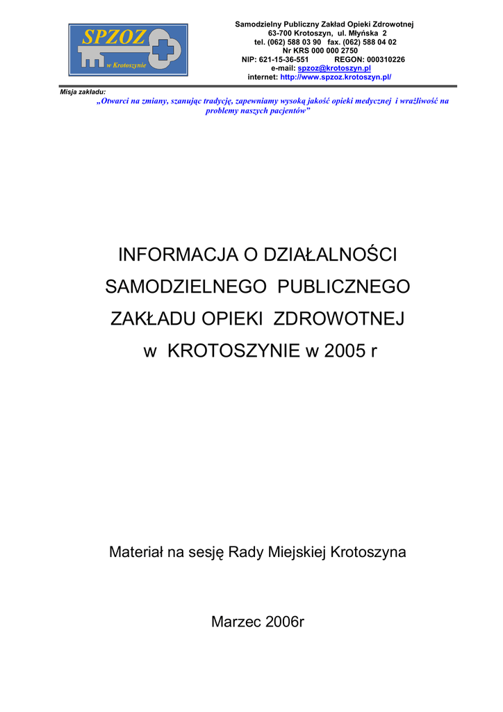 Samodzielny Publiczny Zakład Opieki Zdrowotnej 63-700 Krotoszyn, ul. Młyńska 2 tel. (062) 588 03 90 fax. (062) 588 04 02 Nr KRS 000 000 2750 NIP: 621-15-36-551 REGON: 000310226 e-mail: [email protected] internet: http://www.spzoz.krotoszyn.pl/ Misja zakładu: „Otwarci na zmiany, szanując tradycję, zapewniamy wysoką jakość opieki medycznej i wrażliwość na problemy naszych pacjentów” INFORMACJA O DZIAŁALNOŚCI SAMODZIELNEGO PUBLICZNEGO ZAKŁADU OPIEKI ZDROWOTNEJ w KROTOSZYNIE w 2005 r Materiał na sesję Rady Miejskiej Krotoszyna Marzec 2006r Krotoszyn, marzec 2006 Szanowni Państwo! Przekazujemy już drugi raz na posiedzenie Rady Miejskiej Krotoszyna materiał informacyjny, obrazujący sytuację opieki zdrowotnej na terenie miasta i gminy w zakresie świadczeń realizowanych przez Samodzielny Publiczny Zakład Opieki Zdrowotnej w Krotoszynie/SPZOZ/. Zasięg terytorialny naszej działalności obejmuje cały powiat krotoszyński a także z naszych usług korzystają liczni pacjenci z powiatów sąsiednich i osoby przyjezdne. Oferta świadczeń SPZOZ jest bardzo szeroka i kompleksowa, od 1999 roku nie obejmuje jednak, poza wymuszoną przebiegiem zdarzeń wokół kontraktowania świadczeń na 2004, 2005 i 2006 rok oraz w wyniku rokowań Narodowego Funduszu Zdrowia/NFZ/ z Porozumieniem Zielonogórskim/PZ/ tzw. pomocą doraźną w zastępstwie podstawowej opieki zdrowotnej/POZ/, tego znaczącego ogniwa systemu jakim jest POZ. SPZOZ nie prowadzi również działalności w zakresie stomatologii i niektórych ambulatoriów specjalistycznych, w kilku zakresach specjalistyki ambulatoryjnej konkurujemy ze świadczeniodawcami prywatnymi, prowadzącymi działalność w formie NZOZ /zakładów niepublicznych/ lub grupowych czy indywidualnych praktyk lekarskich. Materiał niniejszy więc, chociaż obejmujący kluczowy i rozległy zakres świadczeń, siłą rzeczy nie pozwala na wnioskowanie o całości sytuacji w opiece zdrowotnej na terenie miasta i gminy. W lutym br. SPZOZ zakończył kilkumiesięczny cykl negocjacji i rokowań z Wielkopolskim Oddziałem Wojewódzkim NFZ, mający na celu podpisanie umów, tzw. kontraktów na realizację świadczeń zdrowotnych finansowanych przez NFZ. Ani wynegocjowane limity liczb punktów za określone świadczenia ani ich wartości nie są satysfakcjonujące dla świadczeniodawców. Co więcej, pomimo 8% wzrostu planu finansowego NFZ suma wartości zawartych na 2006 rok kontraktów jest o 19 000 zł. mniejsza od sumy wyjściowej na 2005 rok. Tym niemniej dostępność świadczeń możliwych do uzyskania na terenie powiatu i gminy jest nadal nieporównywalnie lepsza niż w roku 1999, pomimo wciąż oczywistego kryzysu prawno-finansowo-organizacyjnego w polskiej ochronie zdrowia. Sytuacja Wielkopolski, lepsza niż w wielu województwach w kraju, wynika z wcześniej podjętych działań restrukturyzacyjnych, także w obrębie naszej instytucji. Przyrost wartości kontraktów na 2005 rok o ponad milion złotych, pomimo 4,5% inflacji i rosnących kosztów leków, materiałów medycznych i sprzętu a także wzrostu kosztów mediów i paliw, pozwolił nam skonstruować plan finansowy na 2005 rok bez zakładanej a priori straty. Obniżenie kontraktu w ciągu roku przez NFZ w dializoterapii i większy od spodziewanego przyrost kosztów związany z realizacją dużej liczby świadczeń ponad umowny limit spowodował konieczność korekty planu, w listopadzie 2005 spodziewaliśmy się na koniec roku 400 000 zł. straty bilansowej. Na przełomie roku NFZ zdecydował się zapłacić jednak za dużą część świadczeń ponad limitowych. Ostatecznie bilans roku 2005 przyniósł ok. 27 000 zł. zysku przy ponad 26,5 mln obrotu, co przy jednoczesnym przeprowadzeniu wielu prac remontowych i inwestycyjnych można uznać za wynik niezmiernie korzystny. SPZOZ zawarł z NFZ kontrakty w następujących zakresach świadczeń: lecznictwo szpitalne, stacjonarna opieka długoterminowa, 2 pogotowie ratunkowe, rehabilitacja ambulatoryjna, dializoterapia, specjalistyka ambulatoryjna, profilaktyka raka piersi i szyjki macicy, program terapeutyczny predializacyjny a w zakresie zastępstwa POZ wobec nie złożenia ofert przez lekarzy zrzeszonych w PZ- na transport sanitarny oraz nocną i świąteczną pomoc lekarską, zarówno ambulatoryjną jak i wyjazdową. W materiale niniejszym przedstawiamy Państwu szczegółowo organizację udzielania świadczeń zdrowotnych przez SPZOZ, wynikającą z zawartych umów. W materiale przybliżamy także ponownie strukturę SPZOZ, na którą składa się obecnie 9 zakładów. W marcu 2006 roku nastąpiło statutowe połączenie Powiatowej Stacji Pogotowia Ratunkowego i oddziału ratownictwa medycznego, tworzących obecnie razem Szpitalny Oddział Ratunkowy /SOR Krotoszyn/, pozostający pod jednolitym kierownictwem. W SPZOZ 31 grudnia 2004 roku zatrudnienie wyniosło 575 osób realizujących 566 etatów przeliczeniowych, w tym 17 osób przyjętych do pracy w 2005 roku w związku z realizacją staży podyplomowych, zastępstwami i poszerzeniem zadań. Wśród zatrudnionych 393 osoby to mieszkańcy miasta i gminy Krotoszyn. Część statystyczną materiału dotyczącą naszej działalności, obrazującą głównie zrealizowane potrzeby zdrowotne w roku 2005, przedstawiliśmy w formie tabel i wykresów z niewielką częścią opisową, w której ze względu na szczególne społeczne oddziaływanie poczesne miejsce znalazła i w tym roku działalność Centrum Profilaktyki Medycznej i Promocji Zdrowia. Dane dotyczące chorobowości szpitalnej, interwencji pogotowia ratunkowego, profilaktyki, udało się odnieść strukturalnie do populacji mieszkańców miasta i gminy, w stosunku do pozostałych zakresów naszych świadczeń dysponujemy jedynie zestawieniami ogólnymi. W 2006 roku dzięki dotacjom pozyskanym w ub. roku z Ministerstwa Zdrowia i Rady Powiatu Krotoszyńskiego, a także Fundacji Szpital Powiatowy możemy wzbogacić naszą ofertę w zak