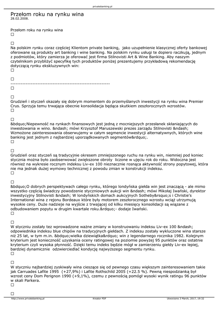 privatebanking.pl Przełom roku na rynku wina 28.02.2008. Przełom roku na rynku wina Na polskim rynku coraz częściej Klientom private banking, jako uzupełnienie klasycznej oferty bankowej oferowane są produkty art banking i wine banking. Na polskim rynku usługi te dopiero raczkują, jednym z podmiotów, który zamierza je oferować jest firma Stilnovisti Art & Wine Banking. Aby naszym czytelnikom przybliżyć specyfikę tych produktów poniżej prezentujemy przykładową rekomendację dotyczącą rynku ekskluzywnych win: ---------------------------------------------------------- Grudzień i styczeń okazały się dobrym momentem do przemyślanych inwestycji na rynku wina Premier Crus. Sprzyja temu trwająca obecnie konsolidacja będąca skutkiem zeszłorocznych wzrostów. „Niepewność na rynkach finansowych jest jedną z mocniejszych przesłanek skłaniających do inwestowania w wino. – mówi Krzysztof Maruszewski prezes zarządu Stilnovisti – Wzmożone zainteresowania obserwujemy w całym segmencie inwestycji alternatywnych, których wine banking jest jednym z najbardziej uporządkowanych segmentów”. Grudzień oraz styczeń są tradycyjnie okresem zmniejszonego ruchu na rynku win, niemniej pod koniec stycznia można było zaobserwować zwiększone obroty liczone w ujęciu rok do roku. Widoczna jest również na wykresie rocznym indeksu Liv-ex 100 nieznacznie rosnąca aktywność strony popytowej, która nie ma jednak dużej wymowy technicznej z powodu zmian w konstrukcji indeksu. „O dobrych perspektywach całego rynku, którego londyńska giełda win jest znaczącą - ale mimo wszystko częścią świadczy powodzenie styczniowych aukcji win – mówi Mikołaj Iwański, dyrektor inwestycyjny Stilnovisti – W londyńskich domach aukcyjnych Sotheby’s i Christie's International wina z rejonu Bordeaux które były motorem zeszłorocznego wzrostu wciąż utrzymują wysokie ceny. Duże nadzieje na wyjście z trwającej od kilku miesięcy konsolidacji są wiązane z odbudowaniem popytu w drugim kwartale roku.”- dodaje Iwański. W styczniu zostały tez wprowadzone ważne zmiany w konstruowaniu indeksu Liv-ex 100 – odpowiednika indeksu blue chipów na tradycyjnych giełdach. Z indeksu zostały wykluczone wina starsze niż 25 lat, w tym m.in. „wielka dziewiątka” win z legendarnego rocznika 1982. Kolejnym kryterium jest konieczność uzyskania oceny ratingowej na poziomie powyżej 95 punktów oraz ostatnie kryterium czyli wysoka płynność. Dzięki temu indeks będzie mógł w zamierzeniu giełdy Liv-ex lepiej, bardziej dynamicznie odzwierciedlać kondycję najwyższego segmentu rynku. W styczniu najbardziej zyskiwały wina cieszące się od pewnego czasu większym zainteresowaniem takie jak Carruades Lafite 1995 (+27,9%) i Lafite Rothschild 2005 (+22.5 %). Pewną niespodzianką był wzrost ceny Dom Perignon 1990 (+9,1%), czemu z pewnością pomógł wysoki wynik ratingu 96 punktów w skali Parkera. http://www.privatebanking.pl Kreator PDF Utworzono 3 March, 2017, 19:32 privatebanking.pl W opinii Jamesa Suckling’a wina z 2005 stają się najbardziej obiecującym z młodych roczników i są wszelkie powody by sądzić, że w dłuższej perspektywie zyska status kultowego. Należy się oczywiście liczyć się już ze stałym zainteresowaniem kupujących w odniesieniu do wszystkich Bordeaux Premier Crus z 2005. Warto też zwrócić uwagę na diagnozę dokonującego się od pewnego czasu procesu przesunięcia konsumenta Bordeaux na wschód. Jancis Robinson w grudniowym komentarzu opisuje wzmożone zainteresowanie deuxieme crus ze strony nabywców z dalekiego wschodu. Dotychczas wina z tej kategorii nie uzyskiwały znacząco wysokich cen, gdyż beneficjentem głównych zysków były wina Bordeaux Premier Crus. Nabywcy z Hong-Kongu, Singapuru czy Chin zwracają jednak uwagę przede wszystkim na cieszący się powodzeniem rocznik, nie różnicując w swoich zakupach dalszej klasyfikacji. Jest to część szerszego procesu, gdyż kapitał dalekowschodni jest obecny na rynku win, gdzie jest inwestowany za pośrednictwem wyspecjalizowanych funduszy. W dużej mierze przyczynia się on do rozwoju rynku i obok rosnącego zainteresowania ze strony inwestorów europejskich i amerykańskich stanowi jeden z filarów kondyscji rynku. Artykuł przygotowano na podstawie informacji prasowej firmy Stilnovisti Art & Wine Banking www.stilnovisti.pl http://www.privatebanking.pl Kreator PDF Utworzono 3 March, 2017, 19:32