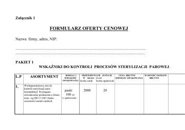 Załącznik 1 FORMULARZ OFERTY CENOWEJ Nazwa firmy, adres, NIP: .................................................................................................................................. ................................................................................................................................. PAKIET 1 WSKAŹNIKI DO KONTROLI PROCESÓW STERYLIZACJI PAROWEJ. L.P 1. ASORTYMENT Wieloparametrowy test do kontroli sterylizacji paraformaldehyd. Wymagane oświadczenie producenta o klasie testu wg ISO 11140 i braku zawartości metali cięŜkich. RODZAJ I WIELKOŚĆ OPAKOWANIA paski 100 szt w opakowaniu PRZEWIDYWANE ZUśYCIE W SKALI 2 LAT liczba sztuk liczba opakowań 2000 20 CENA BRUTTO WARTOŚĆ OGÓŁEM JEDNEGO OPAKOWANIA BRUTTO 2. 3. 4. Wieloparametrowy test do kontroli procesu sterylizacji parą wodną , nietoksyczny, klasy IV wg ISO 11140 lub PN EN ISO 15882. Wymagane oświadczenie producenta o klasie testu wg ISO 11140 i braku zawartości metali cięŜkich 80 1600 16 paski 500 szt w opakowaniu Wskaźnik do kontroli sterylizacji parą wodną klasy VI 100 szt wg ISO 11140-1 nietoksyczny o w opakowaniu parametrach 121 C-15 min., 134 C-5,3 C. Wymagane oświadczenie producenta o klasie testu wg ISO 11140 i braku zawartości metali cięŜkich. Taśma wskaźnikowa z indykatorem parowym dobrze przyklejająca się 19mm x 50mb. Wymagana charakterystyka producenta. 40000 rolki 400 400 5. Taśma wskaźnikowa neutralna dobrze przyklejająca się 19mm x 50mb 6. Sporal ,,S,, Biologiczny test - do kontroli urządzeń na suche gorące powietrze rolki bibułki 40 szt 200 400 200 10 w opakowaniu 7. Sporal ,,A,, Biologiczny test do kontroli urządzeń na parę wodną. bibułki 10 szt. 320 32 w opakowaniu 8. Test biologiczny do kontroli sterylizacji parowej w ampułki autoklawach próŜniowych 0 100 szt. zamawiający temp.121 0 134 C,nadający się do inkubatora w opakowaniu ATTEST TM 3 M.z zadaną temperaturą inkubacji 560C +- 20 C. Czas inkubacji 48 godzin (wymagane określenie czasu zabicia spor w podanym wyŜej przedziale temperatur). 400 4 9. 10. 11 12 Nietoksyczny jednorazowy pakiet Pakiet 1 typu BOWIE-DICK 134 C w czasie 3,5 min. kontrolujący penetrację i jakość pary, symulacja ładunku parowego. Arkusz wskaźnikowy w technologii TST lub równowaŜny. Wymagane potwierdzenie zgodności z EN 867-4 przez niezaleŜną organizację notyfikowanym. Zintegrowany test do kontroli rurki sterylizacji ciepłem suchym . szklane 100 szt. w opakowaniu Wskaźnik kontroli jakości zgrzewa stosowany do rękawów papierowo-foliowych z miejscem na wpisanie protokółu Nietoksyczny wskaźnik wsadu do sterylizacji parą wodną o wartościach 121 C – 15 min. I 134 C – 5,3 min., odpowiadający klasie 6 wg ISO 11140-1, samoprzylepny do stosowania z przyrządem PCD 700 700 1600 16 250 700 3 400 3200 8 13 Przyrząd testowy PCD symulujący pakiet kontrolny wsadu stosowany z powyŜszymi wskaźnikami do sterylizacji parowej 1 2 2 Razem - ..................................... Słownie .................................................................................................................................. Pieczęć firmowa i data Podpis/y/ osoby upełnomocnionej i pieczęć imienna Załącznik 2 FORMULARZ OFERTY CENOWEJ Nazwa firmy, adres, NIP ................................................................................................................................................ ................................................................................................................................................ PAKIET 2 MATERIAŁ DO PAKOWANIA : NARZĘDZI ,OPATRUNKÓW , BIELIZNY W PROCESACH STERYLIZACJI PAROWEJ. L.P 1. 2. 3. ASORTYMENT Papier do sterylizacji biały 750x750 .Zgodny z obowiązującymi normami Papier do sterylizacji zielony750x750 .Zgodny z obowiązującymi normami. Torebki papierowe z fałdą 140x75x250mm ze wskaźnikiem para wodna RODZA J I WIELKOŚĆ OPAKOWANIA arkusze 250 szt. PRZEWIDYWANE ZUśYCIE W SKALI ROKU Liczba sztuk Liczba opakow. 50000 200 w opakowaniu arkusze 250 szt. 50000 200 16000 32 w opakowaniu torebki 500 szt. w opakowaniu CENA BRUTTO JEDNEGO OPAKOWANIA WARTOŚĆ OGÓŁEM BRUTTO 4. 5. 6. Torebki papierowe z torebki 10000 fałdą 110x30x190mm 1000 szt. w opakowaniu ze wskaźnikiem para wodna 50 rolki Rękaw papieroworękaw foliowy 100mb. w opakowaniu z fałdą ,wskaźnik para wodna 300x80x100mm Rękaw papieroworękaw 80 rolek foliowy 200mb. bez fałdy ,wskaźnik para 2 rolki w opak. wodna 150x200mm 7. Rękaw papierowo- 8. foliowy bez fałdy ,wskaźnik para wodna 75x200mm Rękaw papierowofoliowy bez fałdy , wskaźnik para wodna 200x200mm 9. Osłonki na ostrza małych narzędzi o rozmiarze szczeliny 15mm. rękaw 200mb. 10 50 40 100 rolek 25 60 rolek 60 4 rolki w opak. rękaw 200mb. w opakowaniu osłonka 1000 szt w opakowaniu 4000 4 10. Osłonki na ostrza małych narzędzi o rozmiarze szczeliny 30mm. osłonka 1000 szt 4000 4 w opakowaniu Razem ............................... Słownie ........................................................................................................................................................................................ Pieczęć firmowa i data Podpis/y/ osoby upełnomocnionej i pieczęć imienna Załącznik 3 FORMULARZ OFERTY CENOWEJ Nazwa firmy, adres, NIP ................................................................................................................................................... .................................................................................................................................................. PAKIET 3 ELEMENTY DO SYSTEMU DOKUMENTACJI STERYLIZACJI PAROWEJ L.P ASORTYMENT RODZAJ I WIELKOŚĆ OPAKOWANIA PRZEWIDYWANE ZUśYCIE CENA BRUTTO JEDNEGO OPAKOWANIA W SKALI ROKU LICZBA SZTUK LICZBA OPAK. 1. 2. 3. Marker odporny na czynniki sterylizacji parowej do opisywnia pakietów Koperty do archiwizacji dokumentacji procesu sterylizacji Etykiety do metkow