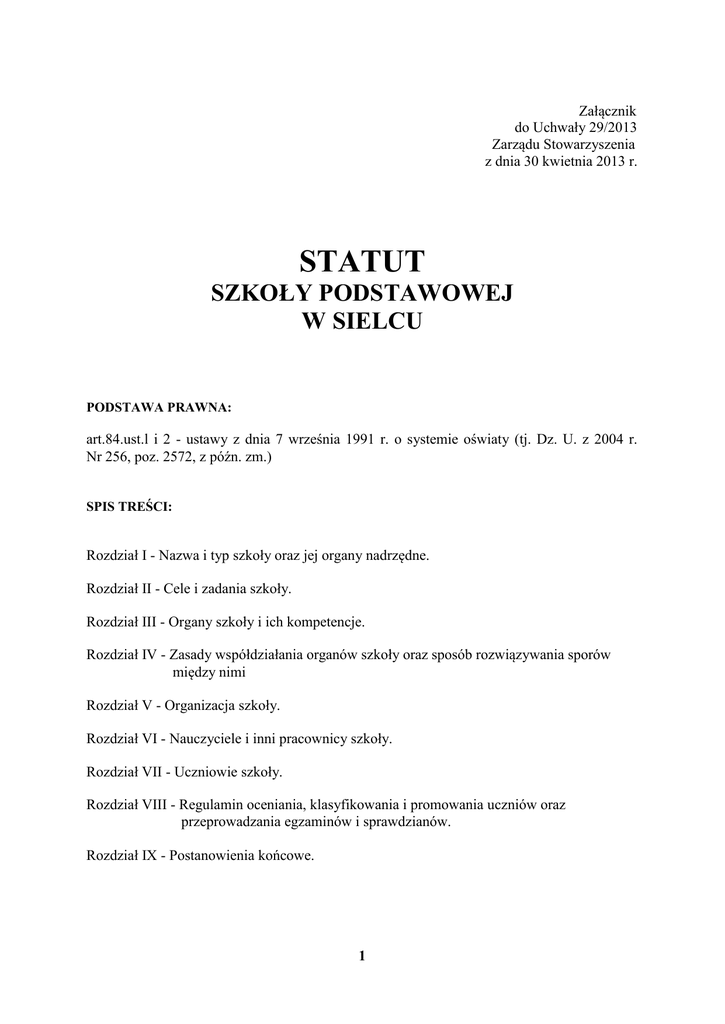 Załącznik do Uchwały 29/2013 Zarządu Stowarzyszenia z dnia 30 kwietnia 2013 r. STATUT SZKOŁY PODSTAWOWEJ W SIELCU PODSTAWA PRAWNA: art.84.ust.l i 2 - ustawy z dnia 7 września 1991 r. o systemie oświaty (tj. Dz. U. z 2004 r. Nr 256, poz. 2572, z późn. zm.) SPIS TREŚCI: Rozdział I - Nazwa i typ szkoły oraz jej organy nadrzędne. Rozdział II - Cele i zadania szkoły. Rozdział III - Organy szkoły i ich kompetencje. Rozdział IV - Zasady współdziałania organów szkoły oraz sposób rozwiązywania sporów między nimi Rozdział V - Organizacja szkoły. Rozdział VI - Nauczyciele i inni pracownicy szkoły. Rozdział VII - Uczniowie szkoły. Rozdział VIII - Regulamin oceniania, klasyfikowania i promowania uczniów oraz przeprowadzania egzaminów i sprawdzianów. Rozdział IX - Postanowienia końcowe. 1 Rozdział I NAZWA I TYP SZKOŁY ORAZ JEJ ORGANY NADRZĘDNE §1 1. Nazwa szkoły brzmi: Szkoła Podstawowa w Sielcu. 2. Siedzibą szkoły jest wieś Sielec. 3. Ilekroć w statucie jest mowa o „szkole”, należy przez to rozumieć Szkołę Podstawową w Sielcu. 4. Szkołę Podstawową w Sielcu prowadzi Leśniowskie Stowarzyszenie OświatowoSamorządowe. 5. Funkcjonowanie szkoły oparte jest na aktywnym uczestnictwie w niej uczniów, rodziców, nauczycieli, pracowników oraz wolontariuszy, którzy tworzą społeczność szkolną. 6. Członkowie społeczności szkolnej uczestniczą w życiu szkoły bezpośrednio oraz poprzez udział swoich przedstawicieli w Radzie Pedagogicznej, Radzie Rodziców i władzach Stowarzyszenia. 7. Nadzór pedagogiczny nad działalnością szkoły sprawuje Lubelski Kurator Oświaty. 8. Cykl kształcenia w szkole trwa 6 lat od klasy I do klasy VI. 9. Szkoła prowadzi oddział przedszkolny. 10. Stowarzyszenie decyduje o istnieniu szkoły oraz materialnych podstawach jej funkcjonowania. 11. Stowarzyszenie zatwierdza projekt budżetu szkoły opracowany przez Dyrektora. 12. Zarząd stowarzyszenia zatrudnia Dyrektora. 13. Szkoła jest szkołą obwodową 14. Obwód szkoły obejmuje miejscowości: Dębina, Kasiłan, Kumów Majoracki, Kumów Plebański i Sielec. Rozdział II CELE I ZADANIA SZKOŁY §2 1. Szkoła realizuje cele i zadania określone w ustawie z dnia 7 września 1991 r. o systemie oświaty (Dz. U z 2004r, Nr 256, poz.2572 z późń. zm.) oraz w rozporządzeniach wykonawczych a w szczególności: 1) zapewnia bezpłatne nauczanie w zakresie ramowych planów nauczania uwzględniających podstawę programową kształcenia ogólnego; 2) umożliwia zdobycie wiedzy i umiejętności niezbędnych do ukończenia szkoły podstawowej i kontynuowanie nauki w gimnazjum; 3) sprawuje opiekę nad uczniami w czasie zajęć lekcyjnych i pozalekcyjnych odpowiednio do ich potrzeb oraz możliwości szkoły; 4) zapewnia uczniom warunki do ich rozwoju, przygotowuje do wypełniania obowiązków rodzinnych i obywatelskich w oparciu o zasady solidarności, demokracji, tolerancji, sprawiedliwości i wolności poprzez: a) właściwą organizację życia społeczności szkolnej, b) czynne uczestnictwo uczniów w różnych formach działalności na terenie szkoły i poza nią, c) udział uczniów we współrządzeniu szkołą, d) organizowanie i uczestnictwo w imprezach, świętach i uroczystościach. 2 2. Szkoła kształtuje właściwe postawy wobec problemów ochrony środowiska. 3. Przygotowuje uczniów do aktywnego uczestnictwa w kulturze, kształtuje wrażliwość na piękno poprzez upowszechnianie kultury teatralnej, kontakt z dziełami sztuki. 4. Kształtuje nawyki uprawiania sportu, turystyki i innych form aktywnego wypoczynku poprzez: prawidłowe organizowanie zajęć wychowania fizycznego, organizowanie wycieczek i życia sportowego (rozgrywki, zawody, rajdy). 5. Szkoła realizuje w ramach zajęć szkolnych naukę religii lub etyki dla uczniów, których rodzice (opiekunowie prawni )wyrażają takie życzenie oraz przygotowanie do życia w rodzinie dla uczniów, których rodzice (opiekunowie prawni) wyrażają zgodę na udział w tych zajęciach 6. Szkoła umożliwia uczniom podtrzymywanie poczucia tożsamości narodowej i religijnej. 7. Szkoła udziela i organizuje pomoc psychologiczno –pedagogiczną uczniom, ich rodzicom oraz nauczycielom. 8. Pomoc udzielana uczniowi oddziale przedszkolnym i szkole polega na rozpoznawaniu i zaspokajaniu indywidualnych potrzeb rozwojowych i edukacyjnych oraz rozpoznawaniu indywidualnych możliwości psychofizycznych ucznia wynikających w szczególności: 1) z niepełnosprawności, 2) z niedostosowania społecznego, 3) z zagrożenia niedostosowaniem społecznym, 4) ze szczególnych uzdolnień, 5) ze specyficznych trudności w uczeniu się, 6) z zaburzeń komunikacji językowej, 7) z choroby przewlekłej, 8) z sytuacji kryzysowych lub traumatycznych, 9) z niepowodzeń edukacyjnych, 10) z zaniedbań środowiskowych związanych z sytuacją bytową ucznia i jego rodziny, sposobem spędzania czasu wolnego oraz kontaktami środowiskowymi, 11) z trudności adaptacyjnych związanych z różnicami kulturowymi lub ze zmianą środowiska edukacyjnego, w tym związanych z wcześniejszym kształceniem za granicą, 9. Pomoc udzielana rodzicom uczniów i nauczycielom polega na wspieraniu rodziców i nauczycieli w rozwiązywaniu problemów wychowawczych i dydaktycznych oraz rozwijaniu ich umiejętności wychowawczych w celu zwiększania efektywności pomocy psychologiczno-pedagogicznej dla uczniów. 10. Korzystanie z pomocy psychologiczno-pedagogicznej jest dobrowolne i nieodpłatne. 11. Pomoc psychologiczno – pedagogiczna jest organizowana i udzielana we współpracy z: 1) rodzicami uczniów, 2) poradniami psychologiczno-pedagogicznymi, w tym poradniami specjalistycznymi, 3) placówkami doskonalenia nauczycieli, 4) innymi szkołami, przedszkolami i placówkami, 5) organizacjami pozarządowymi oraz innymi instytucjami działającymi na rzecz rodziny, dzieci i młodzieży, 12. Pomoc psychologiczno –pedagogiczna jest udzielana z inicjatywy: 1) u