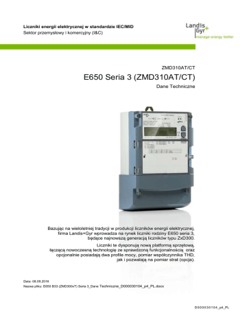 Liczniki energii elektrycznej w standardzie IEC/MID Sektor przemysłowy i komercyjny (I&C) ZMD310AT/CT E650 Seria 3 (ZMD310AT/CT) Dane Techniczne Bazując na wieloletniej tradycji w produkcji liczników energii elektrycznej, firma Landis+Gyr wprowadza na rynek liczniki rodziny E650 seria 3, będące najnowszą generacją liczników typu ZxD300. Liczniki te dysponują nową platformą sprzętową, łączącą nowoczesną technologię ze sprawdzoną funkcjonalnością oraz opcjonalnie posiadają dwa profile mocy, pomiar współczynnika THD, jak i pozwalają na pomiar strat (opcja). Data: 08.09.2016 Nazwa pliku: E650 B33 (ZMD300xT) Seria 3_Dane Techniczne_D000030104_p4_PL.docx D 0 0 0 0 3 0 1 0 4 _p4_PL 2/6 Bezpośrednie liczniki energii elektrycznej rodziny E650 rejestrują energię czynną i bierną, w obu kierunkach i we wszystkich kwadrantach, we wszystkich sieciach trójfazowych czteroprzewodowych i trójprzewodowych. Zakres zastosowań Liczniki rodziny E650 spełniają szeroki zakres wymagań: począwszy od niezawodnych liczników w sektorze komercyjnym, aż do złożonych urządzeń pomiarowych, wyposażonych w dodatkowe funkcje dla celów inteligentnego odczytu danych i elastycznej kontroli taryfowej największych klientów przemysłowych. Modularna komunikacja Liczniki typu AT/CT są wyposażone w wymienne modularne jednostki komunikacyjne, co zapewnia właściwy wybór optymalnych mediów transmisji w każdym momencie. Moduły wykonane w koncepcji «Plug+Play» oferują także pełną swobodę w wyborze stosowanych technologii komunikacyjnych. Pomoc instalacyjna Wskazanie napięć fazowych, kątów fazowych, kierunku wirowania pola oraz kierunku przepływu energii stanowi istotną pomoc podczas instalacji. E650 Seria 3 ZMD310AT/CT – Specyfikacja techniczna Ogólna charakterystyka Dane dotyczące zgodności z MID Napięcie Prąd (dla klasy B) Napięcie znamionowe Un licznika ZMD310xT 3 x 220/380 V do 240/415 V 3 x 110/190 V do 133/230 V Prąd minimalny Imin Zakres napięcia 80% do 115% Un Częstotliwość znamionowa fn Tolerancja 50 lub 60 Hz 2% Prąd maksymalny Imax 0.5, 1.0, 1.5, 2.0 A 40, 60, 80, 100 lub 120 A Prąd wg normy EN 50470-3 ZMD310xT klasa B Charakterystyka pomiarowa Prąd startowy Ist Dane dotyczące zgodności z IEC 0.02, 0.04, 0.06, 0.08 A Ogólna charakterystyka do wyboru: 5, 10, 20 lub 40 A Prąd maksymalny Imax pomiarowy do wyboru: 40, 60, 80, 100 lub 120 A termiczny 120 A Prąd zwarciowy 10 ms 5000 A Dokładność pomiaru ZMD310xT energia czynna, wg IEC 62053-21 klasa 1 energia bierna, wg IEC 62053-23 dokładność 1% Charakterystyka pomiarowa Prąd rozruchu licznika ZMD310xT zgodnie z IEC 0.4% Ib typowy 0.3% Ib Rozruch licznika jest faktycznie uzależniony od mocy rozruchu, a nie od wartości prądu rozruchu. Moc rozruchu dla podłączenia M jednofazowa napięcie znamionowe x prąd rozruchu © Landis+Gyr Prąd przejścia Itr Dokładność pomiaru Częstotliwość Prąd bazowy Ib 0.25, 0.5, 0.75, 1.0 A Charakterystyka działania Zanik napięcia (wyłączenie) czas podtrzymania zgodnie z IEC 0.5 s zachowanie danych po kolejnych około 0.2 s wyłączenie po około 2.5 s Powrót napięcia (załączenie) gotowość do działania przy 3 fazach po 2 s gotowość do działania przy 1 fazie po 5 s detekcja kierunku energii i napięć fazowych po 2 do 3 s Pobór mocy Pobór mocy w obwodach napięciowych (całkowity) przy napięciu fazowym 110 V 240 V moc czynna (typowa) 0.5 W 0.7 W moc pozorna (typowa) 1.0 VA 1.7 VA Pobór mocy na fazę w obwodzie prądowym prąd fazowy 10 A moc czynna (typowa) 0.03 W D000030104_p4_PL – E650 Seria 3 (ZMD310AT/CT) – Dane Techniczne 3/6 Wpływ czynników zewnętrznych Zakres temperatur Pracy Przechowywania wg IEC 62052-11 –40 °C do +70 °C –40 °C do +85 °C Współczynnik temperaturowy błędu W zakresie od -40 °C do +70 °C Wartość średnia (typowa) 0.012 % / °K - przy cos=1 (od 0.05 Ib do Imax) 0.02 % / °K - przy cos=0.5 (od 0.1 Ib do Imax) 0.03 % / °K Szczelność obudowy wg IEC 60529 IP51 Kompatybilność elektromagnetyczna Wyładowania elektrostatyczne wg IEC 61000-4-2 wyładowanie dotykowe 15 kV Zakłócenia przewodzone Zgodnie z CENELEC 2 do 150 kHz TR 50579 Pola elektromagnetyczne RF 80 MHz do 2 GHz wg IEC 61000-4-3 10 i 30 V/m Tłumienie zakłóceń radiowych zgodnie z IEC/CISPR 22 klasa B Szybkie przebiegi przewodzone wg IEC 61000-4-4 obwody prądowe i napięciowe przy obciążeniu zgodnie z IEC 62053-21/23 4 kV obwody pomocnicze o napięciu > 40 V 2 kV Szybkie udary przewodzone wg IEC 61000-4-5 obwody prądowe i napięciowe 4 kV obwody pomocnicze o napięciu > 40 V 1 kV Zewnętrzne pole magnetyczne wg IEC 62053-21/22 detekcja ponadnormatywnego pola zewn. opcja Wytrzymałość izolacji Wytrzymałość izolacji 4 kV przy 50 Hz przez 1 min Impuls napięciowy 1.2/50s Obwody prądowe i napięciowe Obwody pomocnicze wg IEC 62052-11 8 kV 6 kV do 8 6 mm do 8 Wejścia i wyjścia Wejścia sterowania napięcie sterowania US 100 do 240 VAC prąd wejścia < 2 mA rezystancyjny przy 230 VAC długość impulsu synchronizacji czasu >2000 ms Styki wyjściowe rodzaj styk elektroniczny napięcie robocze 12 do 240 VAC/DC maks. prąd 100 mA maks. częstotliwość łączenia (impuls=20ms) 25 Hz Optyczne wyjście testowe rodzaj liczba stała licznika en. czynna i bierna red LED 2 ustawiana wg wyboru Styki przekaźnikowe na płycie rozszerzeń 326x Rodzaj przekaźnik Napięcie 240 VAC Maks. prąd 8A Maks. liczba łączeń przy cos ~1 100.000 Wejścia sterowania na płycie rozszerzeń 326x Napięcie sterowania Us 12 do 24 VDC Prąd wejścia < 6 mA rezystancyjny przy 24 VDC Funkcje dodatkowe od wersji B33 (opcje) Pomiar strat kierunkowych w linii i transformatorze Pomiar całkowitego współczynnika zniekształceń harmonicznych (TTHD) Dwa profile mocy Interfejsy komunikacyjne Interfejs optyczny zgodny z IEC 62056-21 rodzaj szeregowy, dwukierunkowy, półdupleks maks. prędkość transmisji 9600 b/s protokoły IEC 62056-21 i dlms Jednos