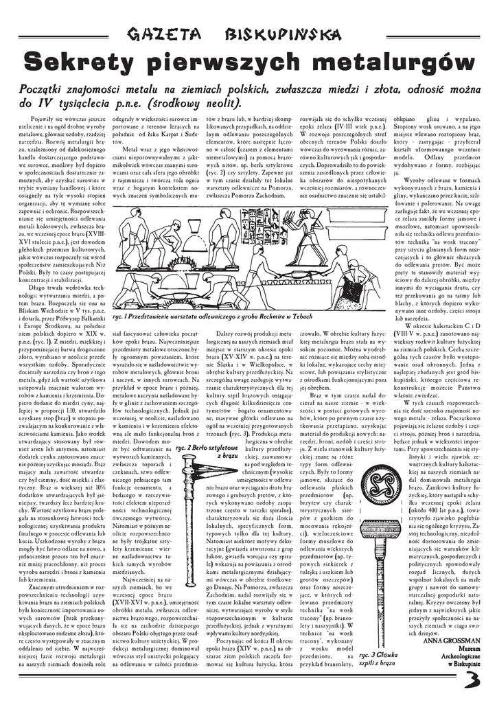 Sekrety pierwszych metalurgów Początki znajomości metalu na ziemiach polskich, zwłaszcza miedzi i złota, odnosić można do IV tysiąclecia p.n.e. (środkowy neolit). Pojawiły się wówczas jeszcze nielicznie i na ogół drobne wyroby metalowe, głównie ozdoby, rzadziej narzędzia. Rozwój metalurgii brą− zu, uzależniony od dalekosiężnego handlu dostarczającego podstawo− we surowce, możliwy był dopiero w społecznościach dostatecznie za− możnych, aby uzyskać surowiec w trybie wymiany handlowej, i które osiągnęły na tyle wysoki stopień organizacji, aby tę wymianę sobie zapewnić i ochronić. Rozpowszech− nianie się umiejętności odlewania metali kolorowych, zwłaszcza brą− zu, we wczesnej epoce brązu (XVIII− XVI stulecie p.n.e.), jest dowodem głębokich przemian kulturowych, jakie wówczas rozpoczęły się wśród społeczeństw zamieszkujących Niż Polski. Były to czasy postępującej koncentracji i stabilizacji. Długo trwała wędrówka tech− nologii wytwarzania miedzi, a po− tem brązu. Rozpoczęła się ona na Bliskim Wschodzie w V tys. p.n.e. i dotarła, przez Półwysep Bałkański i Europę Środkową, na południe ziem polskich dopiero w XIX w. p.n.e. (ryc. 1). Z miedzi, miękkiej i przypominającej barwą drogocenne złoto, wyrabiano w neolicie przede wszystkim ozdoby. Sporadycznie docierały narzędzia czy broń z tego metalu, gdyż ich wartość użytkowa ustępowała znacznie walorom wy− robów z kamienia i krzemienia. Do− piero dodanie do miedzi cyny, naj− lepiej w proporcji 1:10, utwardziło uzyskany stop (brąz) w stopniu po− zwalającym na konkurowanie z wła− ściwościami kamienia. Jako środek utwardzający stosowany był rów− nież arsen lub antymon, natomiast dodatek cynku zastosowano znacz− nie później uzyskując mosiądz. Brąz mający małą zawartość utwardza− czy był ciemny, dość miękki i elas− tyczny. Brąz o większej niż 10% dodatków utwardzających był jaś− niejszy, twardszy lecz bardziej kru− chy. Wartość użytkowa brązu pole− gała na stosunkowej łatwości tech− nologicznej uzyskiwania produktu finalnego w procesie odlewania lub kucia. Uszkodzone wyroby z brązu mogły być łatwo odlane na nowo, a jednocześnie proces ten był znacz− nie mniej pracochłonny, niż proces wyrobu narzędzi i broni z kamienia lub krzemienia. Znacznym utrudnieniem w roz− powszechnieniu technologii uzys− kiwania brązu na ziemiach polskich była konieczność importowania no− wych surowców (brak przekony− wujących danych, że w epoce brązu eksploatowano rodzime złoża), któ− re często występowały w znacznym oddaleniu od siebie. W najwcześ− niejszej fazie rozwoju metalurgii na naszych ziemiach doniosłą rolę odegrały w większości surowce im− portowane z terenów leżących na południe od łuku Karpat i Sude− tów. Metal wraz z jego właściwoś− ciami nieporównywalnymi z jaki− mikolwiek wówczas znanymi suro− wcami oraz cała sfera jego obróbki z tajemniczą i twórczą rolą ognia wraz z bogatym kontekstem no− wych znaczeń symbolicznych mu− tów z brązu lub, w bardziej skomp− likowanych przypadkach, na oddzie− lnym odlewaniu poszczególnych elementów, które następnie łączo− no w całość (czasem z elementami niemetalowymi) za pomocą brązo− wych nitów, np. berła sztyletowe (ryc. 2) czy sztylety. Zapewne już w tym czasie działały też lokalne warsztaty odlewnicze na Pomorzu, zwłaszcza Pomorzu Zachodnim. rozwijała się do schyłku wczesnej epoki żelaza (IV−III wiek p.n.e.). W rozwoju poszczególnych stref obecnych terenów Polski doszło wówczas do wyrównania różnic, za− równo kulturowych jak i gospodar− czych. Doprowadziło to do powięk− szenia zasiedlonych przez człowie− ka obszarów do niespotykanych wcześniej rozmiarów, a równoczes− nie osadnictwo znacznie się ustabil− oblepiano gliną i wypalano. Stopiony wosk usuwano, a na jego miejsce wlewano roztopiony brąz, który − zastygając − przybierał kształt uformowanego wcześnie modelu. Odlany przedmiot wydobywano z formy, rozbijając ją. Wyroby odlewane w formach wykonywanych z brązu, kamienia i gliny, wykańczano przez kucie, szli− fowanie i polerowanie. Na uwagę zasługuje fakt, że we wczesnej epo− ce żelaza zanikły formy jamowe i muszlowe, natomiast upowszech− niła się technika odlewu przedmio− tów techniką “na wosk tracony” przy użyciu glinianych form nisz− czejących i to głównie służących do odlewania prętów. Być może pręty te stanowiły materiał wyj− ściowy do dalszej obróbki, między innymi do wyciągania drutu, czy też przekuwania go na taśmy lub blachy, z których dopiero wyko− nywano inne ozdoby, części stroju ryc. 1 Przedstawienie warsztatu odlewniczego z grobu Rechmira w Tebach lub narzędzia. W okresie halsztackim C i D siał fascynować człowieka począt− Dalszy rozwój produkcji meta− izowało. W obrębie kultury łużyc− (VIII−V w. p.n.e.) zanotowano naj− ków epoki brązu. Najwcześniejsze lurgicznej na naszych ziemiach miał kiej metalurgia brązu stała na wy− większy rozkwit kultury łużyckiej przedmioty metalowe otoczone by− miejsce w starszym okresie epoki sokim poziomie. Można wyodręb− na ziemiach polskich. Cechą szcze− ły ogromnym poważaniem, które brązu (XV−XIV w. p.n.e.) na tere− nić różniące się między sobą ośrod− gólną tych czasów było występo− wyrażało się w naśladownictwie wy− nie Śląska i w Wielkopolsce, w ki lokalne, wykazujące cechy miej− wanie osad obronnych. Jedną z robów metalowych, głównie broni obrębie kultury przedłużyckiej. Na scowe, lub powiązania stylistyczne najlepiej zbadanych jest gród bis− i naczyń, w innych surowcach. Na szczególną uwagę zasługuje wytwa− z ośrodkami funkcjonującymi poza kupiński, którego częściową re− przykład w epoce brązu i później, rzani