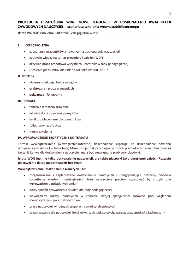 1 PROCEDURA I ZAŁOŻENIA WDN. NOWE TENDENCJE W DOSKONALENIU KWALIFIKACJI ZAWODOWYCH NAUCZYCIELI - scenariusz szkolenia wewnątrzbibliotecznego Beata Walczak, Publiczna Biblioteka Pedagogiczna w Pile I. . CELE SZKOLENIA • zapoznanie uczestników z nową formą doskonalenia nauczycieli • zdobycie wiedzy na temat procedury i założeń WDN • aktywna praca zespołowa wszystkich uczestników rady pedagogicznej • ustalenie planu WDN dla PBP na rok szkolny 2001/2002 II. METODY • słowna - dyskusja, burza mózgów • praktyczna - praca w zespołach • pokazowa - foliogramy III. POMOCE • tablica z tematem szkolenia • arkusze do zapisywania pomysłów • kartki z poleceniami dla uczestników • foliogramy i grafoskop • motto szkolenia IV. WPROWADZENIE TEORETYCZNE DO TEMATU Termin wewnątrzszkolne (wewnątrzbiblioteczne) doskonalenie sugeruje, że doskonalenie powinno odbywać się w szkole ( w bibliotece) Może ono jednak przebiegać w innych placówkach. Termin ten oznacza także, iż kanwą dla doskonalenia nauczycieli mają być wewnętrzne problemy placówki. Istotą WDN jest nie tylko doskonalenie nauczycieli, ale także placówki jako określonej całości. Rozwoju placówki nie da się przeprowadzić bez WDN. Wewnątrzszkolne Doskonalenie Nauczycieli to: • zorganizowane i zaplanowane doskonalenie nauczycieli - uwzględniające potrzeby placówki (określenie wiedzy i umiejętności które nauczyciele powinni opanować by służyły one wprowadzeniu pożądanych zmian) • nowy sposób prowadzenia szkoleń dla rady pedagogicznej • wewnętrzny rozwój nauczycieli w zakresie swojej specjalności zarówno pod względem merytorycznym, jak i metodycznym • praca nauczycieli w różnych zespołach samokształceniowych • organizowanie dla nauczycieli lekcji otwartych, pokazowych, warsztatów, spotkań z fachowcami 2 Założenia WDN 1. WDN jest aktywnym podejściem nauczycieli do rozwiązywania istniejących w placówce problemów i doskonaleniem kwalifikacji zawodowych w takim zakresie , aby "stawić im czoła" 2. Wymaga od nauczycieli poczucia autonomii i zrozumienia. 3. Preferuje dialog i akcentuje zespołowe uczenie się, w którym ważny jest nie tylko efekt, ale i sam proces zmiany osób biorących w nim udział 4. Ma charakter ciągły i nie jest ograniczony w czasie. Trwa dopóty placówka nie rozwiąże swoich problemów. 5. WDN nie wyklucza doskonalenia poza placówką lub w niej, ale z udziałem innych osób: moderatorów, trenerów ekspertów a także we współdziałaniu z nauczycielami z innych placówek. 6. Jeśli nauczyciele będą wykazywali współdziałanie w zespole i dążeniem do zmian, wówczas WDN ma szansę stać się strategią rozwoju placówek Procedura WDN (prezentacja foliogramu) 1. Sformułowanie wymagającego rozwiązania problemu szkoły na podstawie diagnozy istniejącego stanu albo wizji rozwoju 2. Określenie potrzeb szkoleniowych nauczycieli ( zespołowych i indywidualnych( tzn. wiedzy i umiejętności, którą powinni posiąść, uzupełnić lub wzbogacić, aby rozwiązać wybrany problem placówki 3. Opracowanie planu doskonalenia nauczycieli, tzn. ustalenie sposobów zdobycia wiedzy i umiejętności niezbędnych do rozwiązania wybranego problemu 4. Zdobycie przez nauczycieli wiedzy i umiejętności niezbędnych do rozwiązania wybranego problemu -realizacja planu doskonalenia tj. organizacja i przeprowadzenie szkoleń 5. Zastosowanie zdobytej wiedzy i umiejętności do rozwiązania wybranego problemu placówki 6. Ewaluacja efektów rozwiązywania wybranego problemu placówki Argumenty przemawiające za organizowaniem WDN: • WDN pozwala zintegrować nauczycieli wokół wspólnie wypracowanych zadań i razem realizować wyznaczone cele • W centrum uwagi stawia ludzi, którzy tworzą szkołę, gdyż to od nich w głównej mierze zależy realizacja celów i zadań • Orientuje na współdziałanie, dialog, wymianę myśli, wspierając wzajemne zrozumienie, tolerancje, szacunek • Stawia na mocne strony pojedynczych osób i całych zespołów, wyzwalając istniejący w placówce potencjał ludzki Sposoby zdobywania wiedzy i umiejętności w ramach WDN 1. Konferencje samokształceniowe rady pedagogicznej. Temat konferencji powinien wynikać z planu WDN. Może on koncentrować się albo na zdobywaniu przez nauczycieli wiedzy i umiejętności służących rozwiązaniu określonego problemu placówki, albo na wzbogacaniu umiejętności kluczowych z punktu widzenia efektywności doskonalenia kwalifikacji zawodowych w ogóle. Przykładem umiejętności kluczowych może być : współdziałanie w zespole, planowanie własnego rozwoju, zabieranie głosu i dyskutowanie itp. 2. Dyskusje profesjonalne Mogą być prowadzone : w dużych, małych grupach, parach, z udziałem eksperta. Dzielą się ze względu na formę : na dyskusję wielokrotną, panelowa(obserwowaną), metaplan , burzę mózgów 3 3. Obserwacja Np. lekcji, narady, bardziej doświadczonego nauczyciela przez osobę początkującą w zawodzie. Polega na przeprowadzeniu planowego oglądu wykonywania zadań profesjonalnych przez określoną osobę lub grupę osób. 4. Odgrywanie roli "krytycznego przyjaciela" Metoda pracy w parach. Odgrywanie przez nauczycieli wobec członków rady pedagogicznej roli krytycznego przyjaciela. Jest to krytykowanie "po przyjacielsku" inspirujące innych do krytycznego myślenia np. wnikliwego analizowania spraw i działań, kwestionowania zastanych prawd. Krytyczny przyjaciel jest osobą, która po koleżeńsku ,ciepło "zmusza" do uczenia się poprzez analizowanie własnych doświadczeń. Nie daje rad!. Stawia pytania! 5. Hospitacja koleżeńska Hospitujący powinien potrafić : obserwować, odgrywać rolę krytycznego przyjaciela, przekazywać informację zwrotną natomiast hospitowany powinien umieć aktywnie słuchać i odbierać informację zwrotną. Wymaga przygotowania, przeprowadzenia i omówienia 6. Mentoring To udzielenie pomocy przez dośw