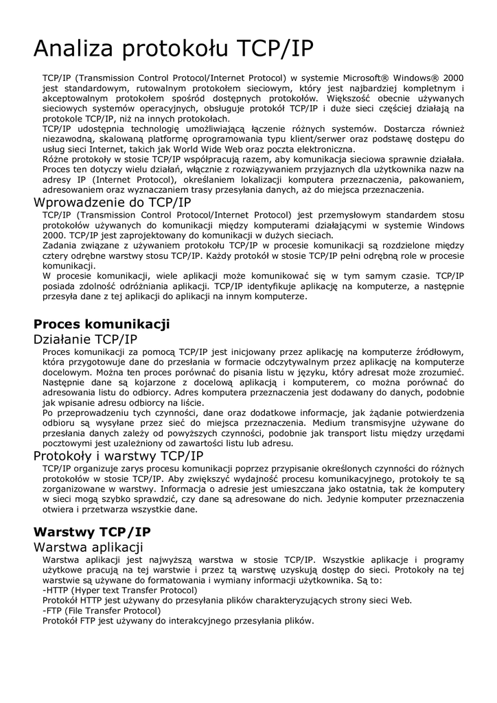 Analiza protokołu TCP/IP TCP/IP (Transmission Control Protocol/Internet Protocol) w systemie Microsoft® Windows® 2000 jest standardowym, rutowalnym protokołem sieciowym, który jest najbardziej kompletnym i akceptowalnym protokołem spośród dostępnych protokołów. Większość obecnie używanych sieciowych systemów operacyjnych, obsługuje protokół TCP/IP i duże sieci częściej działają na protokole TCP/IP, niż na innych protokołach. TCP/IP udostępnia technologię umożliwiającą łączenie różnych systemów. Dostarcza również niezawodną, skalowaną platformę oprogramowania typu klient/serwer oraz podstawę dostępu do usług sieci Internet, takich jak World Wide Web oraz poczta elektroniczna. Różne protokoły w stosie TCP/IP współpracują razem, aby komunikacja sieciowa sprawnie działała. Proces ten dotyczy wielu działań, włącznie z rozwiązywaniem przyjaznych dla użytkownika nazw na adresy IP (Internet Protocol), określaniem lokalizacji komputera przeznaczenia, pakowaniem, adresowaniem oraz wyznaczaniem trasy przesyłania danych, aż do miejsca przeznaczenia. Wprowadzenie do TCP/IP TCP/IP (Transmission Control Protocol/Internet Protocol) jest przemysłowym standardem stosu protokołów używanych do komunikacji między komputerami działającymi w systemie Windows 2000. TCP/IP jest zaprojektowany do komunikacji w dużych sieciach. Zadania związane z używaniem protokołu TCP/IP w procesie komunikacji są rozdzielone między cztery odrębne warstwy stosu TCP/IP. Każdy protokół w stosie TCP/IP pełni odrębną role w procesie komunikacji. W procesie komunikacji, wiele aplikacji może komunikować się w tym samym czasie. TCP/IP posiada zdolność odróżniania aplikacji. TCP/IP identyfikuje aplikację na komputerze, a następnie przesyła dane z tej aplikacji do aplikacji na innym komputerze. Proces komunikacji Działanie TCP/IP Proces komunikacji za pomocą TCP/IP jest inicjowany przez aplikację na komputerze źródłowym, która przygotowuje dane do przesłania w formacie odczytywalnym przez aplikację na komputerze docelowym. Można ten proces porównać do pisania listu w języku, który adresat może zrozumieć. Następnie dane są kojarzone z docelową aplikacją i komputerem, co można porównać do adresowania listu do odbiorcy. Adres komputera przeznaczenia jest dodawany do danych, podobnie jak wpisanie adresu odbiorcy na liście. Po przeprowadzeniu tych czynności, dane oraz dodatkowe informacje, jak żądanie potwierdzenia odbioru są wysyłane przez sieć do miejsca przeznaczenia. Medium transmisyjne używane do przesłania danych zależy od powyższych czynności, podobnie jak transport listu między urzędami pocztowymi jest uzależniony od zawartości listu lub adresu. Protokoły i warstwy TCP/IP TCP/IP organizuje zarys procesu komunikacji poprzez przypisanie określonych czynności do różnych protokołów w stosie TCP/IP. Aby zwiększyć wydajność procesu komunikacyjnego, protokoły te są zorganizowane w warstwy. Informacja o adresie jest umieszczana jako ostatnia, tak że komputery w sieci mogą szybko sprawdzić, czy dane są adresowane do nich. Jedynie komputer przeznaczenia otwiera i przetwarza wszystkie dane. Warstwy TCP/IP Warstwa aplikacji Warstwa aplikacji jest najwyższą warstwa w stosie TCP/IP. Wszystkie aplikacje i programy użytkowe pracują na tej warstwie i przez tą warstwę uzyskują dostęp do sieci. Protokoły na tej warstwie są używane do formatowania i wymiany informacji użytkownika. Są to: -HTTP (Hyper text Transfer Protocol) Protokół HTTP jest używany do przesyłania plików charakteryzujących strony sieci Web. -FTP (File Transfer Protocol) Protokół FTP jest używany do interakcyjnego przesyłania plików. Warstwa transportowa Warstwa transportowa umożliwia uporządkowaną i gwarantowaną komunikację między komputerami oraz przekazuje dane wyżej, do warstwy aplikacji lub niżej, do warstwy internetowej. Warstwa transportowa określa również unikalny identyfikator aplikacji, do której dane są przeznaczone. Warstwa transportowa ma dwa kluczowe protokoły określające metodę dostarczania danych. Są to: -TCP (Transmission Control Protocol) Protokół TCP gwarantuje dostarczenie danych przez potwierdzenie odbioru. -UDP (User Datagram Protocol) Protokół UDP umożliwia szybki transfer danych, lecz bez gwarancji ich dostarczenia. Warstwa internetowa Warstwa internetowa jest odpowiedzialna za adresowanie, pakowanie oraz ruting transmitowanych danych. W warstwie tej znajdują się cztery kluczowe protokoły: -IP (Internet Protocol)Protokół IP jest odpowiedzialny za adresowanie oraz dostarczenie danych do miejsca przeznaczenia. -ARP (Address Resolution Protocol)Protokół ARP jest odpowiedzialny za znalezienie adresu MAC (Media Access Control) karty sieciowej komputera przeznaczenia. -ICMP (Internet Control Message Protocol)Protokół ICMP jest odpowiedzialny za funkcje diagnostyczne i informowanie o błędach z powodu niedostarczenia danych. -IGMP (Internet Group Management Protocol)Protokół IGMP jest odpowiedzialny za zarządzanie grupami multicastowymi w TCP/IP. Warstwa interfejsu sieciowego Warstwa interfejsu sieciowego jest odpowiedzialna za umieszczenie danych w medium transmisyjnym oraz za odbiór danych z medium transmisyjnego. Na tej warstwie znajdują się fizyczne urządzenia, takie jak karty sieciowe i okablowanie. Karta sieciowa posiada unikalny, 12-to znakowy heksadecymalny numer, np. B5-50-04-22-D4-65, znany jako adres MAC. Warstwa interfejsu sieciowego nie zawiera programowych protokołów, jak pozostałe trzy warstwy, lecz zawiera protokoły takie, jak Ethernet czy ATM (Asynchronous Transfer Mode), określające sposób transmisji danych przez sieć. Identyfikacja aplikacji Adres IP, Port TCP/UDP, Gniazdo Aby komunikacja sieciowa mogła się rozpocząć, lokalizacja komputera źródłowego oraz docelowego w sieci musi być znana. Lokalizacja jest określana przez unikaln