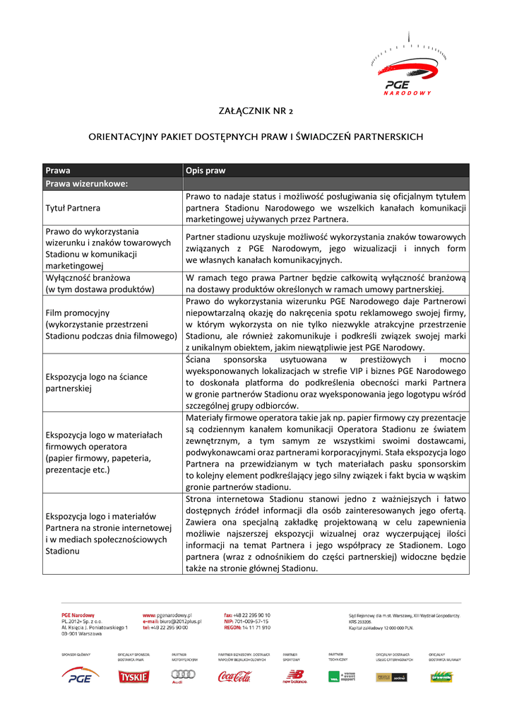 Prawa Prawa wizerunkowe: Tytuł Partnera Prawo do wykorzystania wizerunku i znaków towarowych Stadionu w komunikacji marketingowej Wyłączność branżowa (w tym dostawa produktów) Opis praw Prawo to nadaje status i możliwość posługiwania się oficjalnym tytułem partnera Stadionu Narodowego we wszelkich kanałach komunikacji marketingowej używanych przez Partnera. Partner stadionu uzyskuje możliwość wykorzystania znaków towarowych związanych z PGE Narodowym, jego wizualizacji i innych form we własnych kanałach komunikacyjnych. W ramach tego prawa Partner będzie całkowitą wyłączność branżową na dostawy produktów określonych w ramach umowy partnerskiej. Prawo do wykorzystania wizerunku PGE Narodowego daje Partnerowi Film promocyjny niepowtarzalną okazję do nakręcenia spotu reklamowego swojej firmy, (wykorzystanie przestrzeni w którym wykorzysta on nie tylko niezwykle atrakcyjne przestrzenie Stadionu podczas dnia filmowego) Stadionu, ale również zakomunikuje i podkreśli związek swojej marki z unikalnym obiektem, jakim niewątpliwie jest PGE Narodowy. Ściana sponsorska usytuowana w prestiżowych i mocno wyeksponowanych lokalizacjach w strefie VIP i biznes PGE Narodowego Ekspozycja logo na ściance to doskonała platforma do podkreślenia obecności marki Partnera partnerskiej w gronie partnerów Stadionu oraz wyeksponowania jego logotypu wśród szczególnej grupy odbiorców. Materiały firmowe operatora takie jak np. papier firmowy czy prezentacje są codziennym kanałem komunikacji Operatora Stadionu ze światem Ekspozycja logo w materiałach zewnętrznym, a tym samym ze wszystkimi swoimi dostawcami, firmowych operatora podwykonawcami oraz partnerami korporacyjnymi. Stała ekspozycja logo (papier firmowy, papeteria, Partnera na przewidzianym w tych materiałach pasku sponsorskim prezentacje etc.) to kolejny element podkreślający jego silny związek i fakt bycia w wąskim gronie partnerów stadionu. Strona internetowa Stadionu stanowi jedno z ważniejszych i łatwo dostępnych źródeł informacji dla osób zainteresowanych jego ofertą. Ekspozycja logo i materiałów Zawiera ona specjalną zakładkę projektowaną w celu zapewnienia Partnera na stronie internetowej możliwie najszerszej ekspozycji wizualnej oraz wyczerpującej ilości i w mediach społecznościowych informacji na temat Partnera i jego współpracy ze Stadionem. Logo Stadionu partnera (wraz z odnośnikiem do części partnerskiej) widoczne będzie także na stronie głównej Stadionu. Ekspozycja logo i materiałów Partnera na ekranach digital signage Obecność w aplikacji stadionowej Na promenadach oraz wewnątrz pomieszczeń Stadionu zainstalowane zostało ponad 250 ekranów LCD, które wykorzystywane są do komunikacji z kibicami i gośćmi stadionu. Ekrany te mogą zostać podzielone na poszczególne strefy, jak i działać indywidualnie. Istnieje również możliwość dowolnej konfiguracji wyświetlanych treści w zależności od potrzeby i profilu przekazywanych informacji. Nowa platforma komunikacji z gośćmi PGE Narodowego wprowadzana przez Spółkę pozwoli nie tylko docierać z treściami informacyjnopromocyjnymi do osób bezpośrednio zainteresowanych ofertą Stadionu i jego partnerów, ale przede wszystkim angażować ich w działania i zachęcać do aktywności - zarówno podczas dużych wydarzeń, jak i w dni powszednie - w formie konkursów, gier, dzielenia się zdjęciami czy zbierania punktów wymiennych na nagrody. Możliwości są nieograniczone. Prawa promocyjno-reklamowe, w tym brandingowe: Branding promenad wewnętrznych - billboardy Branding okienek w kioskach gastronomicznych Branding kubków wielorazowych Branding strojów pracowników kiosków gastronomicznych (koszulki, czapki) Inne nośniki brandingowe Partnera Miejsca przeznaczone na zamieszczenie billboardów na promenadach Stadionu przewidziane zostały z myślą dotarcia z komunikatem do możliwie najszerszej liczby odbiorców. Ich lokalizacje zostały zaplanowane wzdłuż głównych ciągów komunikacyjnych wewnątrz Stadionu oraz w bezpośrednim sąsiedztwie kiosków gastronomicznych. Organizacja imprez masowych niesie ze sobą konieczność zapewnienia uczestnikom zaplecza gastronomicznego. 30 kiosków gastronomicznych zlokalizowanych na dwóch poziomach stadionu to miejsca cechujące się niezwykle wysokim poziomem koncentracji gości Stadionu podczas imprez masowych. Dzięki temu powierzchnie znajdujące się w bezpośrednim otoczeniu kiosków gastronomicznych są niezwykle atrakcyjnymi lokalizacjami z perspektywy komunikacji z konsumentem. Do doprecyzowania przez Strony w trakcie negocjacji - istnieje możliwość wprowadzenia do kiosków gastronomicznych obrandowanych przez Partnera kubków na napoje; koszty projektu, produkcji, montażu, utrzymania i demontażu nośników po stronie Partnera. Kilkunastu pracowników obsługi gastronomicznej znajdujących się w każdym z 30 kiosków to grupa, która ma bezpośredni kontakt z większością osób biorących udział w imprezie na Stadionie. Możliwość eksponowania swojej marki poprzez obrandowanie ich strojów jest okazją do bezpośredniego dotarcia do odbiorców z określonym komunikatem. Pozostajemy otwarci na pomysły naszych Partnerów - zarówno w kwestii nośników brandingowych, jak i aktywacji angażujących gości Stadionu. Akcje promocyjne, informacyjne, samplingowe, społecznościowe Merchandising - stworzenie specjalnej linii produktowej inspirowanej Stadionem Różnorodność imprez organizowanych na Stadionie Narodowym oraz szeroki wachlarz możliwości, które daje jego infrastruktura umożliwia bezpośrednią komunikację z bardzo różnymi grupami docelowymi. Starannie zaplanowane akcje promocyjne pozwolą partnerom nie tylko na zakomunikowanie swojej obecności i związku ze Stadionem, ale również na dotarcie ze sprecyzowanym komunikatem mającym na celu realizację celów biznesowych. PGE Narodowy to niepowtarzalna przestr