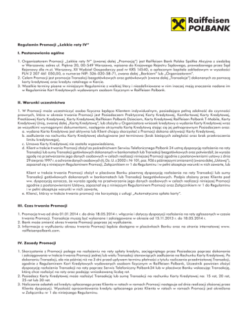 Regulamin Promocji „Lekkie raty IV” I. Postanowienia ogólne 1. Organizatorem Promocji „Lekkie raty IV” (zwanej dalej „Promocją”) jest Raiffeisen Bank Polska Spółka Akcyjna z siedzibą w Warszawie; adres ul. Piękna 20, 00-549 Warszawa, wpisana do Krajowego Rejestru Sądowego, prowadzonego przez Sąd Rejonowy dla m.st. Warszawy, XII Wydział Gospodarczy pod nr KRS 14540, o opłaconym kapitale zakładowym w wysokości PLN 2 207 461 050,00, o numerze NIP: 526-020-58-71, zwana dalej „Bankiem” lub „Organizatorem”. 2. Celem Promocji jest promocja Transakcji bezgotówkowych oraz gotówkowych (zwane dalej „Transakcje”) dokonanych za pomocą karty kredytowej oraz kredytu ratalnego w Karcie. 3. W szelkie terminy pisane w niniejszym Regulaminie z wielkiej litery i niezdefiniowane w nim inaczej mają znaczenie nadane im w Regulaminie Kart Kredytowych wydawanym osobom fizycznym w Raiffeisen Polbank. II. Warunki uczestnictwa 1. W Promocji może uczestniczyć osoba fizyczna będąca Klientem indywidualnym, posiadająca pełną zdolność do czynności prawnych, która w okresie trwania Promocji jest Posiadaczem Praktycznej Karty Kredytowej, Komfortowej Karty Kredytowej, Prestiżowej Karty Kredytowej, Karty Kredytowej Raiffeisen Polbank Dzieciom, Karty Kredytowej Raiffeisen Polbank T-Mobile, Karty Kredytowej Uniq, zwanej dalej „Kartą Kredytową”, lub złożyła u Organizatora wniosek kredytowy o wydanie Karty Kredytowej wraz ze wszystkimi wymaganymi dokumentami, następnie otrzymała Kartę Kredytową stając się jej pełnoprawnym Posiadaczem oraz: a. wydana Karta Kredytowa jest aktywna lub Klient chcący skorzystać z Promocji dokona aktywacji Karty Kredytowej, b. zadłużenie na rachunku Karty Kredytowej obsługiwane jest terminowo (brak bieżących zaległości oraz brak przekroczenia limitu kredytowego), c. Umowa Karty Kredytowej nie została wypowiedziana, d. Klient w trakcie trwania Promocji złożył za pośrednictwem Serwisu Telefonicznego Polbank 24 ustną dyspozycję rozłożenia na raty Transakcji lub sumy Transakcji gotówkowych dokonanych w bankomatach lub Transakcji bezgotówkowych oraz potwierdził, że wyraża zgodę na przetwarzanie jego danych osobowych w celach realizacji niniejszej Promocji zgodnie z postanowieniami ustawy z dnia 29 sierpnia 1997 r. o ochronie danych osobowych (tj. Dz. U. z 2002 r. Nr 101, poz. 926 z późniejszymi zmianami) (zwana dalej „Ustawą”), zapoznał się z niniejszym Regulaminem Promocji, Załącznikiem nr 1 do Regulaminu i w pełni akceptuje warunki w nich zawarte, lub Klient w trakcie trwania Promocji złożył w placówce Banku pisemną dyspozycję rozłożenia na raty Transakcji lub sumy Transakcji gotówkowych dokonanych w bankomatach lub Transakcji bezgotówkowych. Podpis złożony przez Klienta pod ww. dyspozycją oznacza, że wyraża zgodę na przetwarzanie jego danych osobowych w celach realizacji niniejszej Promocji zgodnie z postanowieniami Ustawy, zapoznał się z niniejszym Regulaminem Promocji oraz Załącznikiem nr 1 do Regulaminu i w pełni akceptuje warunki w nich zawarte, e. Klienci, którzy w trakcie trwania promocji nie korzystają z usługi „Automatyczna spłata karty”. III. Czas trwania Promocji 1. Promocja trwa od dnia 01.01.2014 r. do dnia 18.05.2014 r. włącznie i dotyczy dyspozycji rozłożenia na raty zgłoszonych w czasie trwania Promocji. Transakcje muszą być wykonane i zaksięgowane w okresie od 15.11.2013 r. do 18.05.2014 r. 2. Bank może zmienić okres trwania Promocji poprzez jej wydłużenie. 3. Informacja o wydłużeniu okresu trwania Promocji będzie dostępna w placówkach Banku oraz na stronie internetowej www. raiffeisenpolbank.com. IV. Zasady Promocji 1. S korzystanie z Promocji polega na rozłożeniu na raty spłaty kredytu, zaciągniętego przez Posiadacza poprzez dokonanie i zaksięgowanie w trakcie trwania Promocji jednej lub wielu Transakcji stanowiących zadłużenie na Rachunku Karty Kredytowej. Po dokonaniu Transakcji, ale nie później niż na 3 dni przed upływem terminu płatności z tytułu rozliczenia przedmiotowej Transakcji, zgodnie z Regulaminem Kart Kredytowych wydawanych osobom fizycznym w Raiffeisen Polbank, Uczestnik powinien złożyć dyspozycję rozłożenia Transakcji na raty poprzez Serwis Telefoniczny Polbank24 lub w placówce Banku wskazując Transakcję, którą chce rozłożyć na raty oraz podając wnioskowaną liczbę rat. 2. P osiadacz Karty Kredytowej może rozłożyć Transakcję lub sumę Transakcji na rachunku Karty Kredytowej na: 15 rat, 20 rat, 25 rat lub 30 rat. 3. Naliczanie odsetek od kredytu spłacanego przez Klienta w ratach w ramach Promocji następuje od dnia realizacji złożonej przez Klienta dyspozycji. Wysokość oprocentowania kredytu spłacanego przez Klienta w ratach w ramach Promocji jest określona w Załączniku nr 1 do niniejszego Regulaminu. 4. Raty z tytułu spłaty kredytu spłacanego przez Klienta w ratach, w ramach Promocji zwiększają saldo zadłużenia wskazane na wyciągu. 5. Naliczanie odsetek od kredytu spłacanego przez Klienta w ratach w ramach Promocji następuje zgodnie z Umową Karty Kredytowej od realizacji złożonej przez Klienta dyspozycji. Dyspozycja realizowana jest przez Bank w ciągu dwóch dni roboczych. Wysokość oprocentowania kredytu spłacanego przez Klienta w ratach w ramach Promocji jest określona w Załączniku nr 1 do niniejszego Regulaminu. 6. W przypadku Transakcji gotówkowych, prowizja za wypłatę gotówki z bankomatu jest naliczana zgodnie z obowiązującą Tabelą Opłat i Limitów Karty Kredytowej. Do czasu rozłożenia Transakcji gotówkowej na raty, odsetki od tej Transakcji naliczane są zgodnie z Umową Karty Kredytowej, prowizja za wypłatę gotówki z bankomatu i odsetki zmniejszają dostępny Limit Kredytowy. 7. Minimalna kwota Transakcji lub sumy Transakcji, którą Klient może rozłożyć na raty, wynosi 500 PLN. Wartość każdej, pojedynczej transakcji składającej